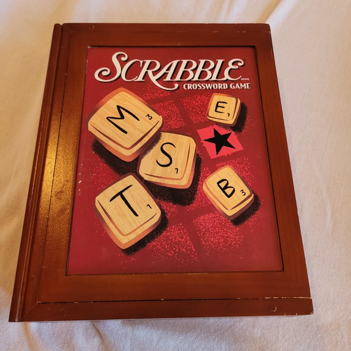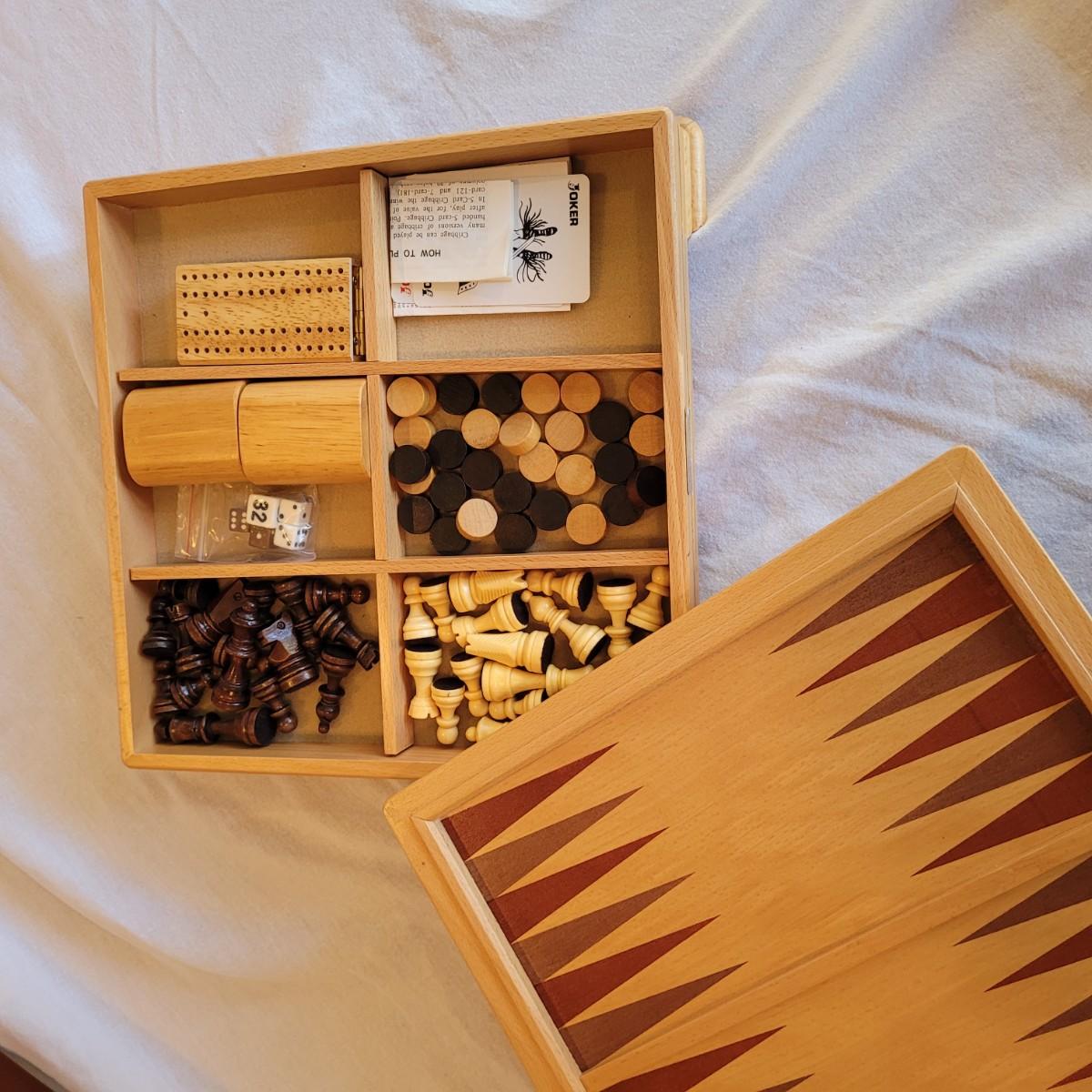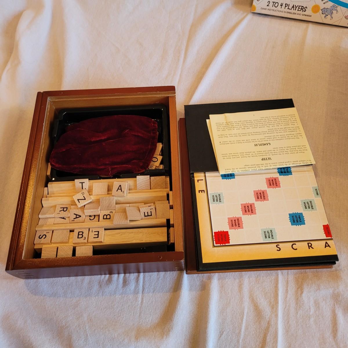 Scrabble is a nice wooden boxed version. Chess and Checkers is on a wooden box including a few other games. The memory game is still sealed, as is the Chicago puzzle. One set of playing cards is in a very nice wooden box with floral print fabric. All pieces and parts appear to be present.