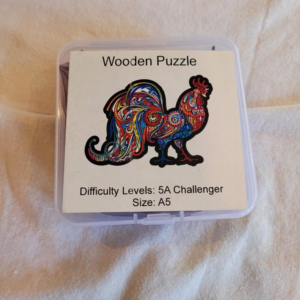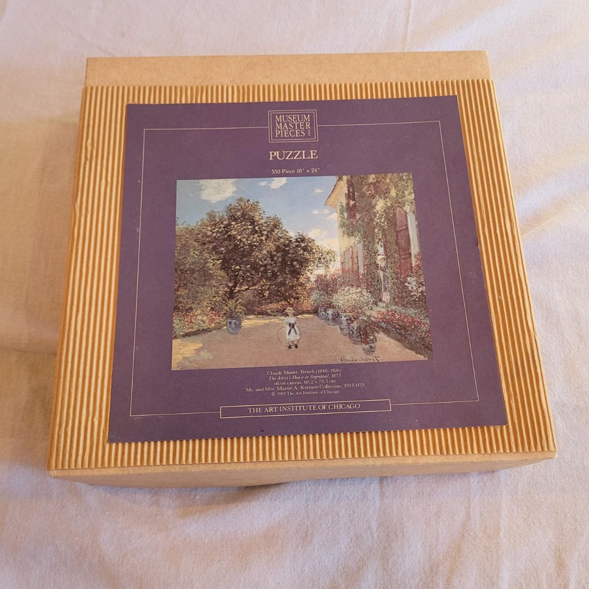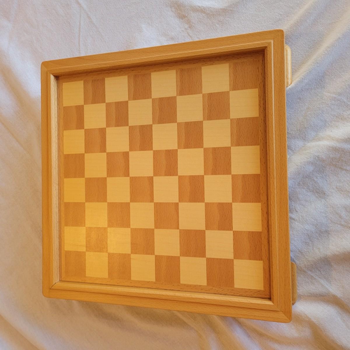 Scrabble is a nice wooden boxed version. Chess and Checkers is on a wooden box including a few other games. The memory game is still sealed, as is the Chicago puzzle. One set of playing cards is in a very nice wooden box with floral print fabric. All pieces and parts appear to be present.