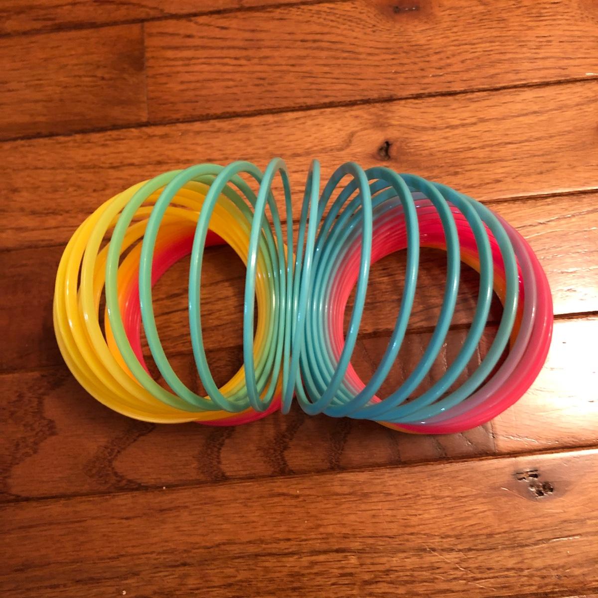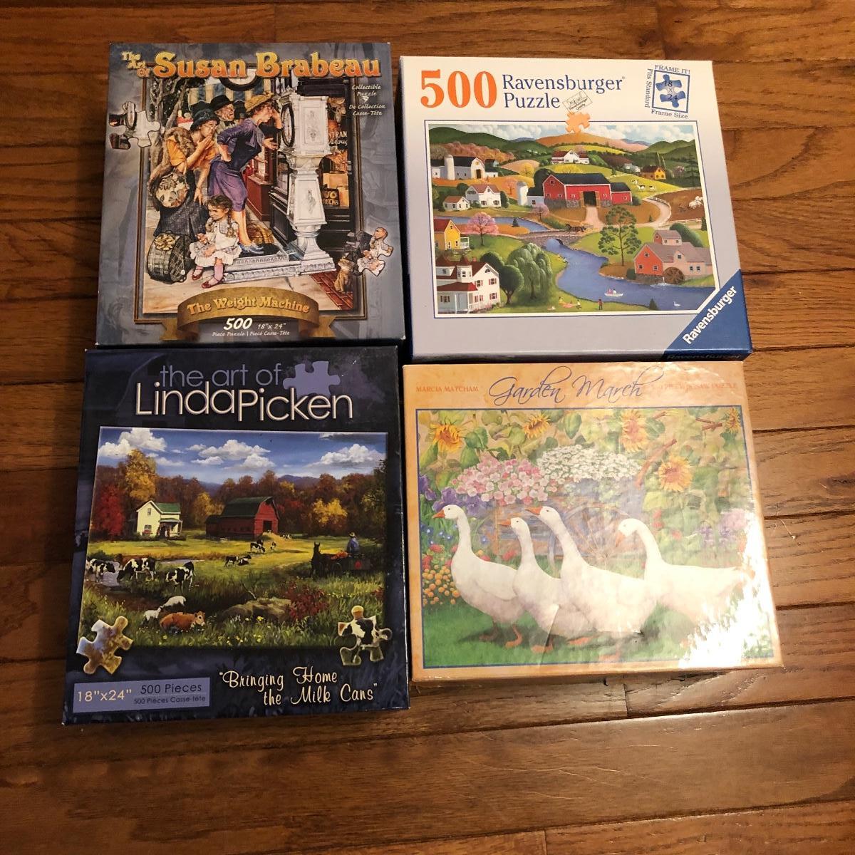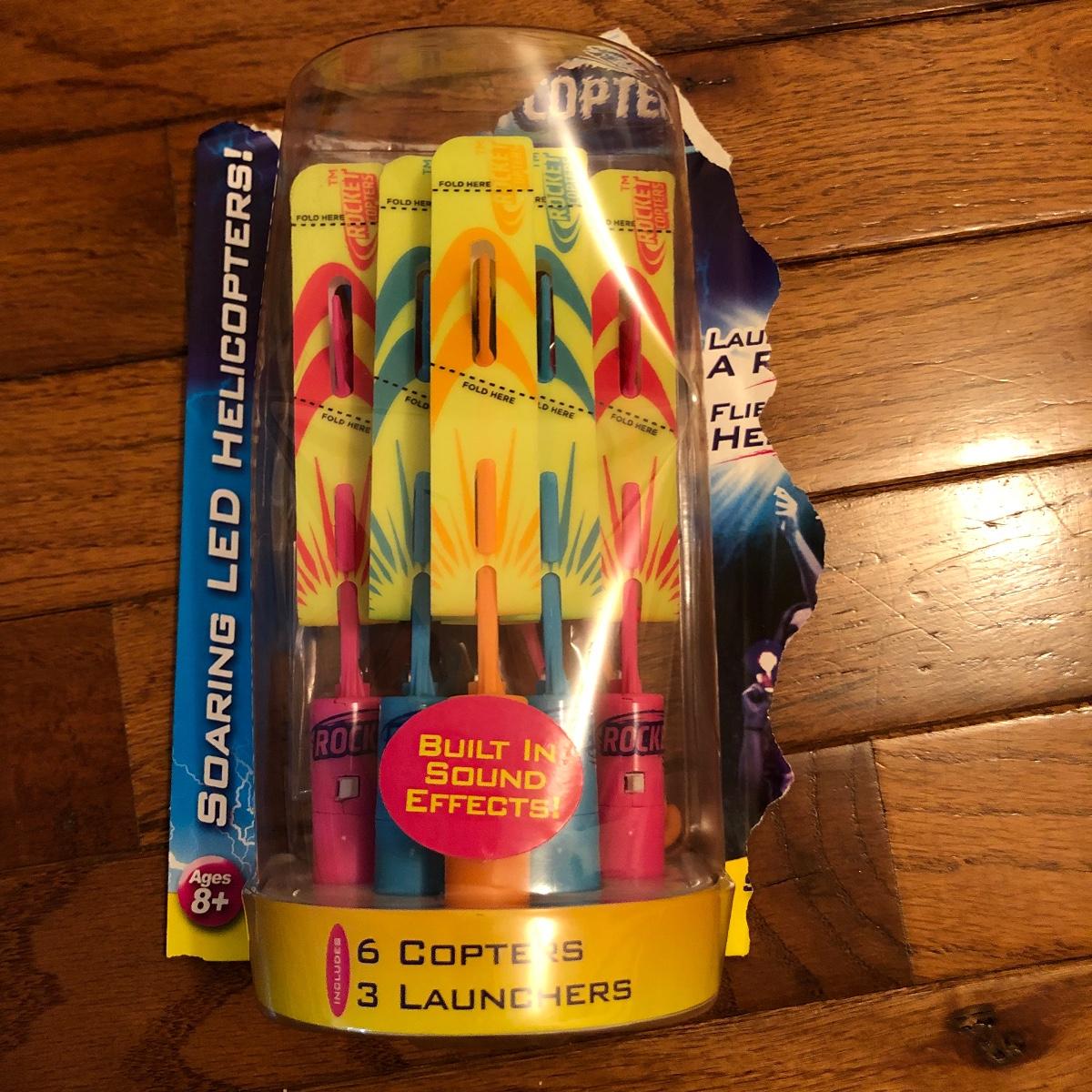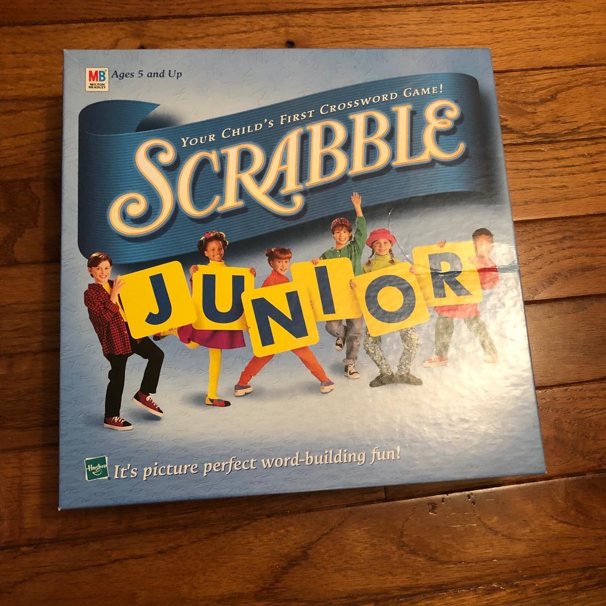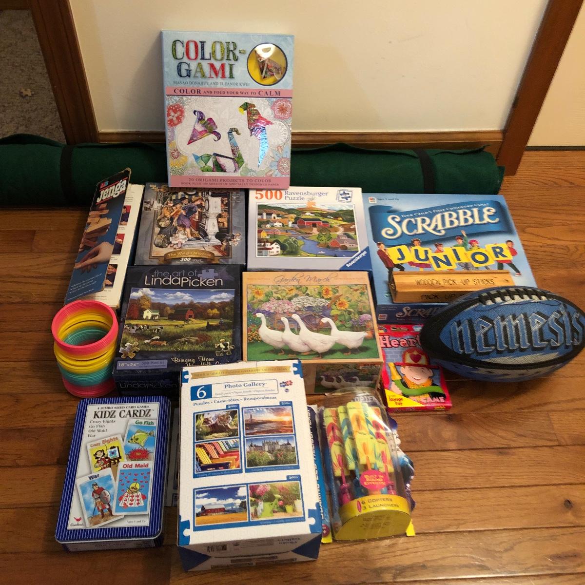 Lot includes Scrabble Junior, Color-Gami, Jenga, Slinky, Soaring LED helicopters, five puzzles and a puzzle mat. Mat measures 36” x 47”.