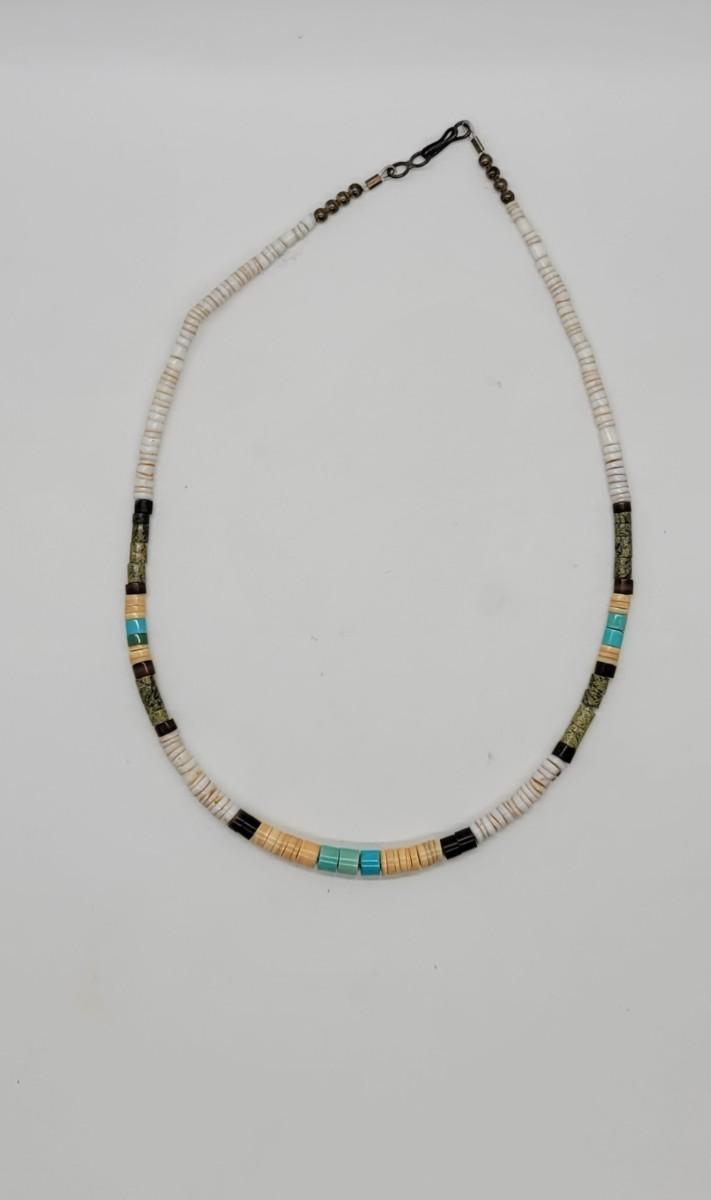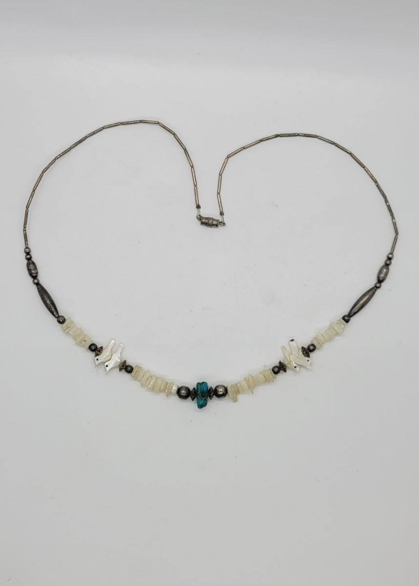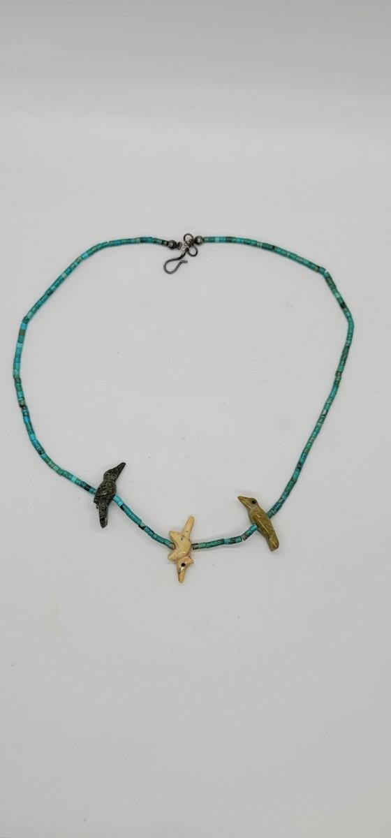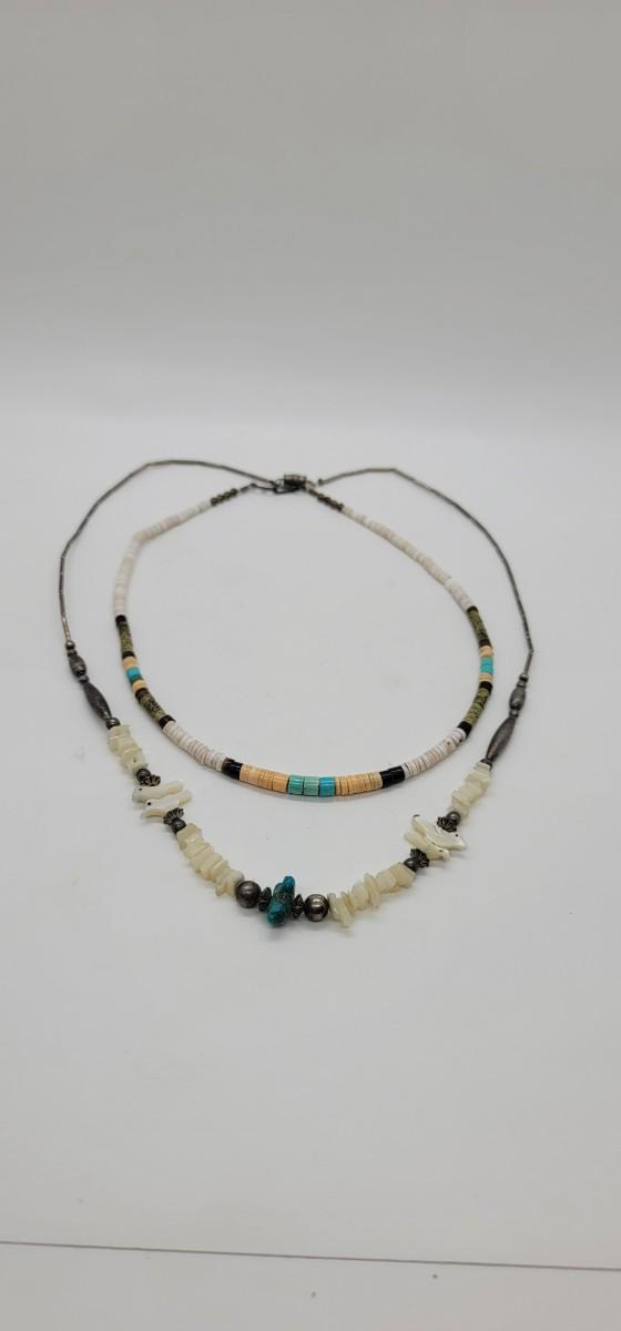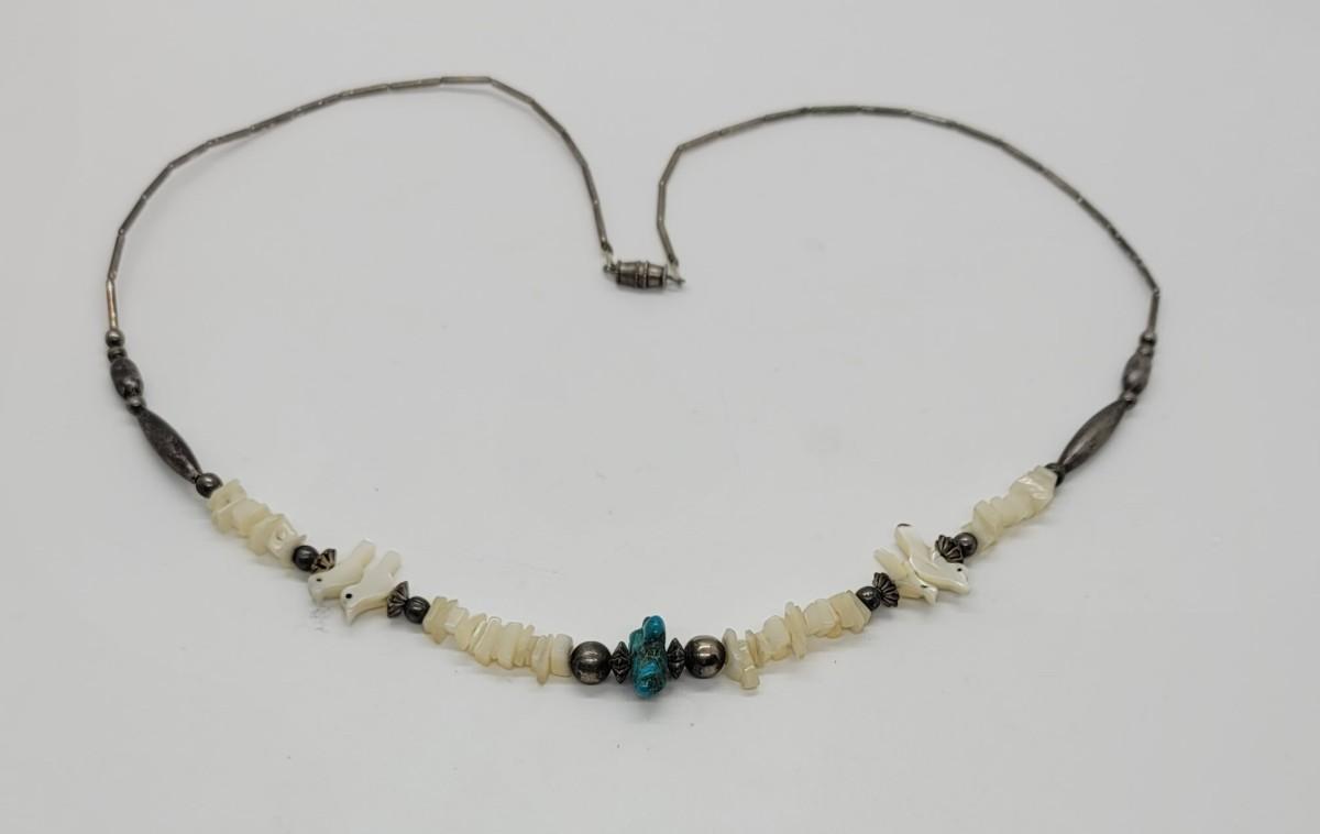 Choker and turquoise bead fetish are 15" l and the silver and mother of pearl beads with the turquoise nugget center is 20" l.