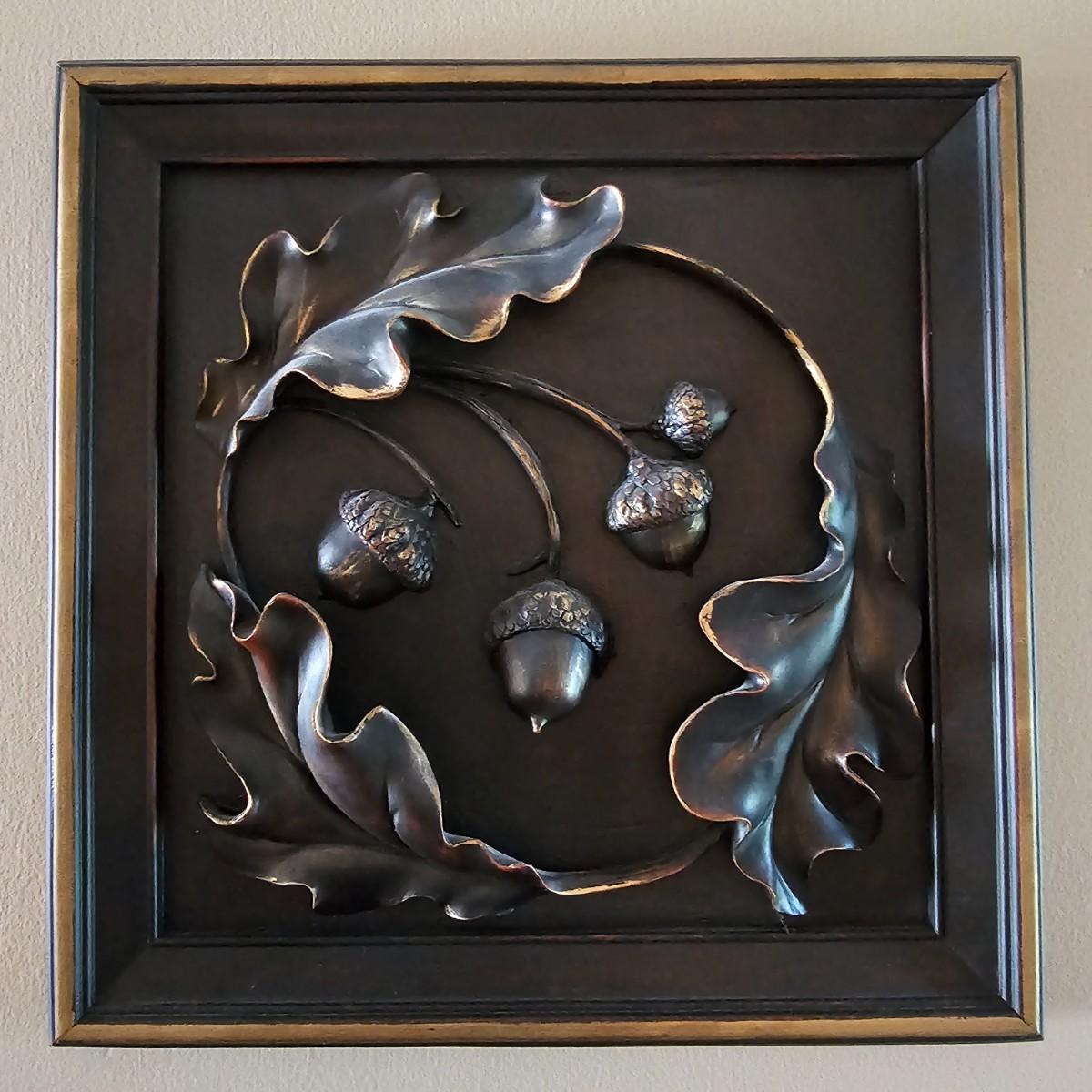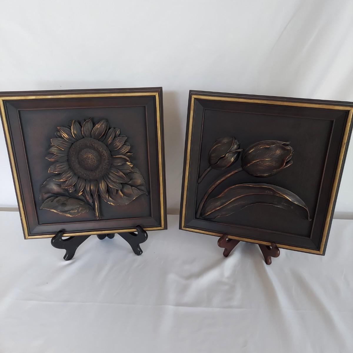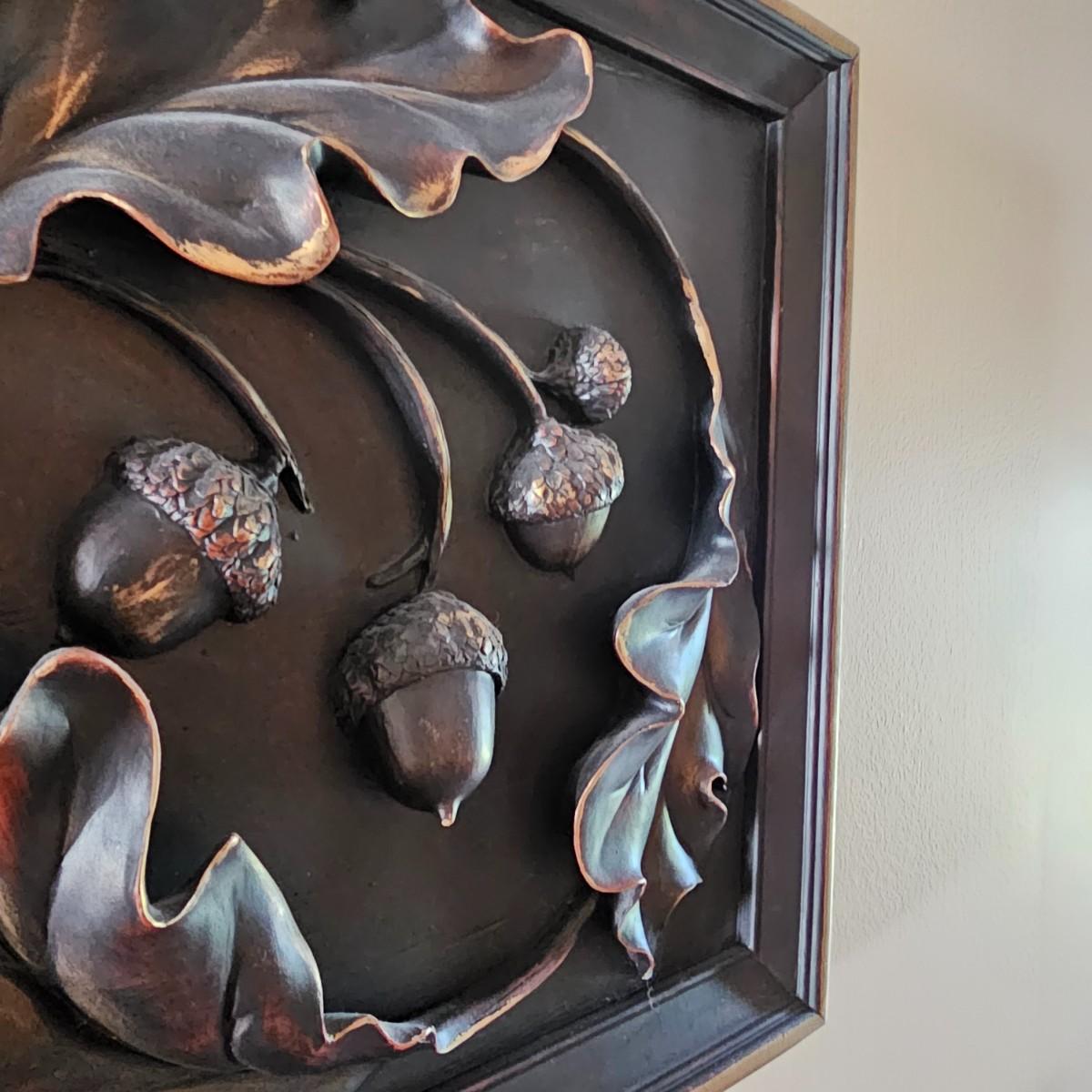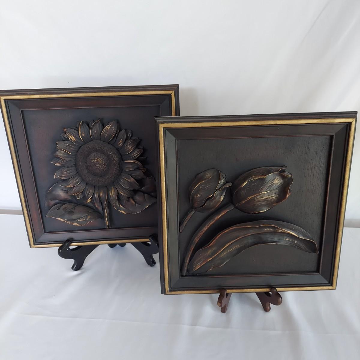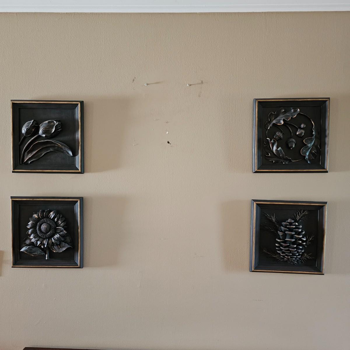 A set of four sculpted resin plaques suitable for indoors or out. Items made by Pygmalion, all are 12" Sq and represent the four seasons. Dark color relief with gold accents/highlights. See photos for details. Shipping available.