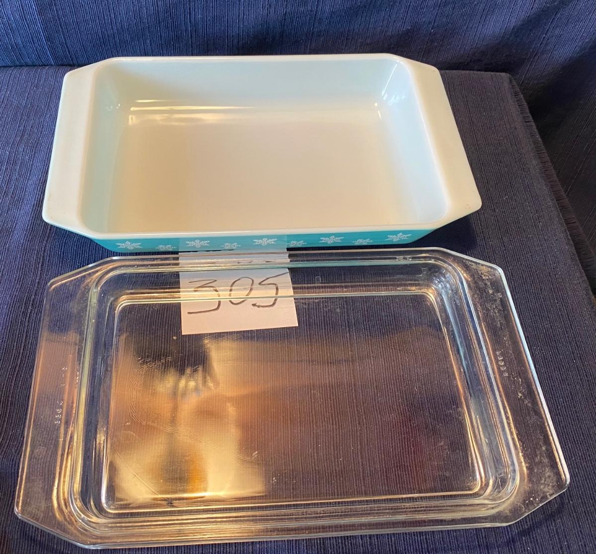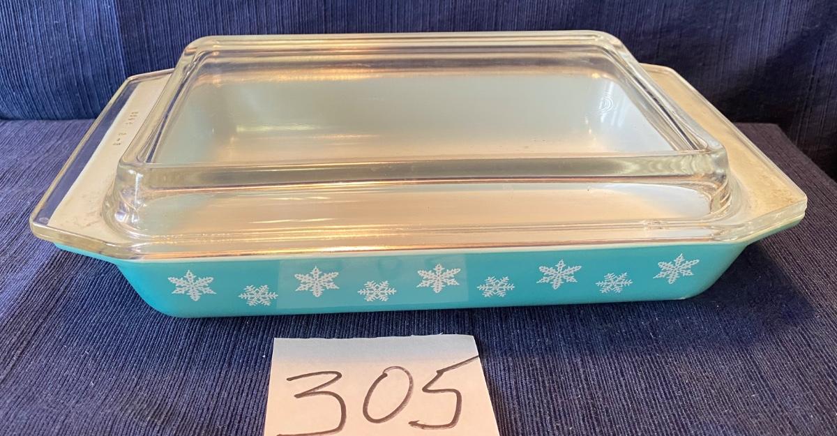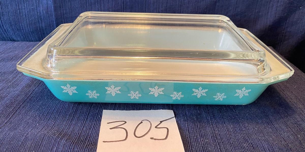 Pyrex #143 Turquoise Snoflake Dish w/lid