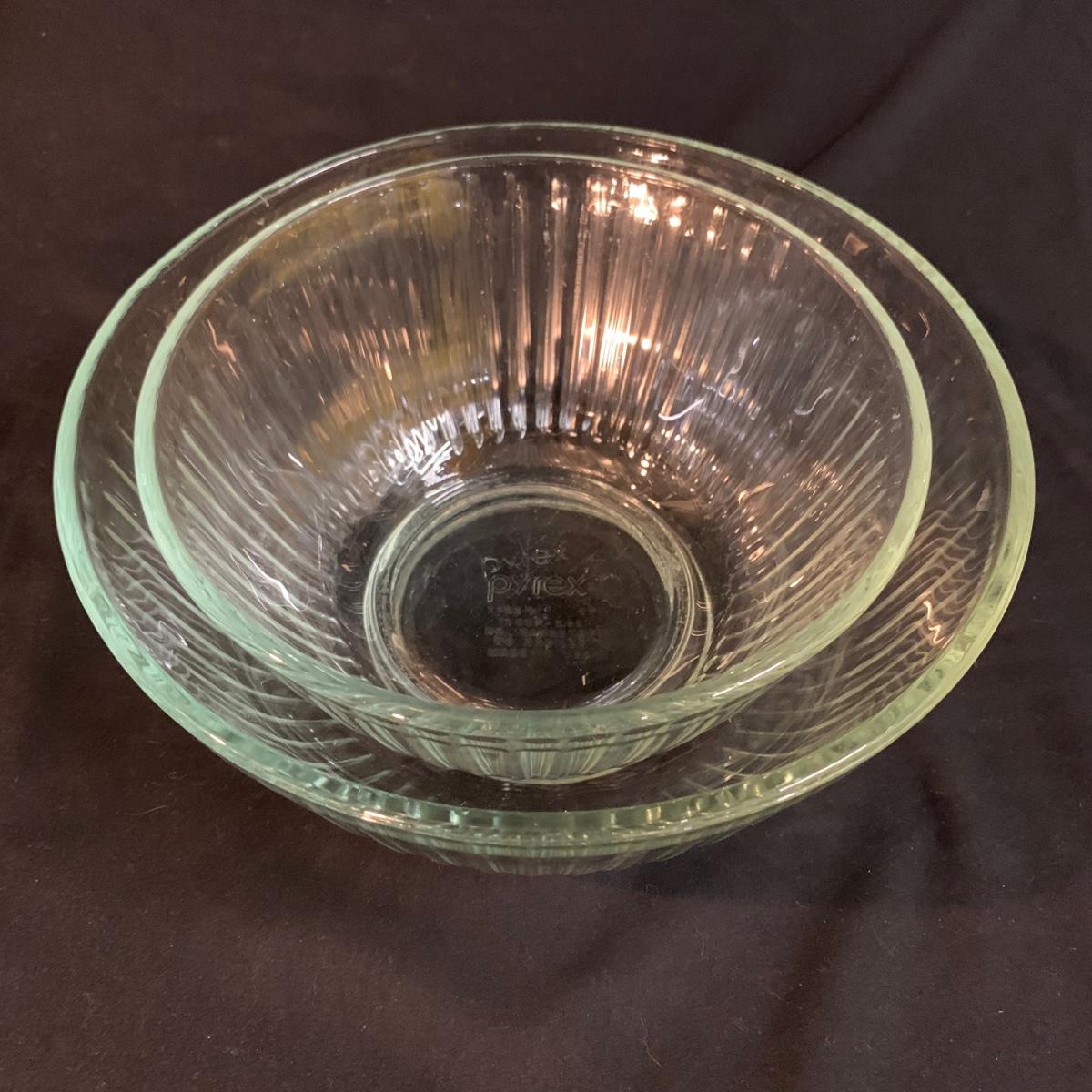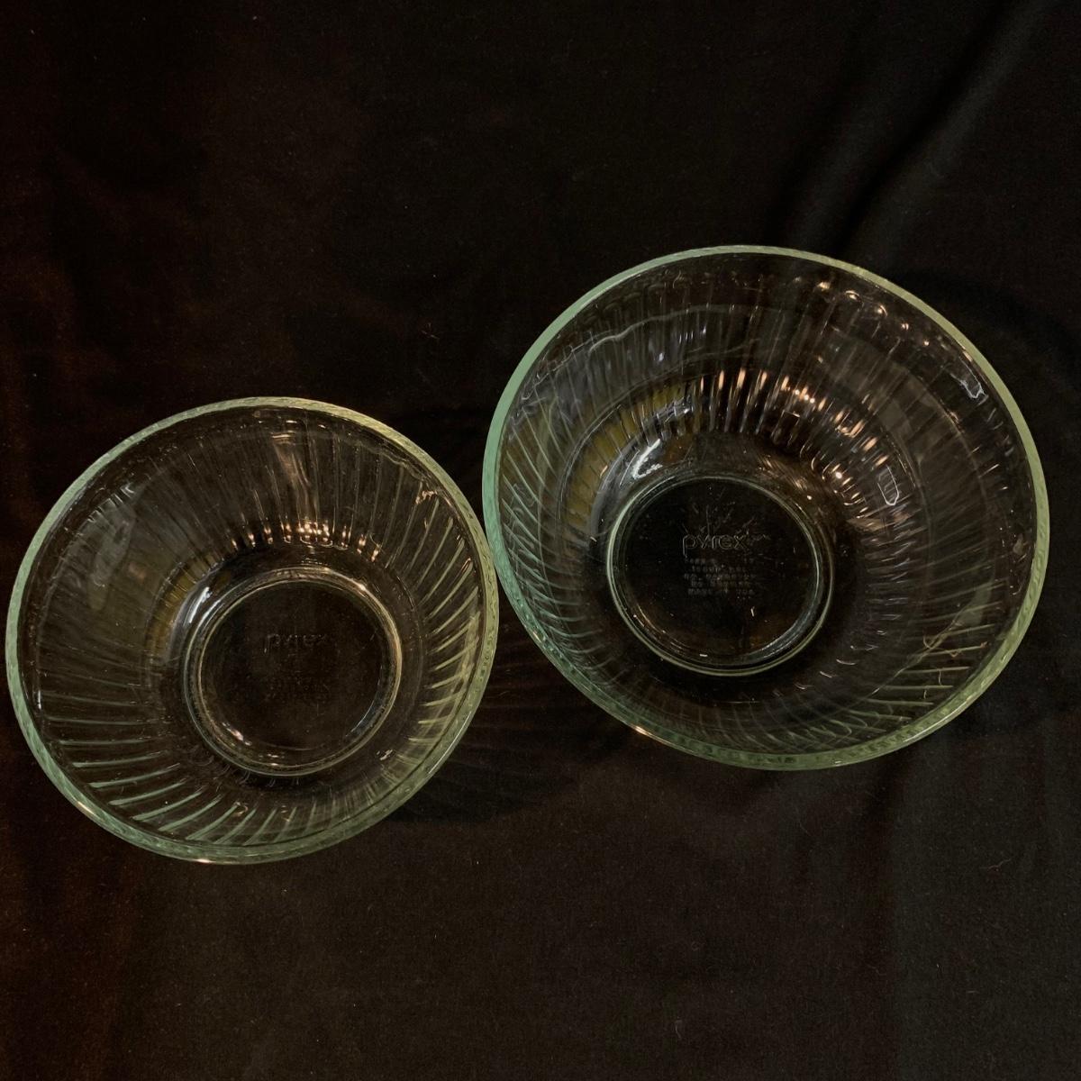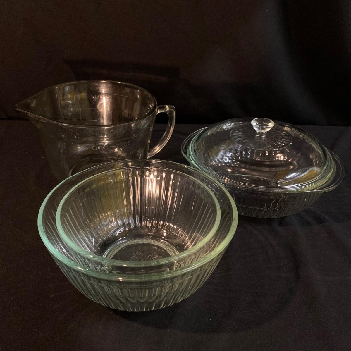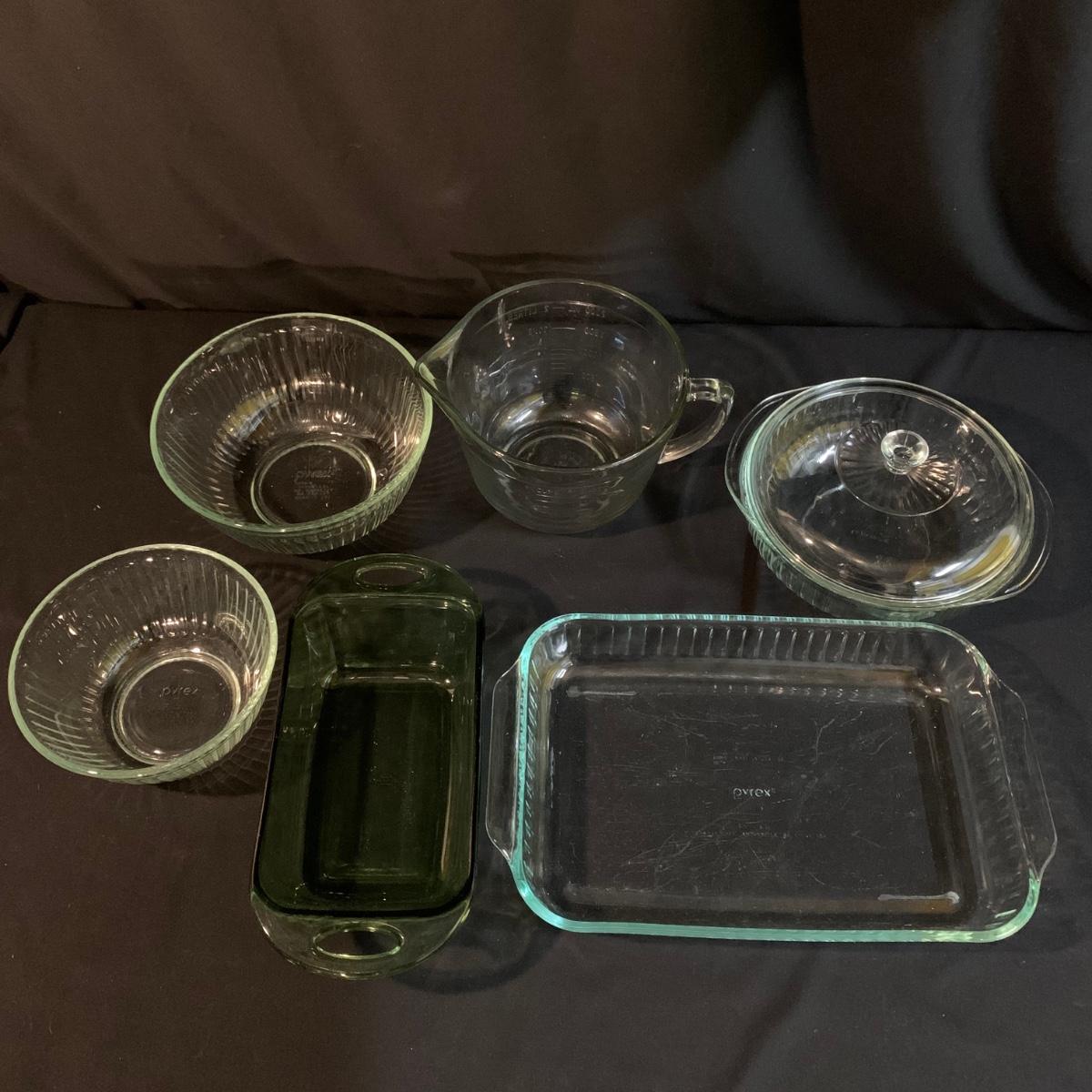 Six glass items of Pyrex and Anchor Hocking bakeware. The two-quart measuring cup and green-hued 5” x 9” baking dish are Anchor Hocking. The two mixing bowls (six cup & ten cup), round lidded two-quart dish, and rectangular three-quart baking dish are Pyrex. Most items are in good condition, with some small superficial scratches. The three-quart Pyrex is a bit more scratched than the other items and has a little bit of chipping on its inner rim by the handle. Local pickup only.