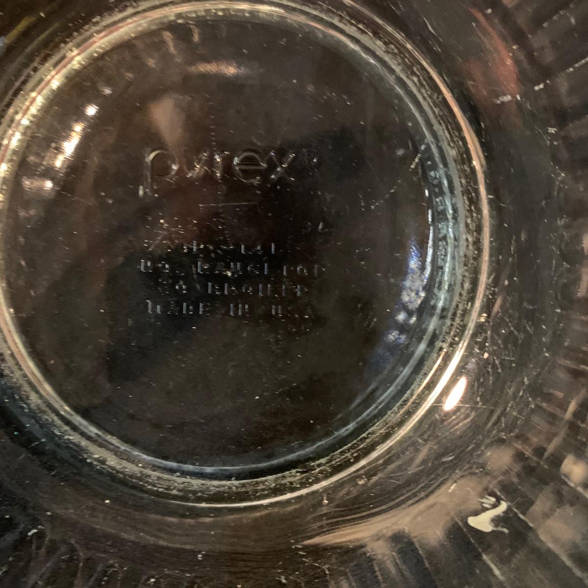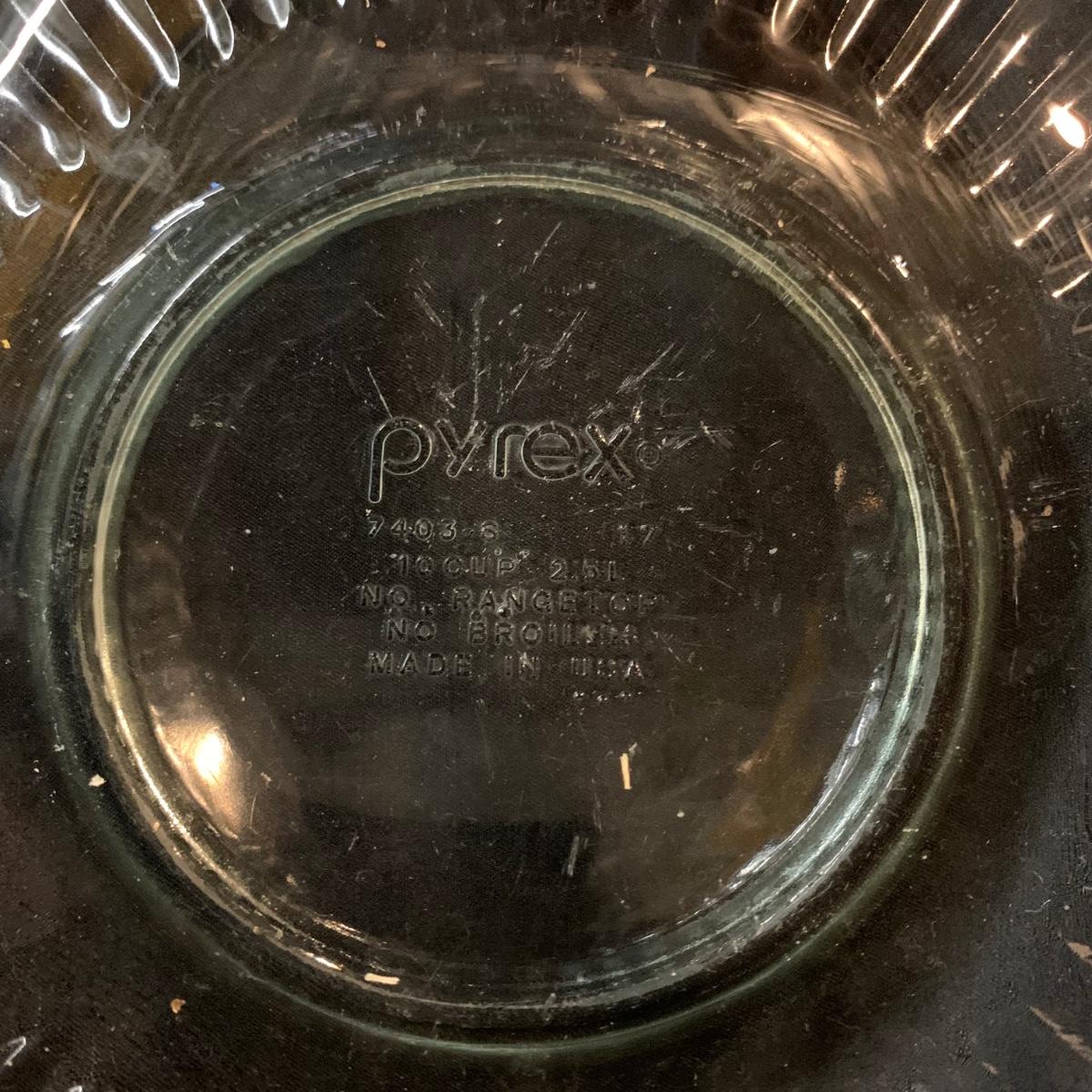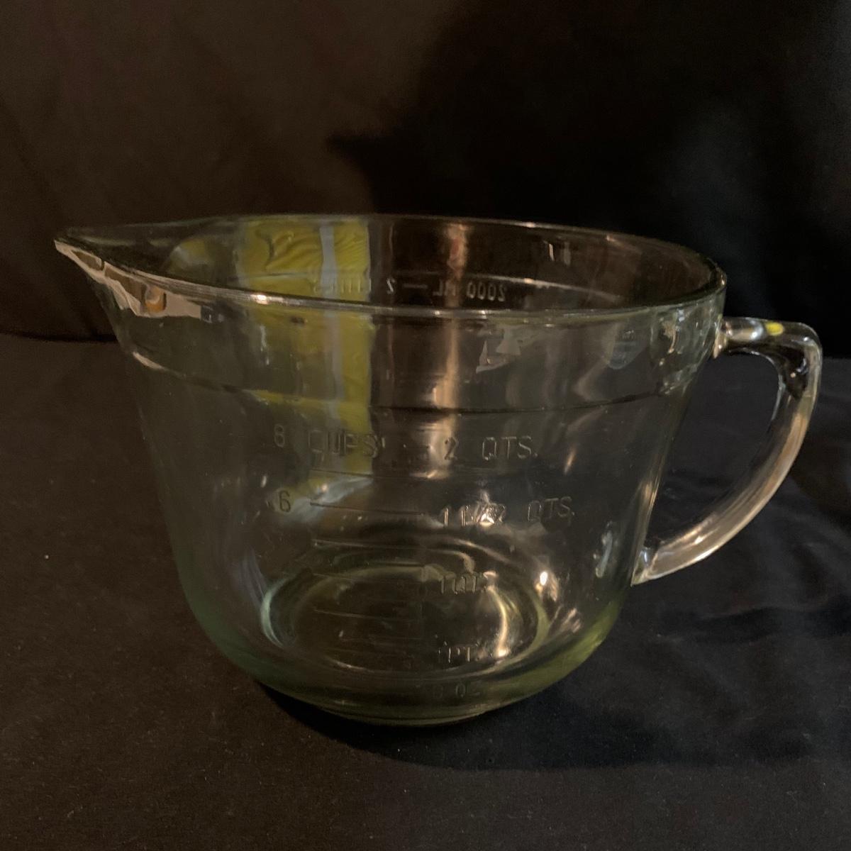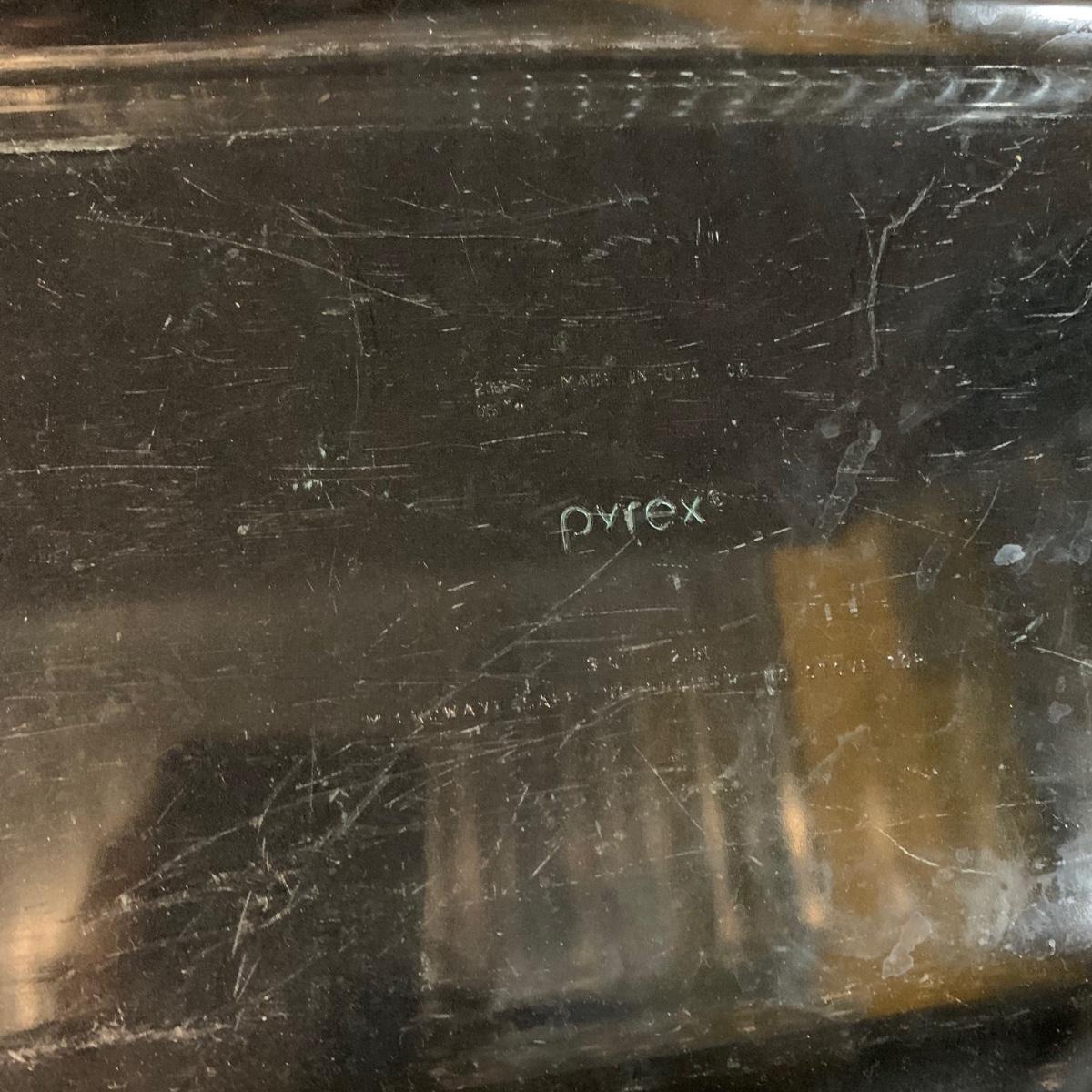 Six glass items of Pyrex and Anchor Hocking bakeware. The two-quart measuring cup and green-hued 5” x 9” baking dish are Anchor Hocking. The two mixing bowls (six cup & ten cup), round lidded two-quart dish, and rectangular three-quart baking dish are Pyrex. Most items are in good condition, with some small superficial scratches. The three-quart Pyrex is a bit more scratched than the other items and has a little bit of chipping on its inner rim by the handle. Local pickup only.