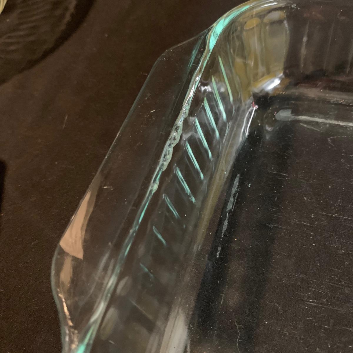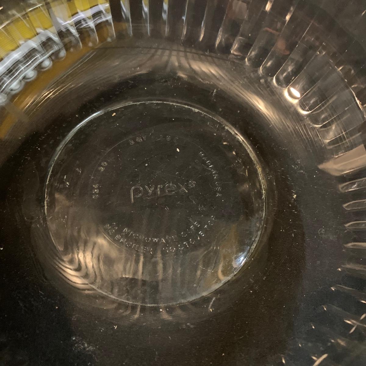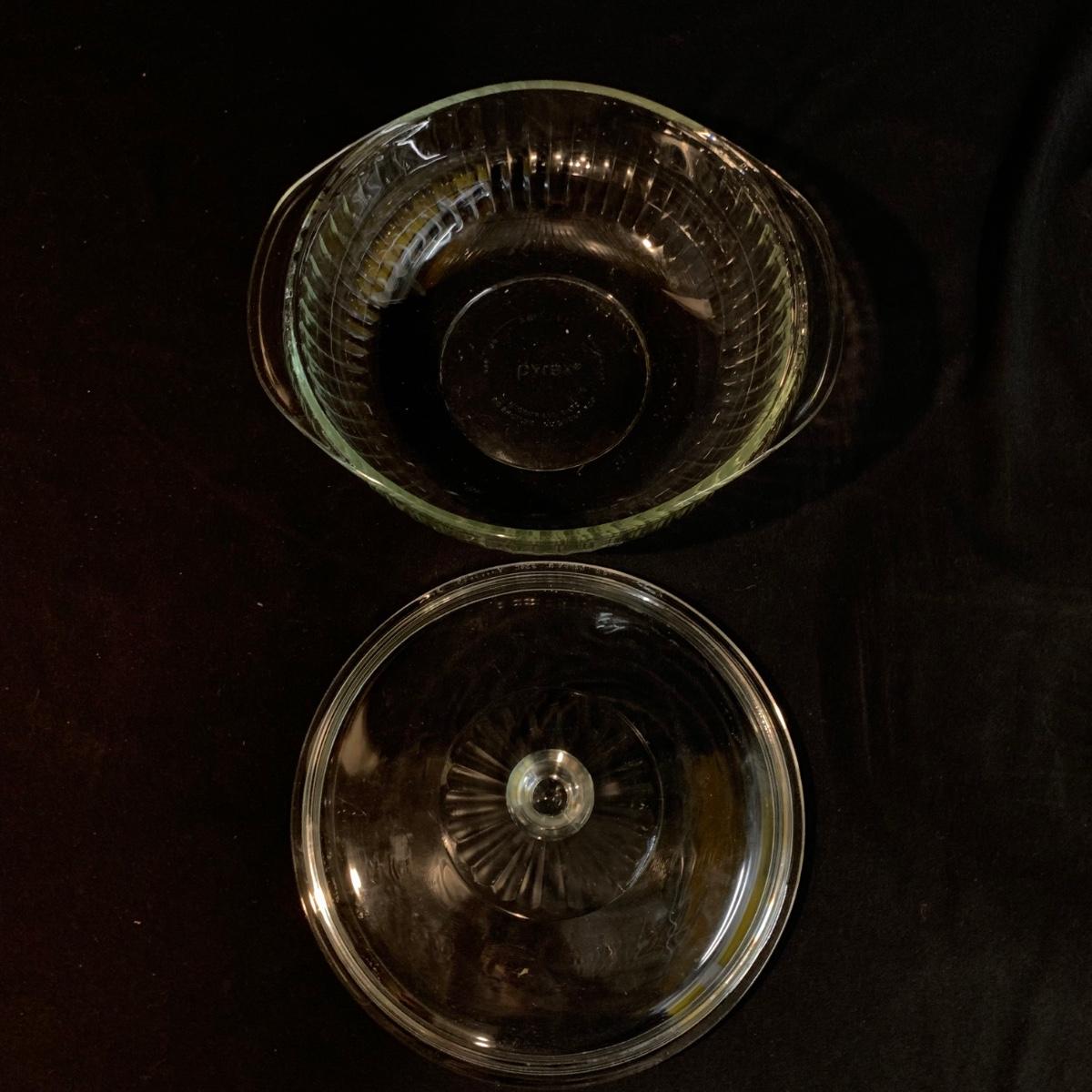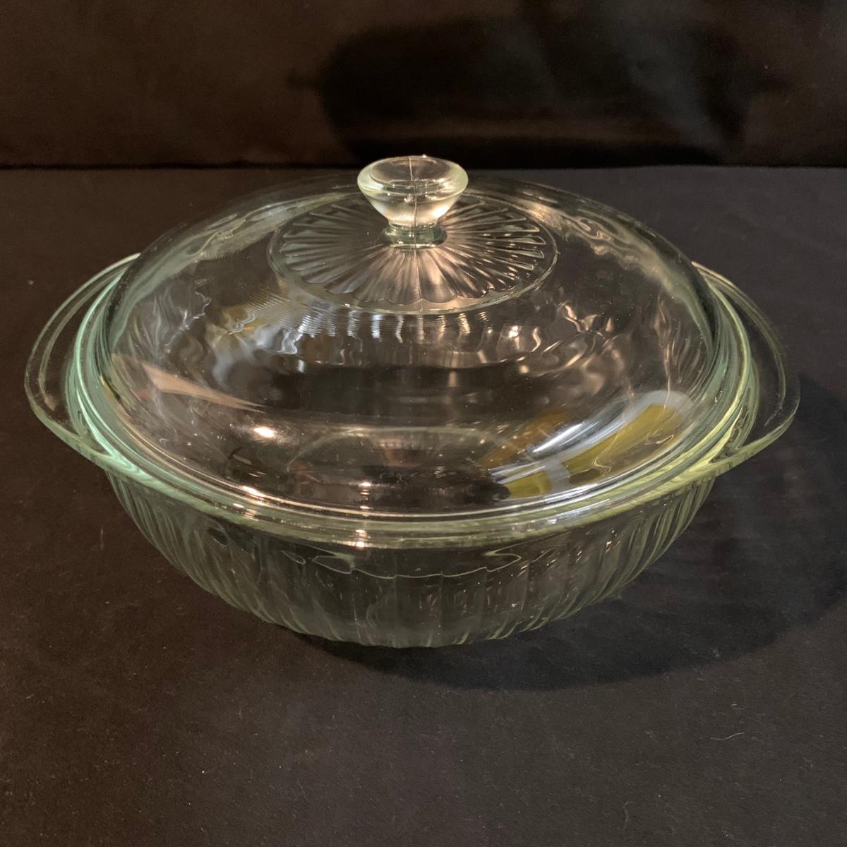 Six glass items of Pyrex and Anchor Hocking bakeware. The two-quart measuring cup and green-hued 5” x 9” baking dish are Anchor Hocking. The two mixing bowls (six cup & ten cup), round lidded two-quart dish, and rectangular three-quart baking dish are Pyrex. Most items are in good condition, with some small superficial scratches. The three-quart Pyrex is a bit more scratched than the other items and has a little bit of chipping on its inner rim by the handle. Local pickup only.