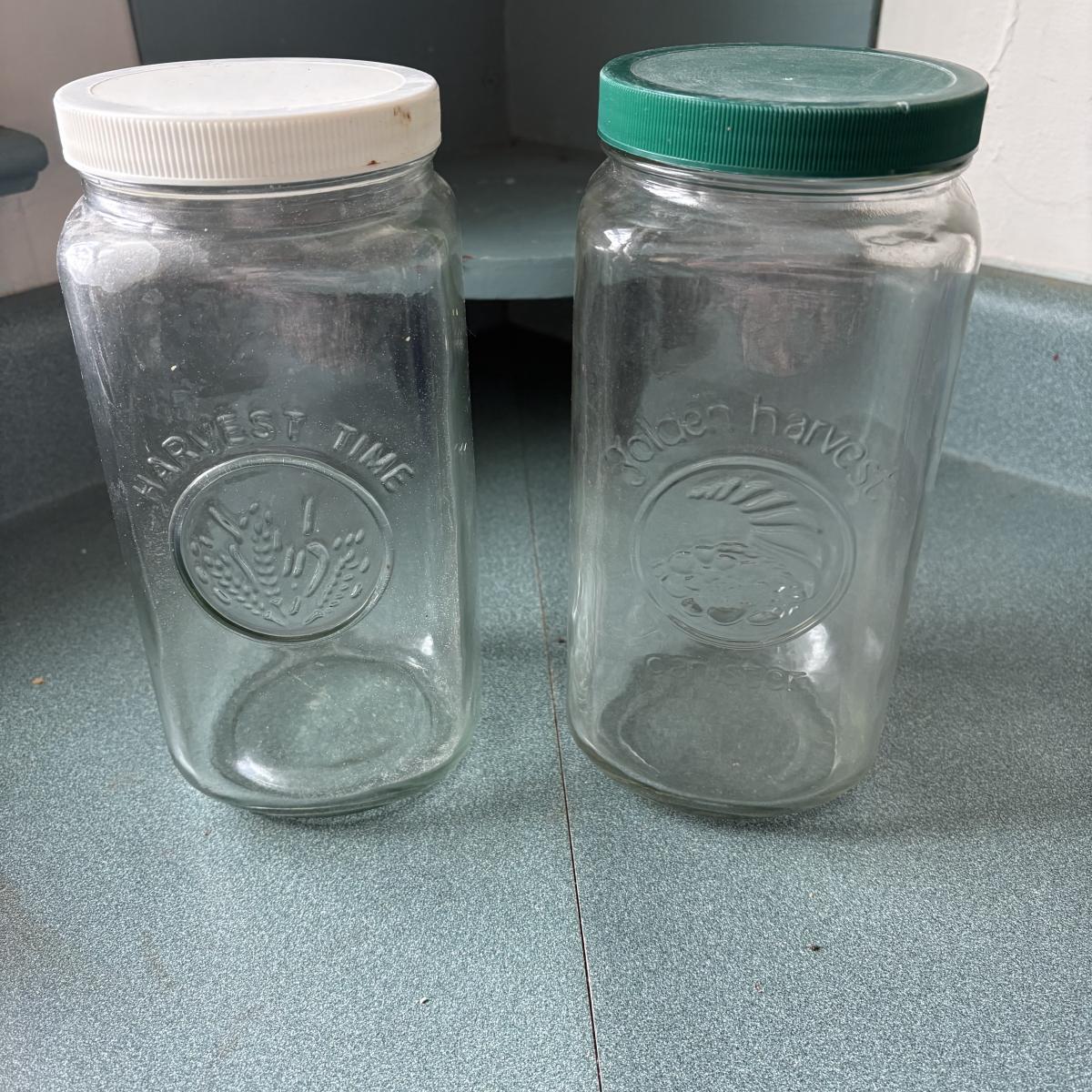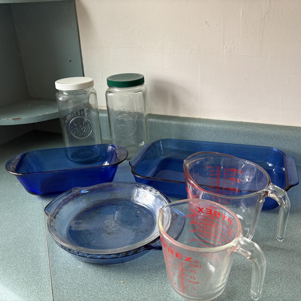 Glass ovenware and storage collection. Lot includes two 9” pie plates, the blue pie plate is deeper than the clear. A blue loaf pan is 5” x 9”, a 9” x 13” blue baking pan, two vintage canning jars are 9”H with plastic lids. Lastly a two-cup and a four-cup glass measuring cups.