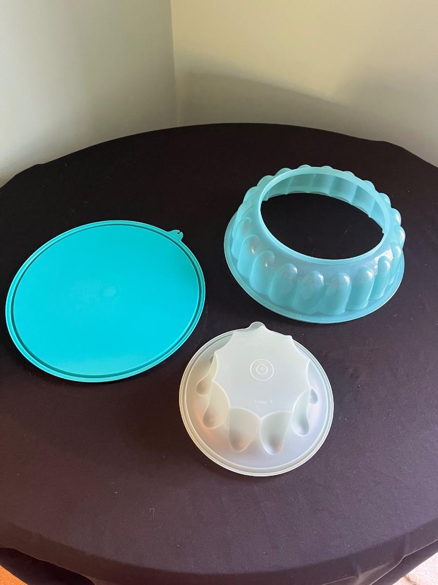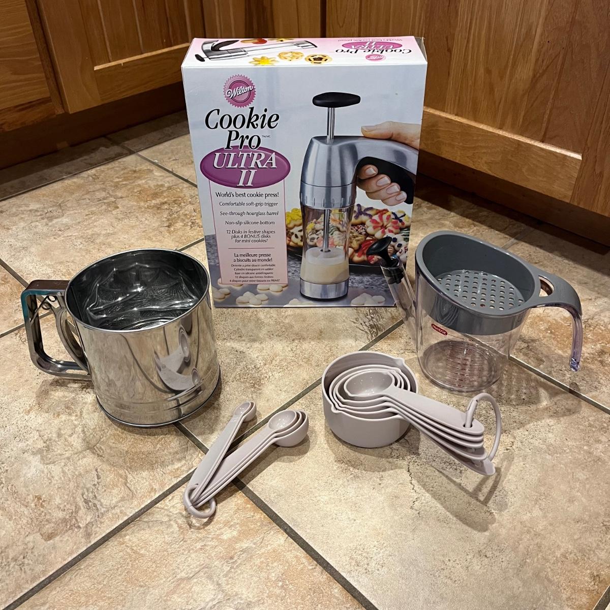 This grouping includes a wooden cutting board with dough measurements, a cookie press, rolling pin, three glass pie dishes, measuring cups and spoons and more. See picture for details. Cutting board is 16” x 22”.