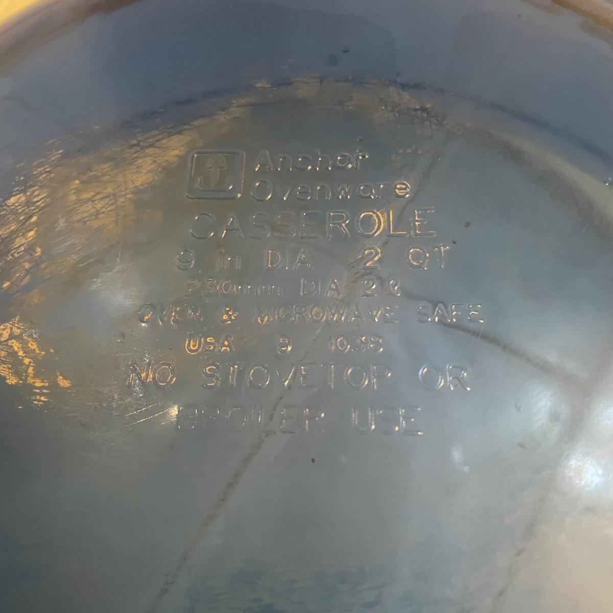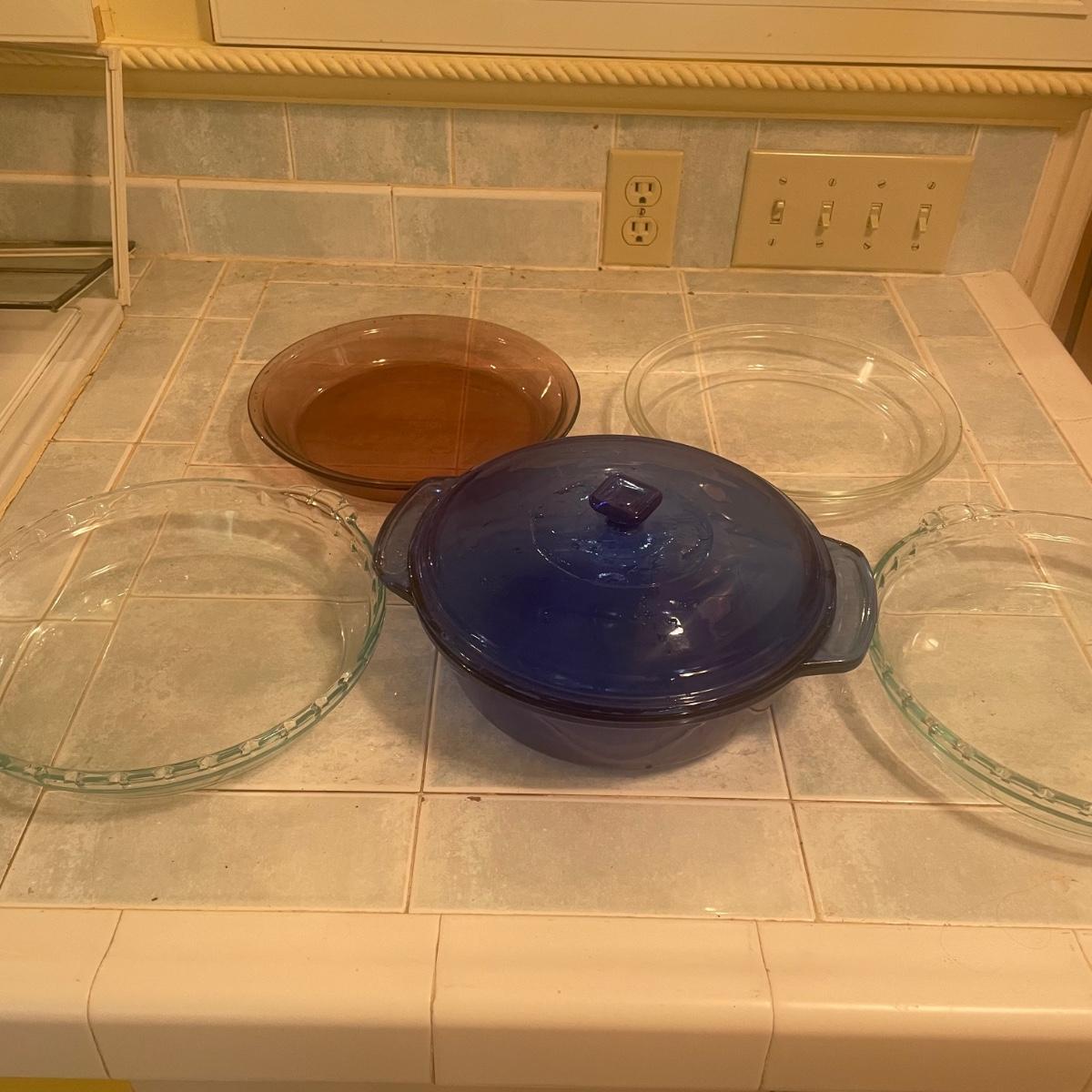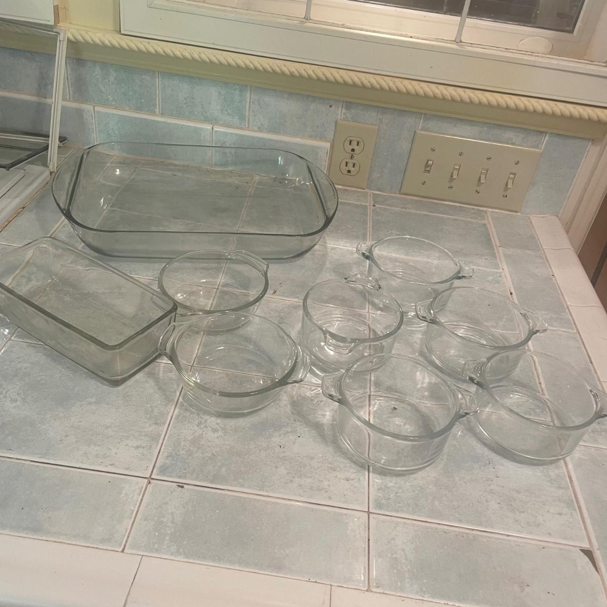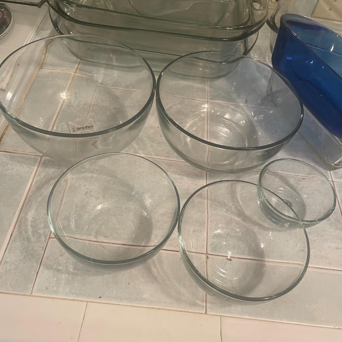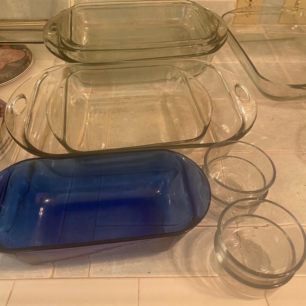 Plenty of casserole dishes both small and large along with round small, medium and large glass bowls for cooking and for storage. Over a third of the items are Pyrex, many of which come with plastic lids along with a large assortment of Anchor Hocking pieces and more. All items are in good condition they just need a run through the dishwasher.