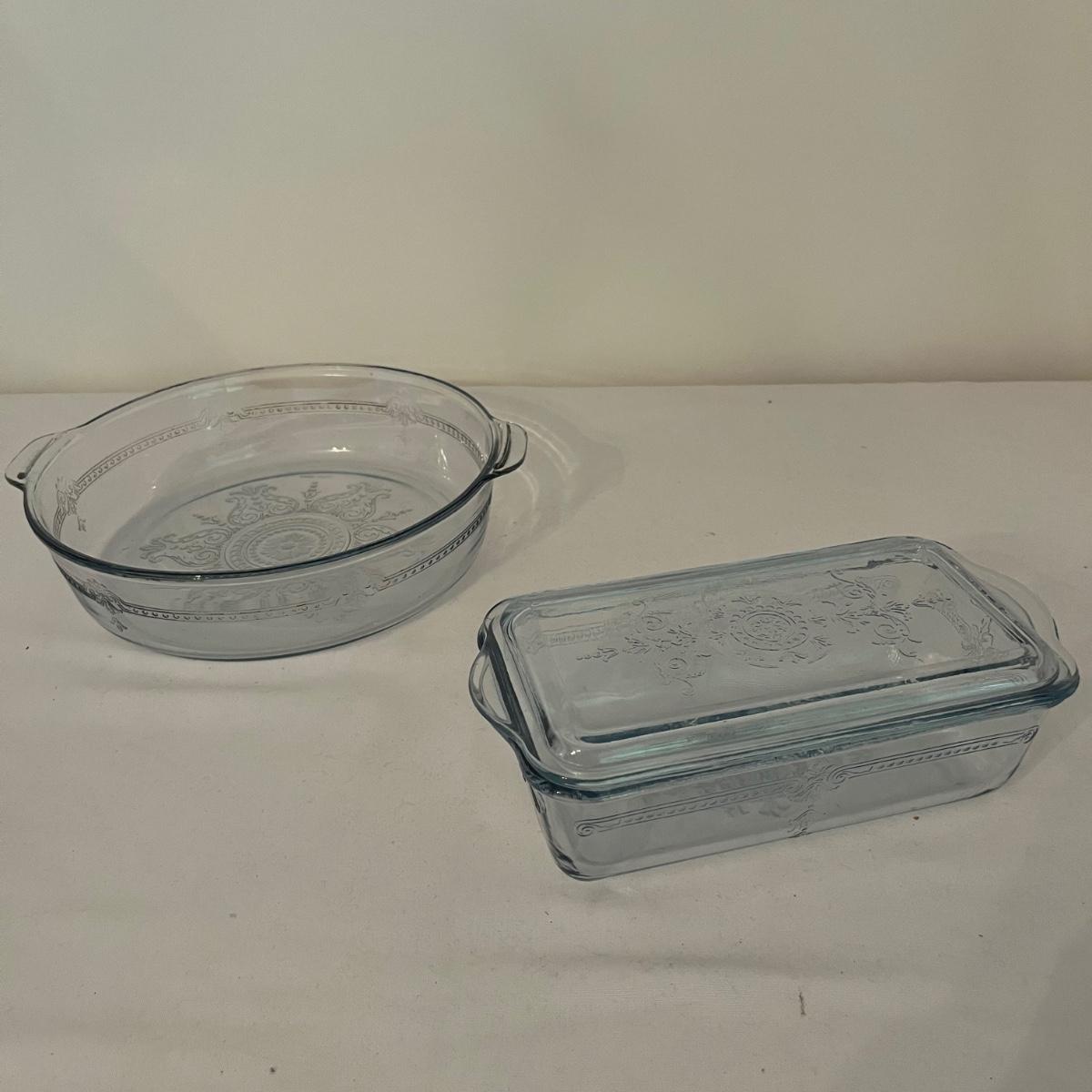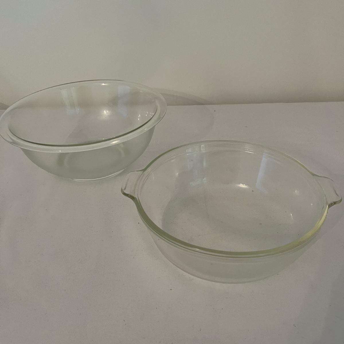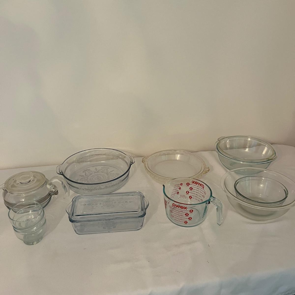 This lot includes seven Pyrex cooking dishes, a set of Fire King dish ware, and more. There is slight wear on some dishes but overall the dishes don’t have any known chips. The largest dish measures about 13.5”D x 3”H. Shipping available.