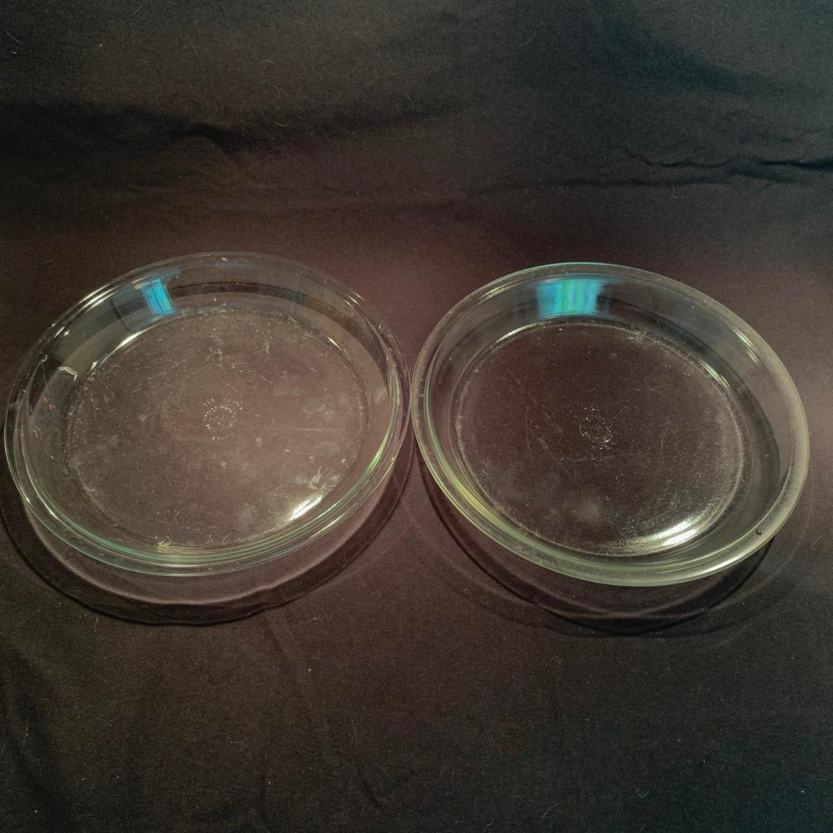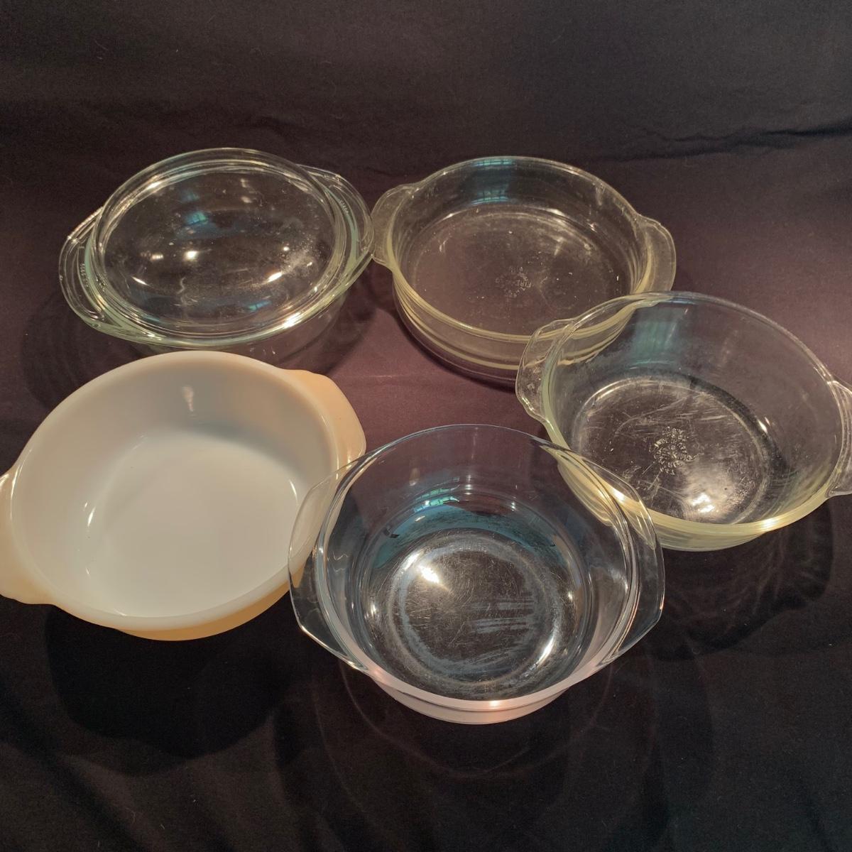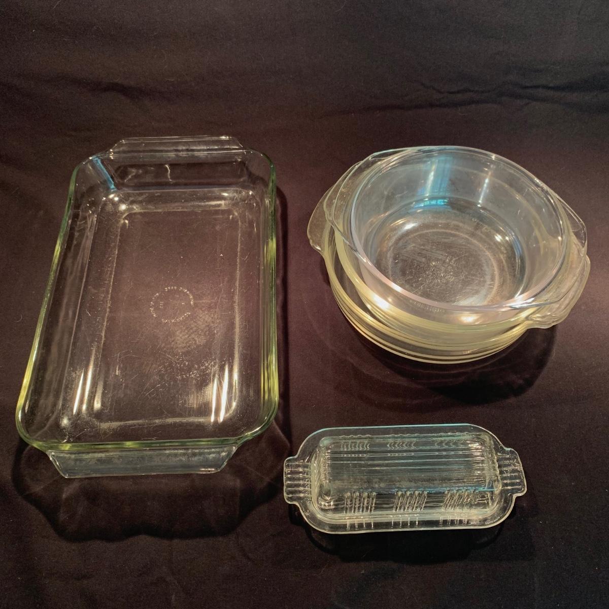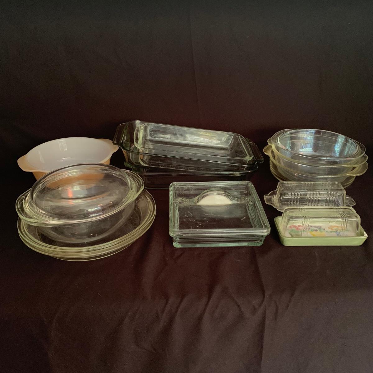 Thirteen total dishes in this lot. Three rectangular casserole dishes, one of which is a 1.5 quart Pyrex, one is a two-quart Anchor Ovenware, and the third is not marked. Five round dishes: one peach-colored Fire-King dish, one Arcuisine, two clear glass Fire-Kings, and one lidded 1.5 quart Pyrex. Two glass Pyrex 10” pie dishes. One square lidded dish and two butter dishes. Items are in fair to good condition. Some have some scratches from use. The lid from the square dish and the butter dishes each have a chip or two. Local pickup only.