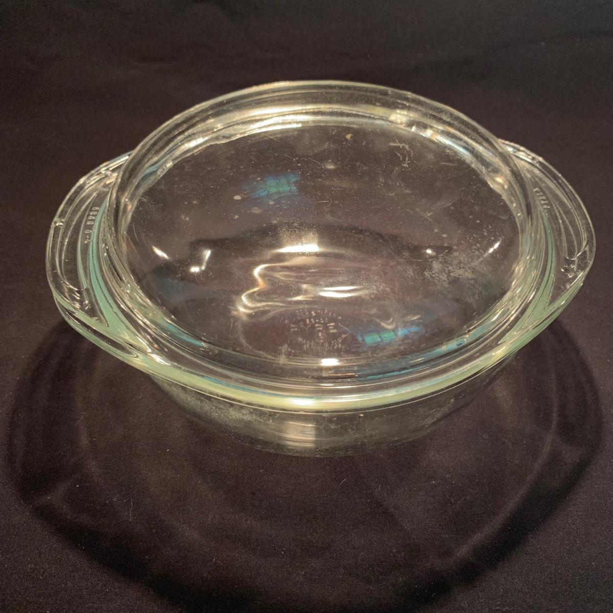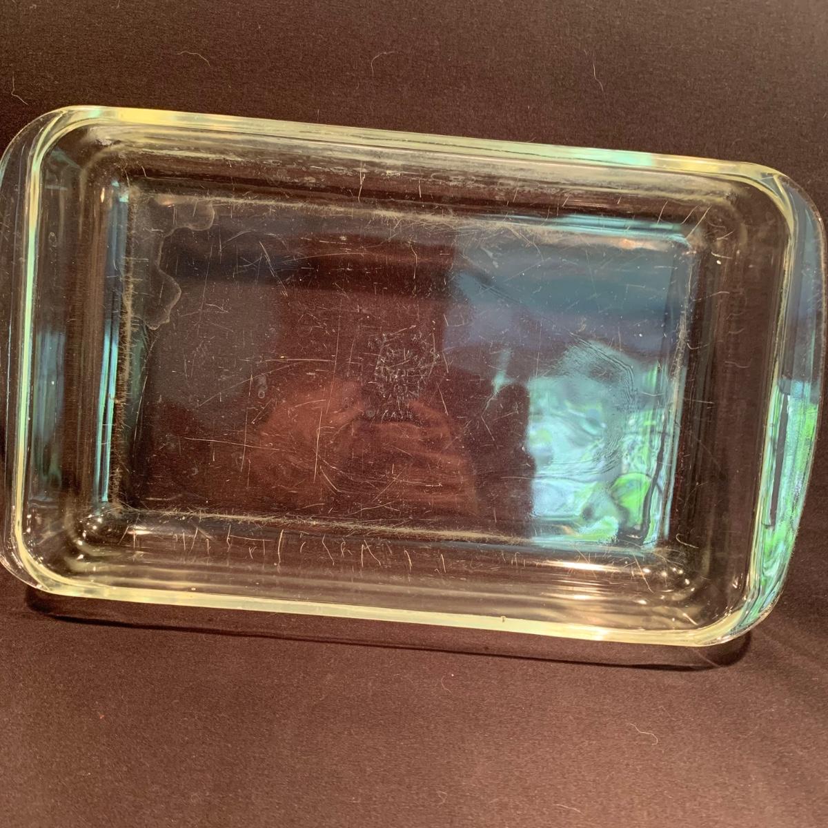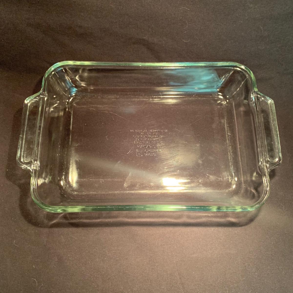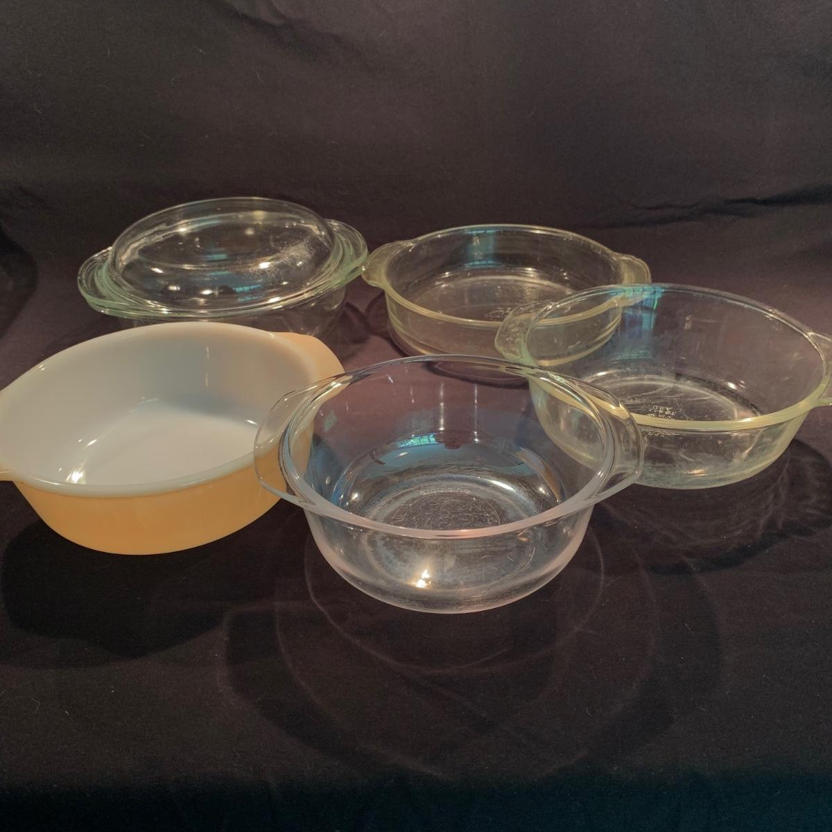 Thirteen total dishes in this lot. Three rectangular casserole dishes, one of which is a 1.5 quart Pyrex, one is a two-quart Anchor Ovenware, and the third is not marked. Five round dishes: one peach-colored Fire-King dish, one Arcuisine, two clear glass Fire-Kings, and one lidded 1.5 quart Pyrex. Two glass Pyrex 10” pie dishes. One square lidded dish and two butter dishes. Items are in fair to good condition. Some have some scratches from use. The lid from the square dish and the butter dishes each have a chip or two. Local pickup only.