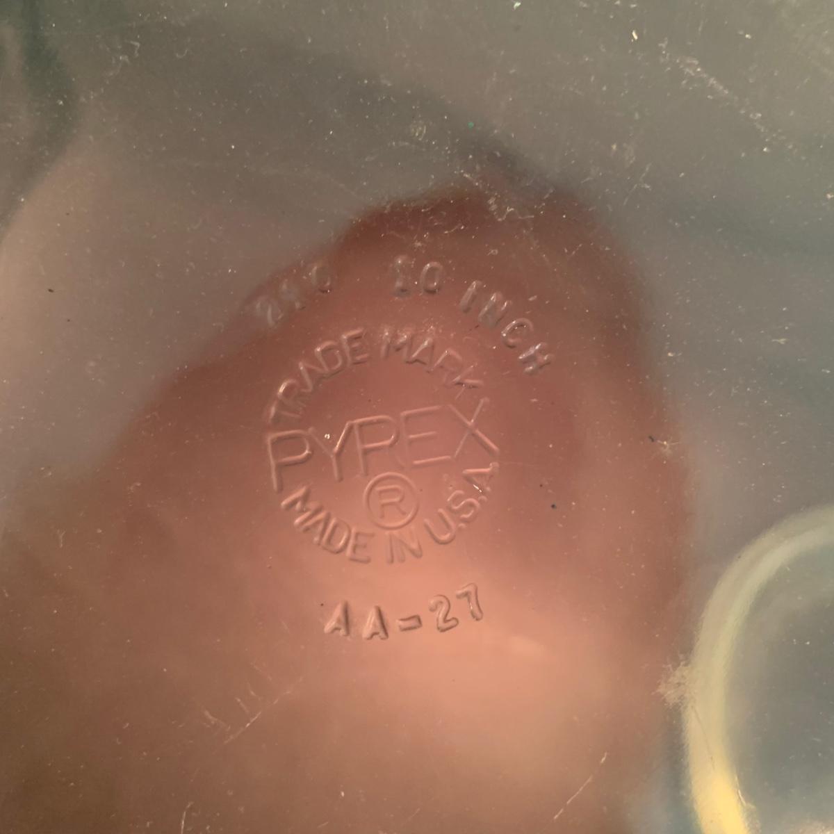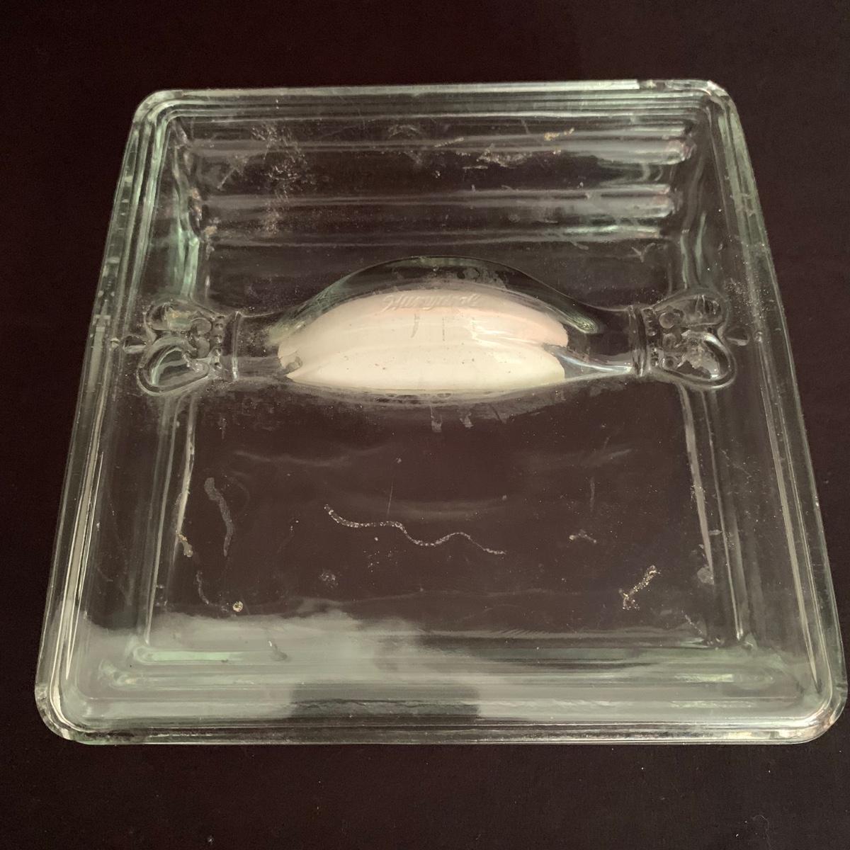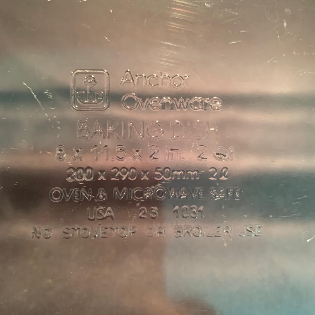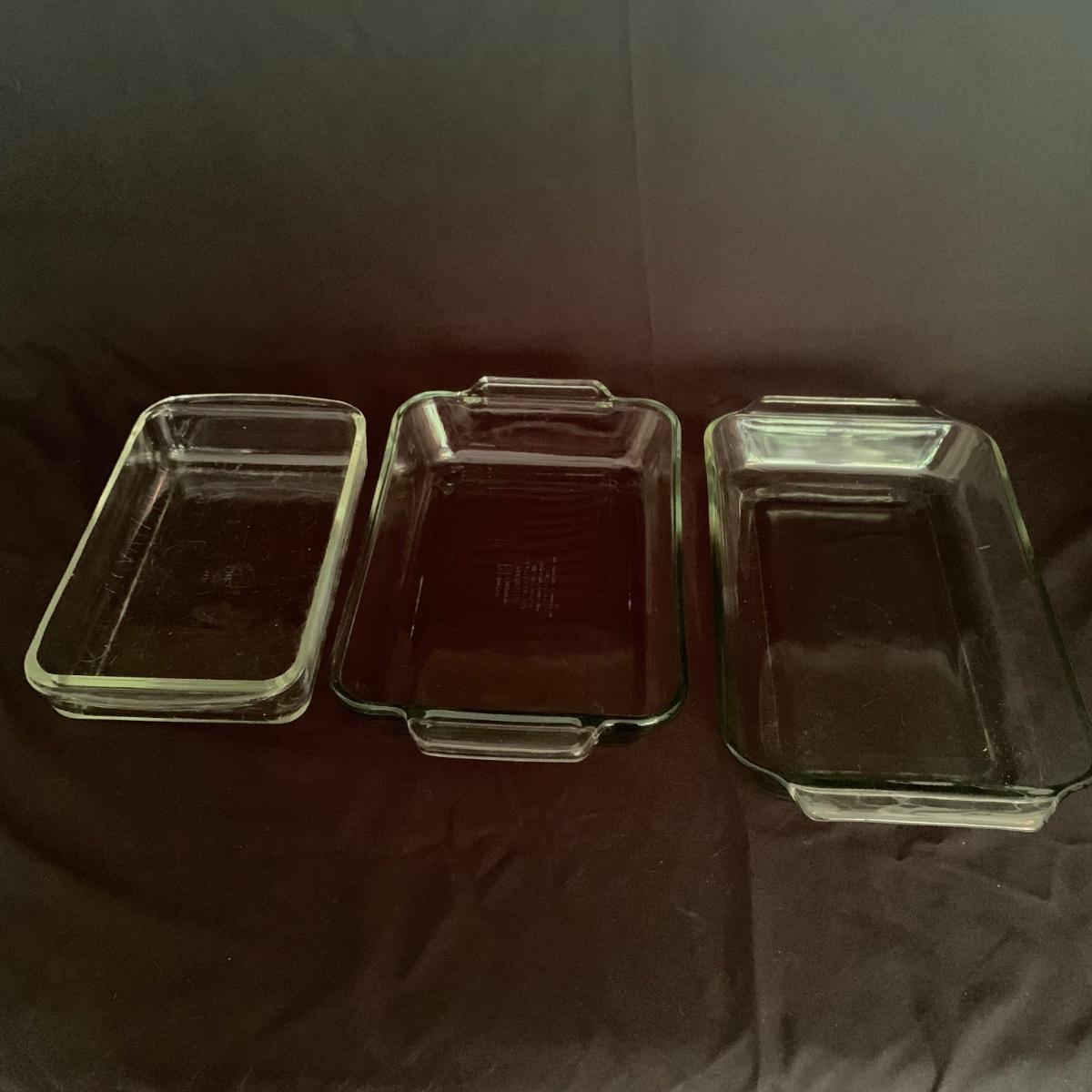 Thirteen total dishes in this lot. Three rectangular casserole dishes, one of which is a 1.5 quart Pyrex, one is a two-quart Anchor Ovenware, and the third is not marked. Five round dishes: one peach-colored Fire-King dish, one Arcuisine, two clear glass Fire-Kings, and one lidded 1.5 quart Pyrex. Two glass Pyrex 10” pie dishes. One square lidded dish and two butter dishes. Items are in fair to good condition. Some have some scratches from use. The lid from the square dish and the butter dishes each have a chip or two. Local pickup only.