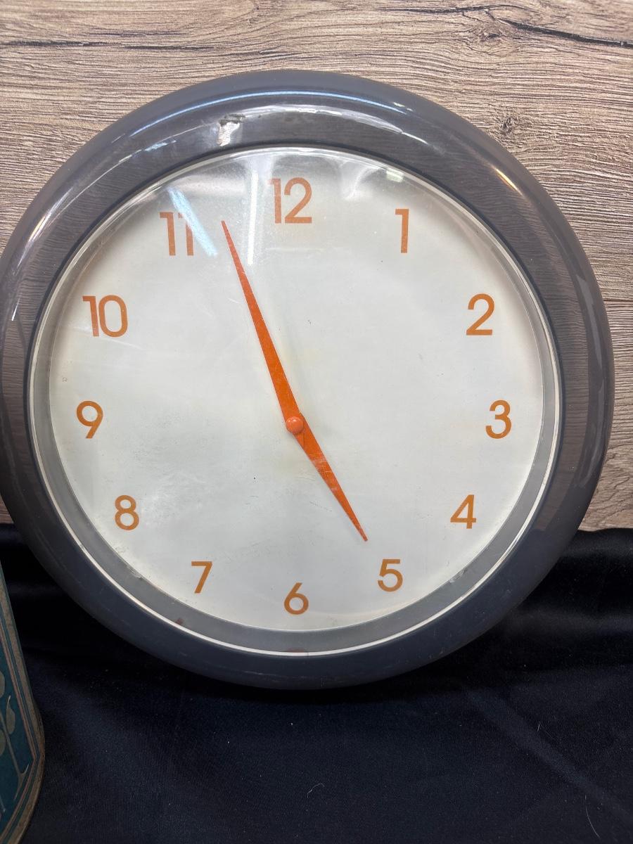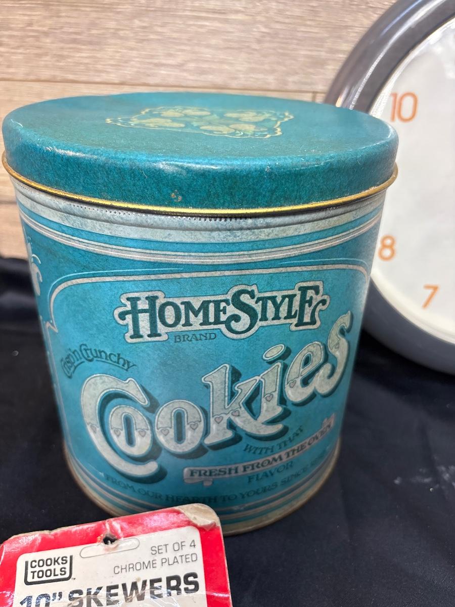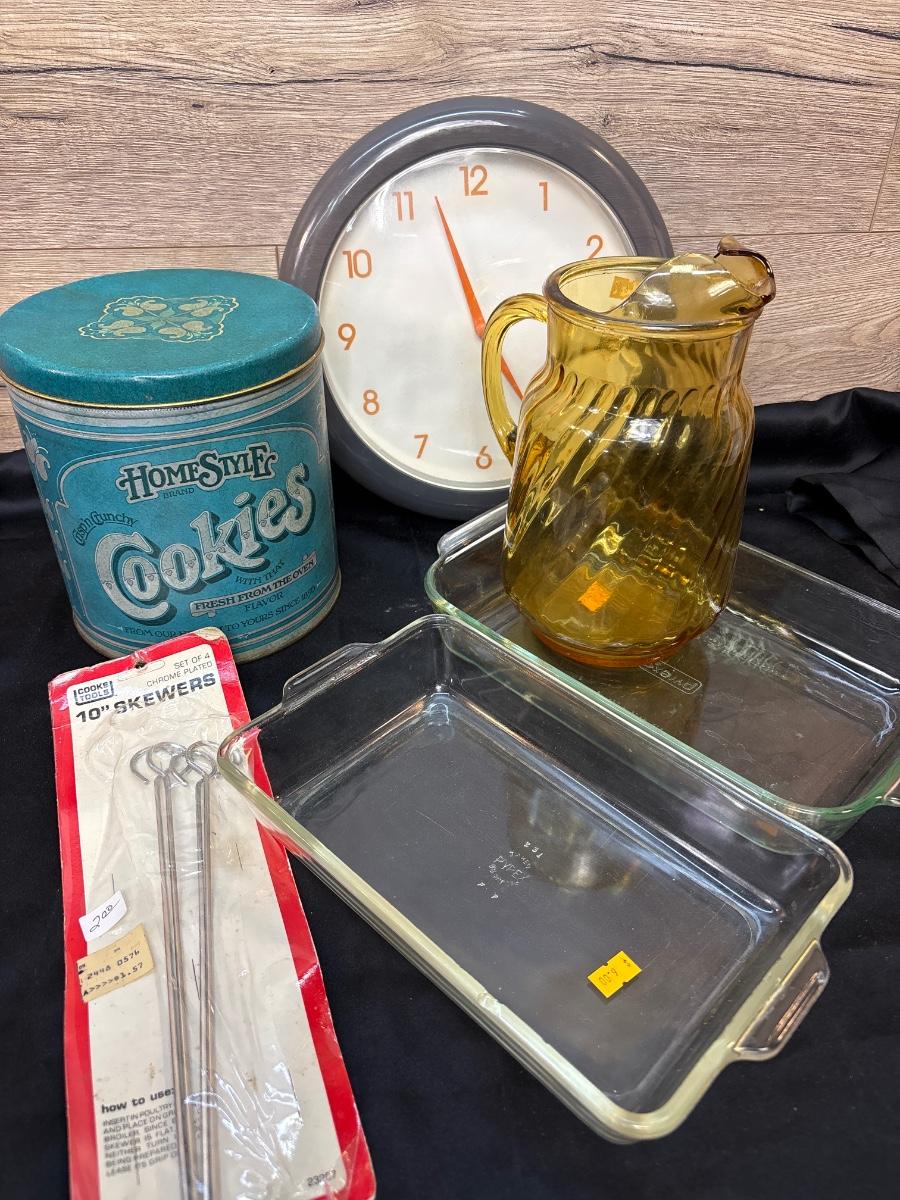 Pyrex baking dishes, cookie tin, clock