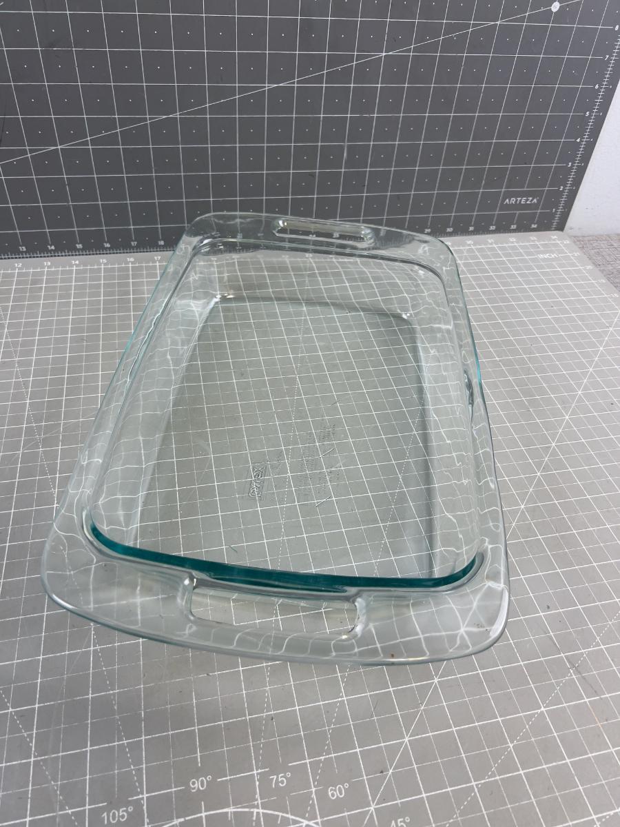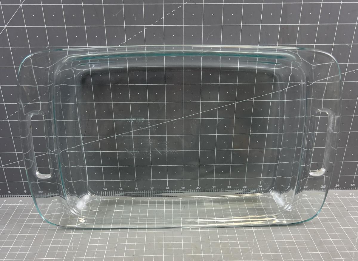 9 X 13 inside of Pan. Marked PYREX and in Good Condition. Better than Usual.