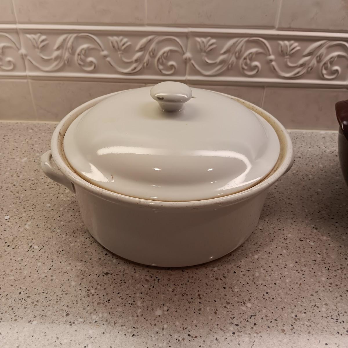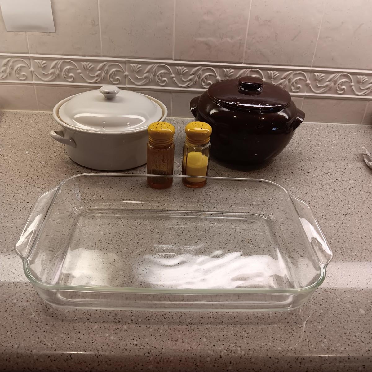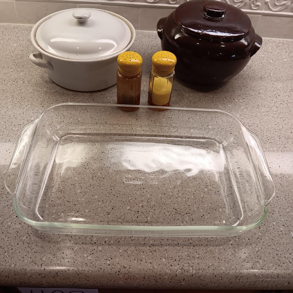 PYREX BAKING DISH, BEAN POT, SALT/PEPPER SHAKERS AND A CASSEROLE DISH