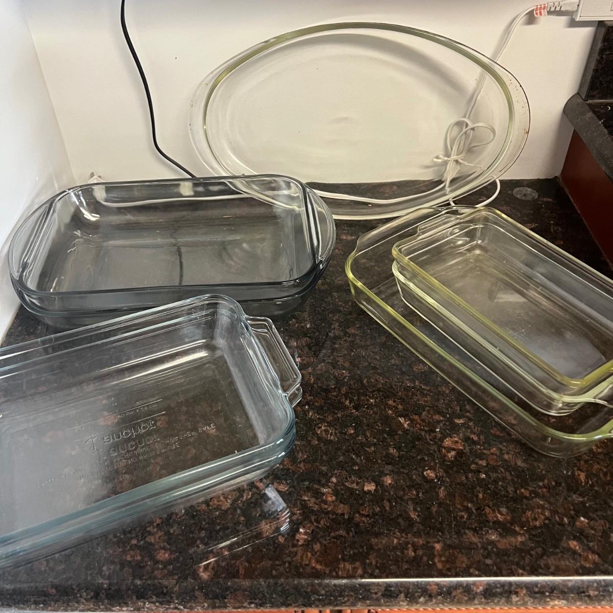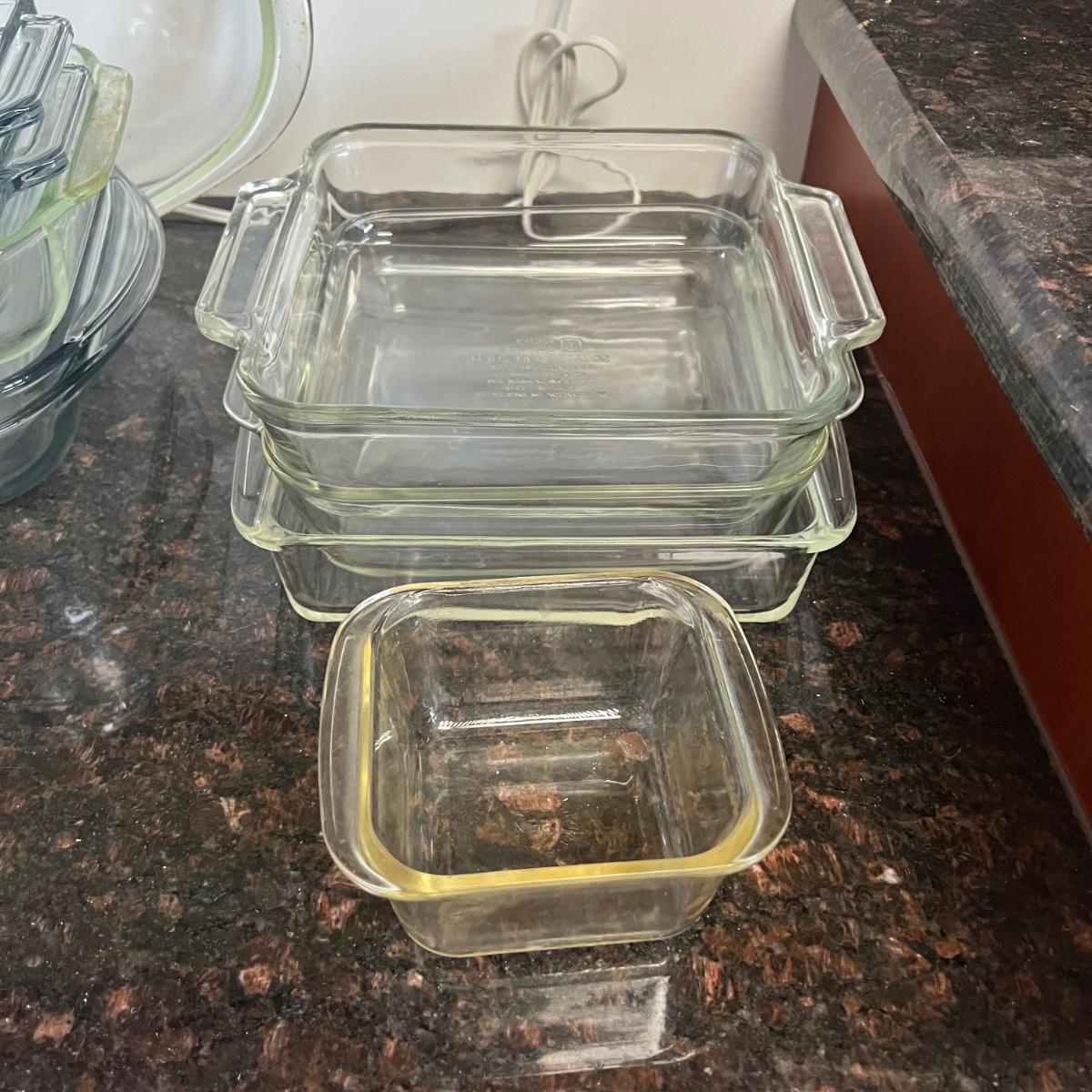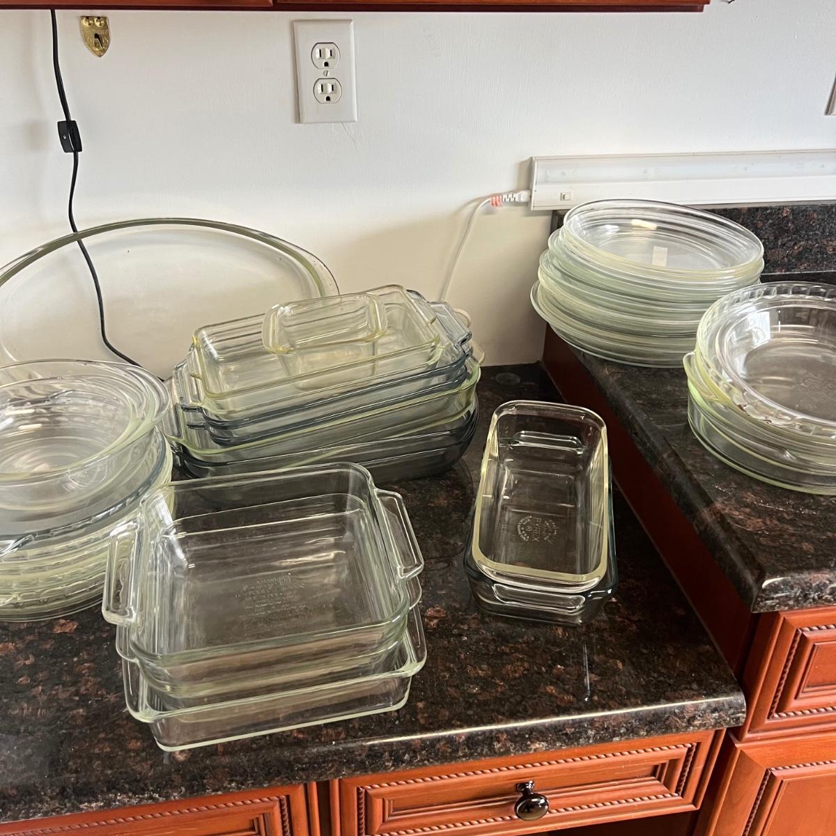 A very large assortment of Pyrex and Anchor Hocking pie plates, loaf pans and baking pans. The average pie pan is 10"D across. Also includes several square pans that average 8" x 8"SQ. One Anchor 5” x 9” loaf pan and one 8.5” x 4.5” x 2.5”H Pyrex loaf pan. Plus two Anchor 8” x 11” x 2.5”H baking dishes and one Pyrex 10” x 6” x 2”H and one Anchor Hawking of the same size. Please see photos for other sizes, condition, etc, Local Pickup only.