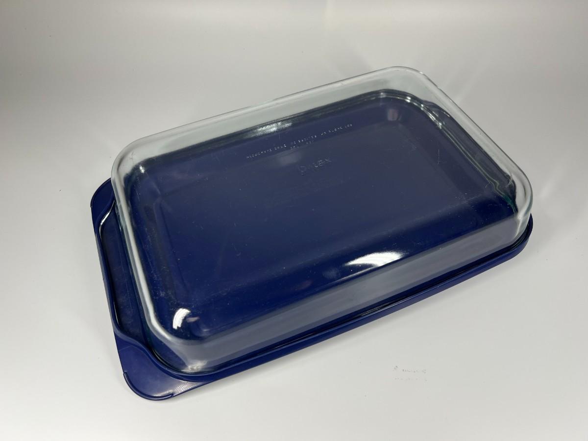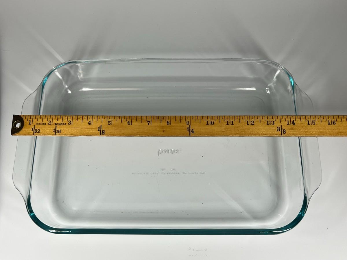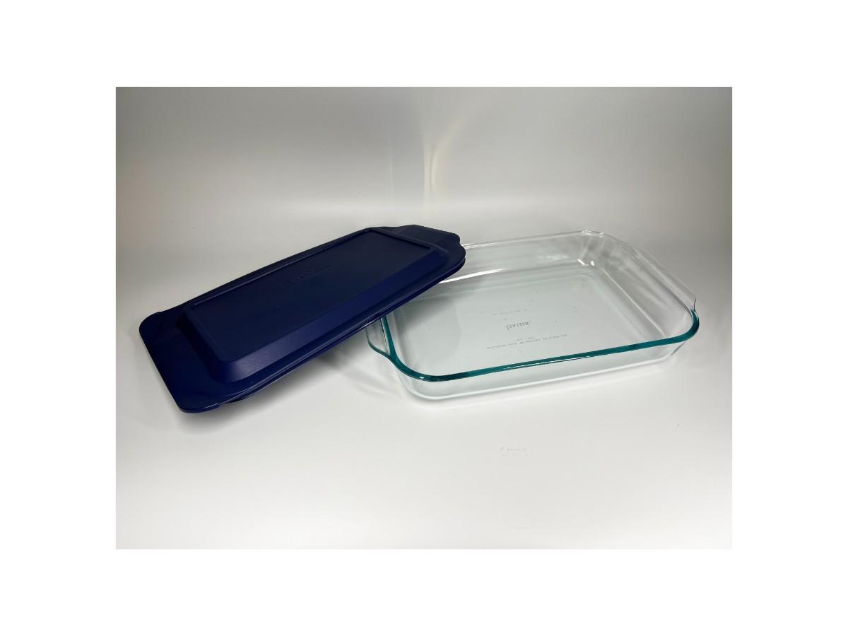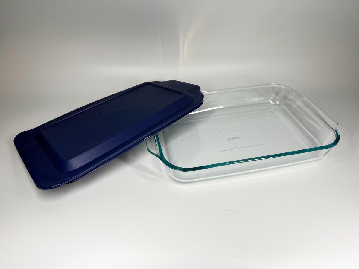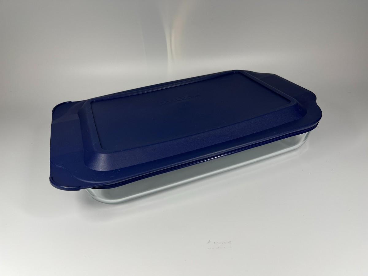 Pyrex Basics 3 Quart Clear Glass Baking Dish with Plastic Sealing Lid, there is no significant damage to the glass and is in good useable condition. Check pictures for more details and for sizing.