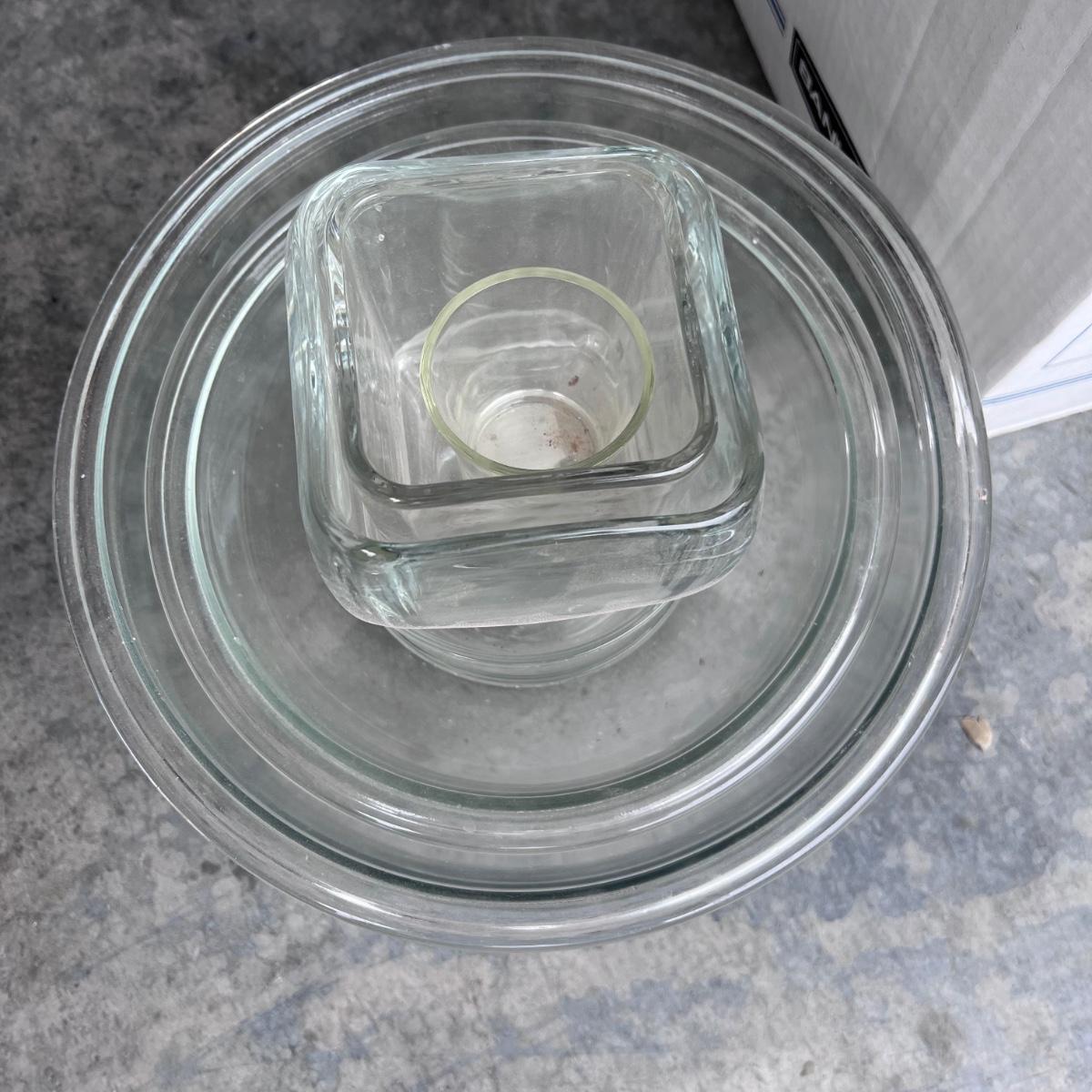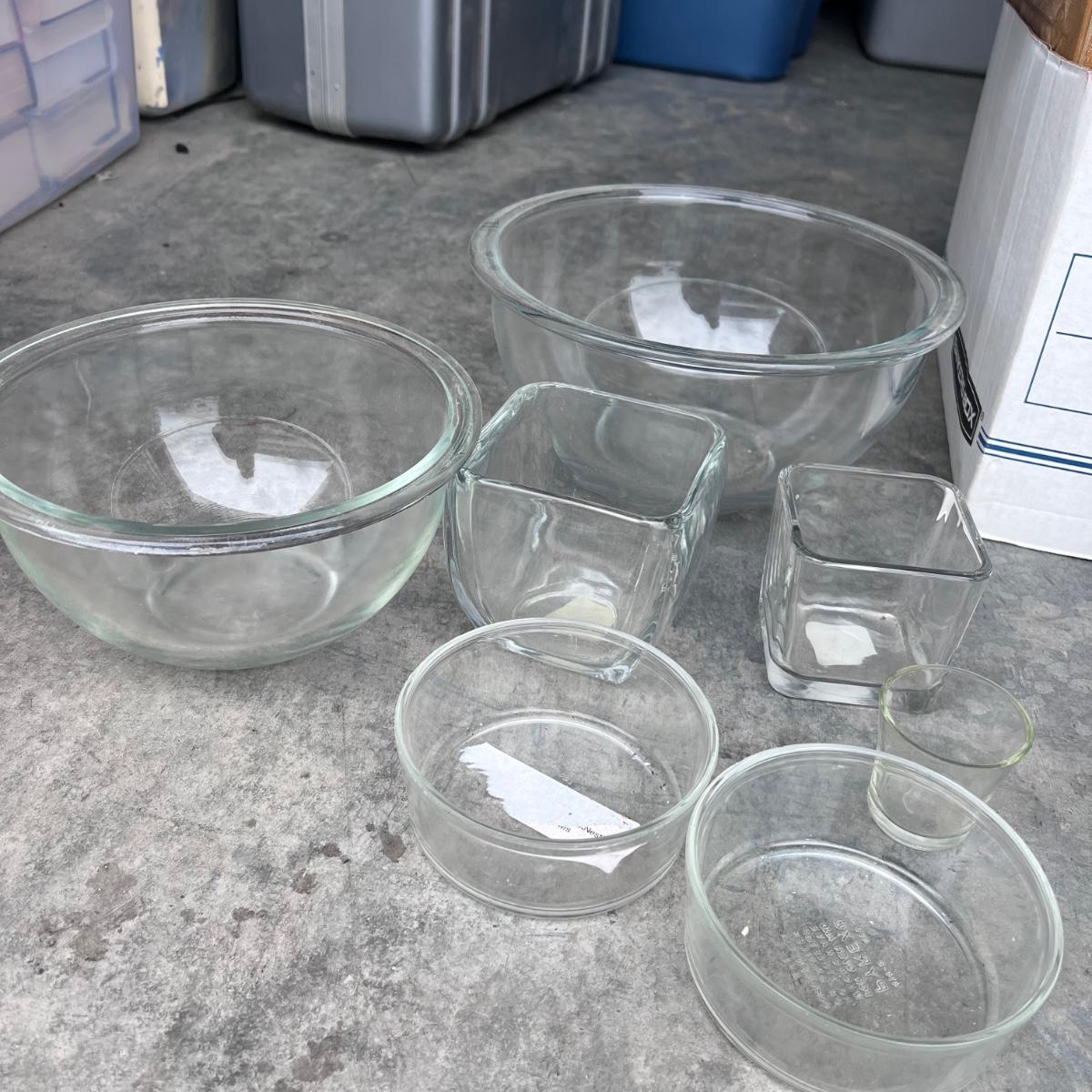 All in great condition. 4 Pyrex bowls 3 glass candle holders