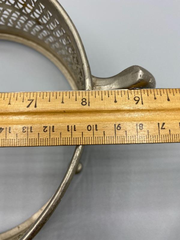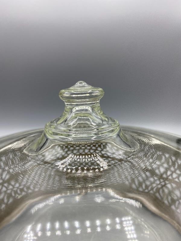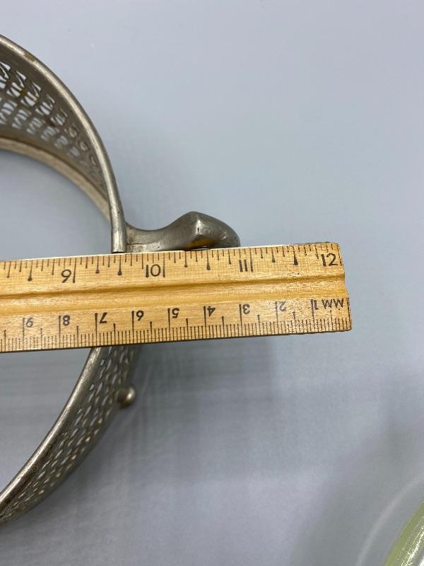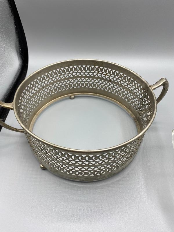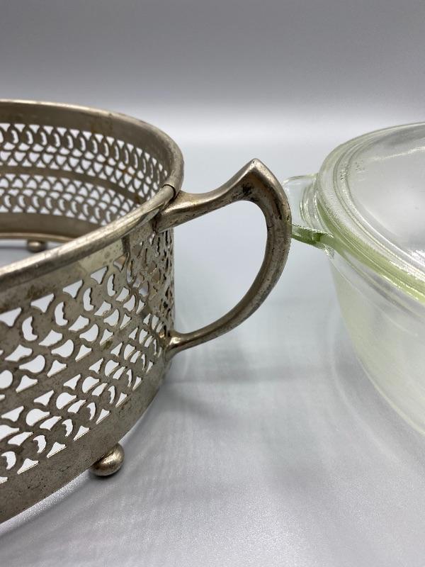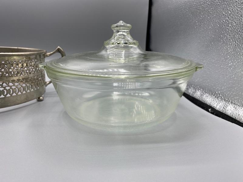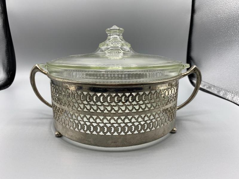 Clear Pyrex serving bowl with decorative metal holder. Lidded bowl. Silvertone Metal. Good vintage condition. Makes any meal a little fancier. 8” Pyrex bowl.