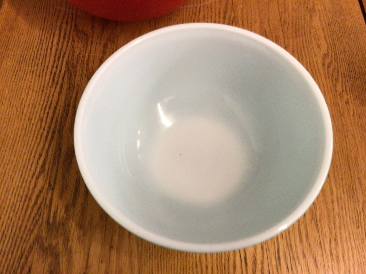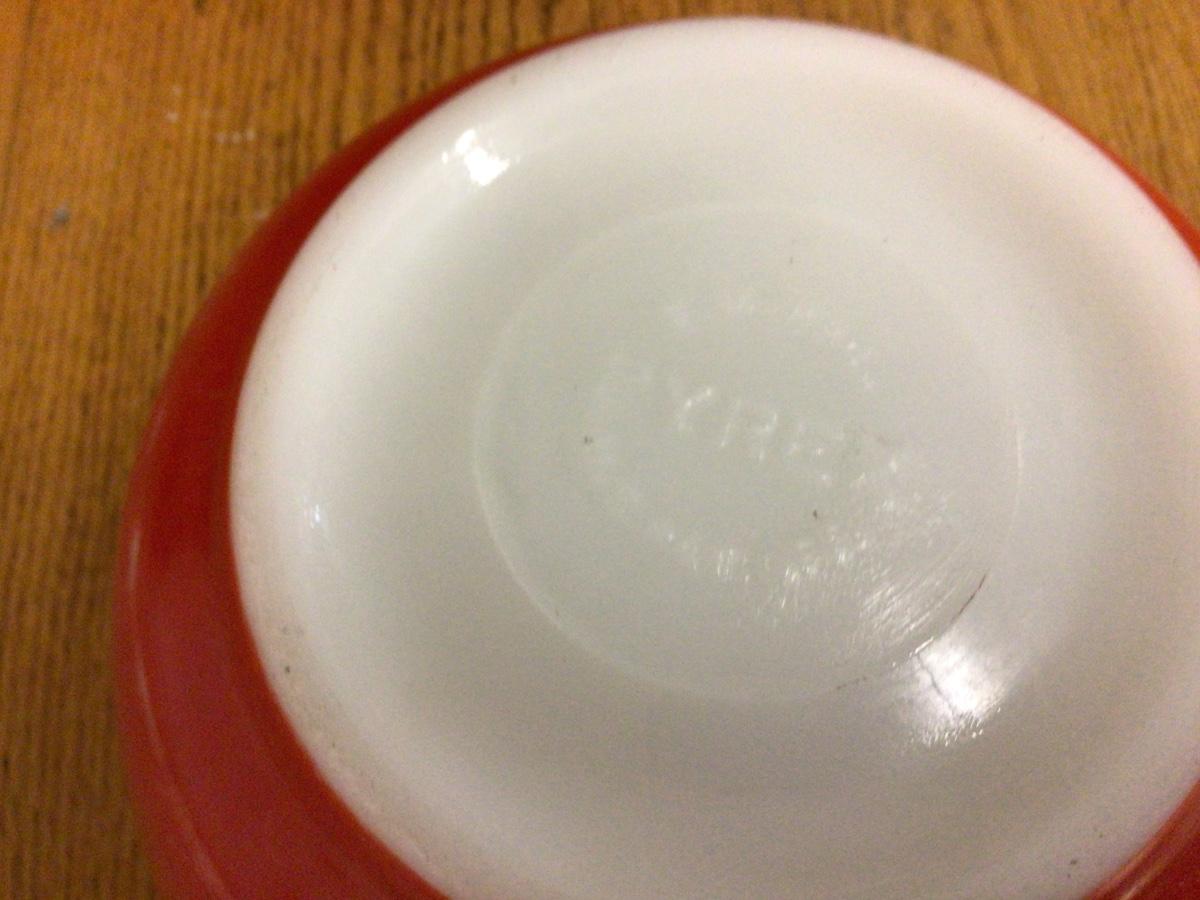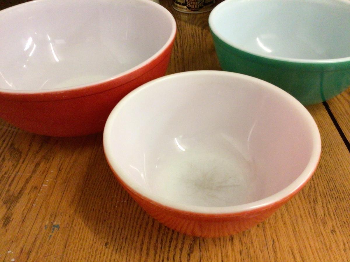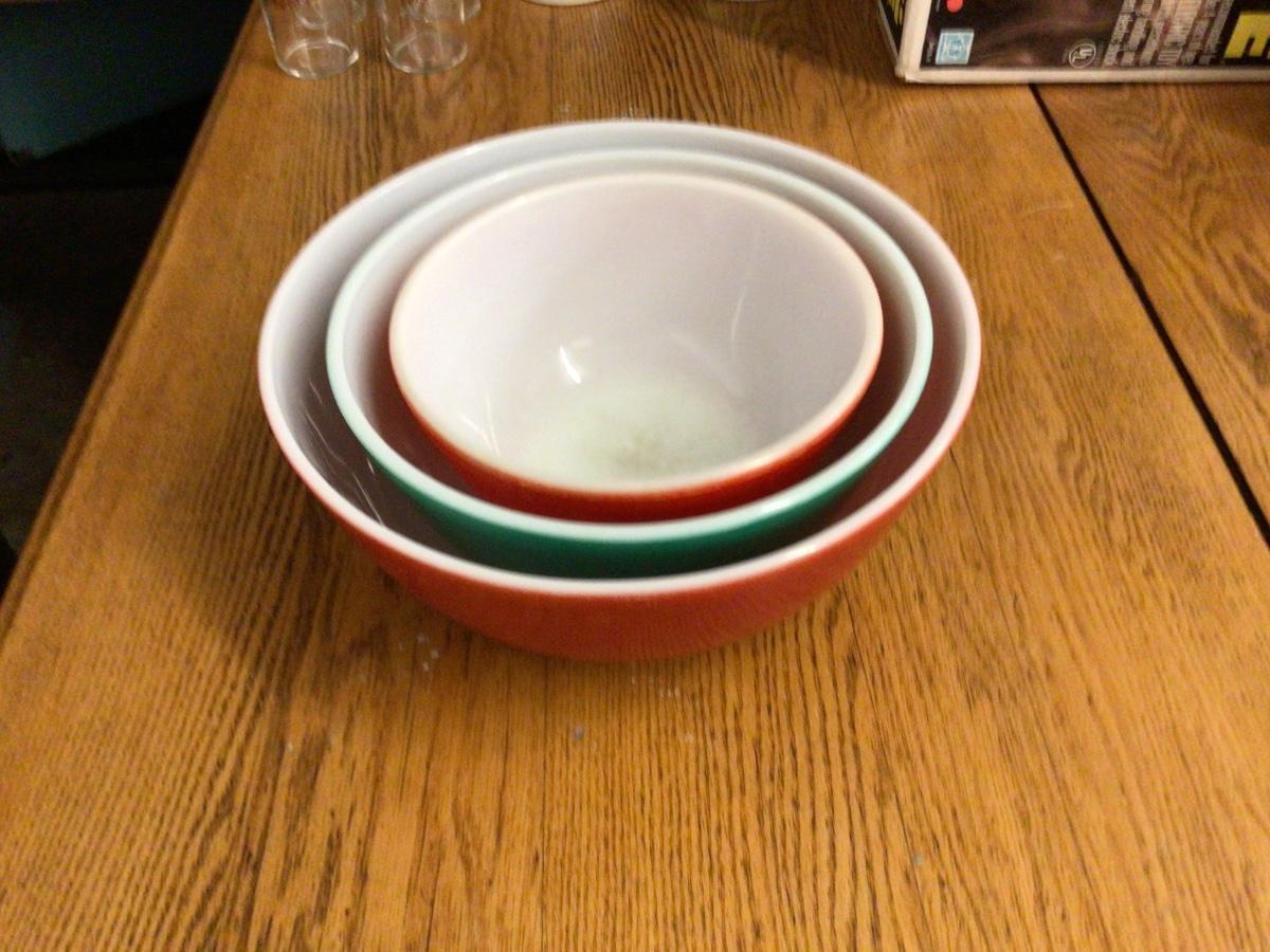 Set of three Pyrex nesting bowls. Red, green, and orange color. All used and have some normal wear. The smallest one has extra scuffing but not excessive.