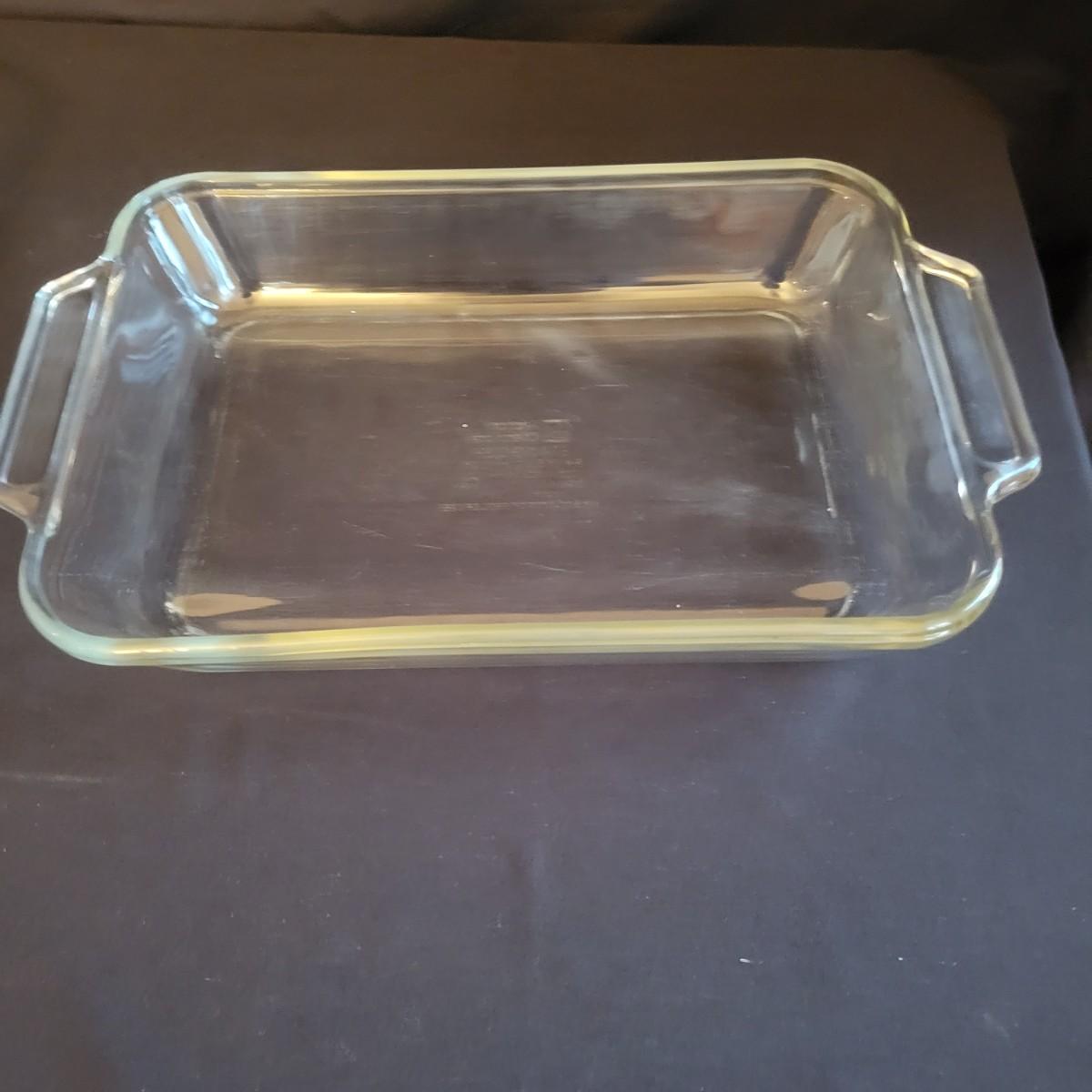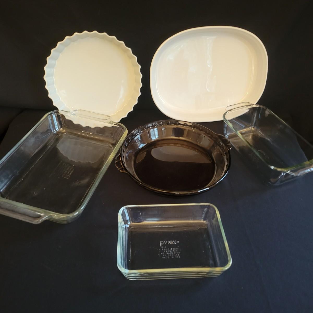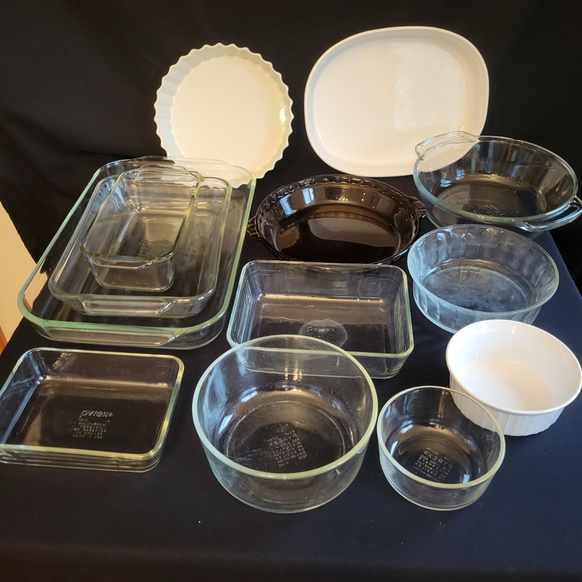 An assortment of baking dishes in a variety of shapes and sizes manufactured by Pyrex, Corning and Anchor. The largest Pyrex baking dish measures approximately 17.5" x 10.5" x 2.25"H. Dishes have no chips, but some have minor scratches or some clouding. Local pickup only