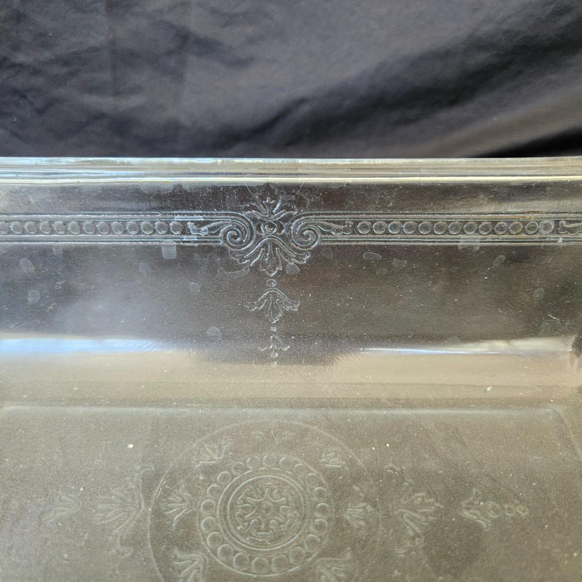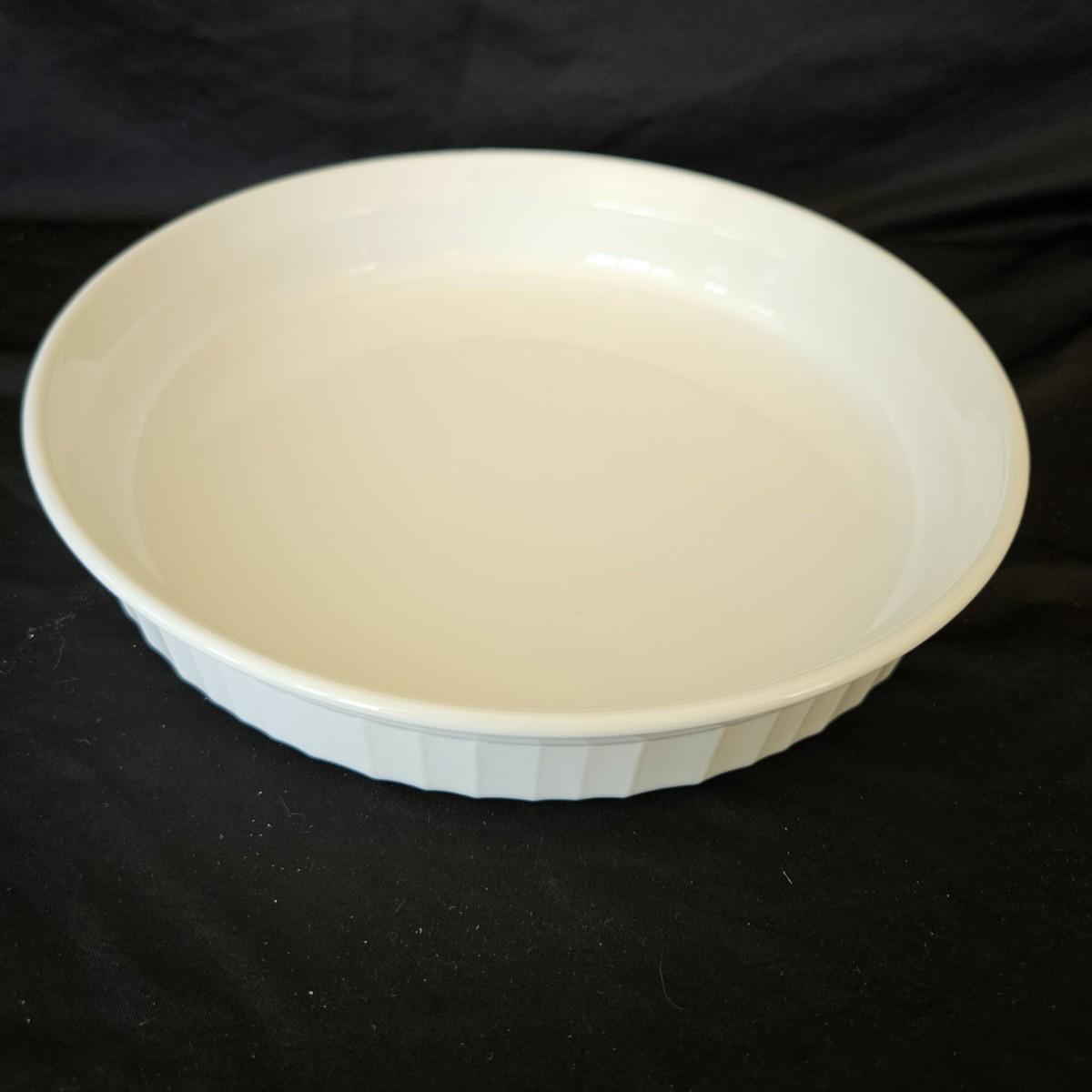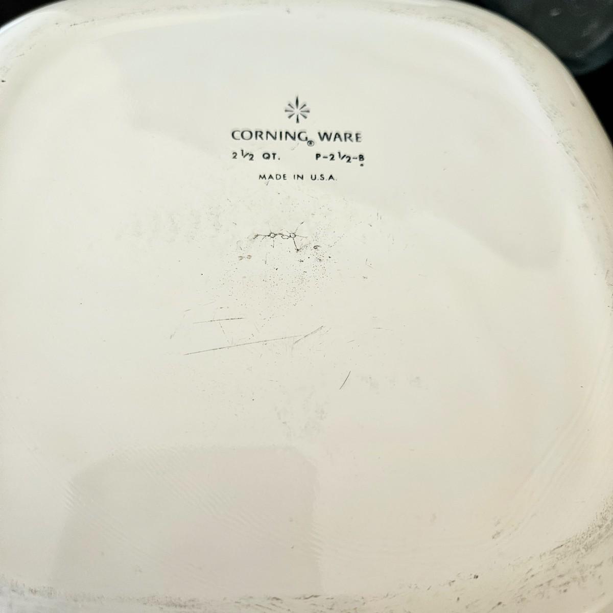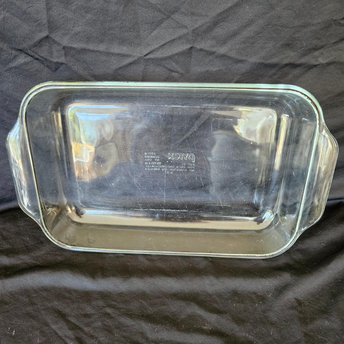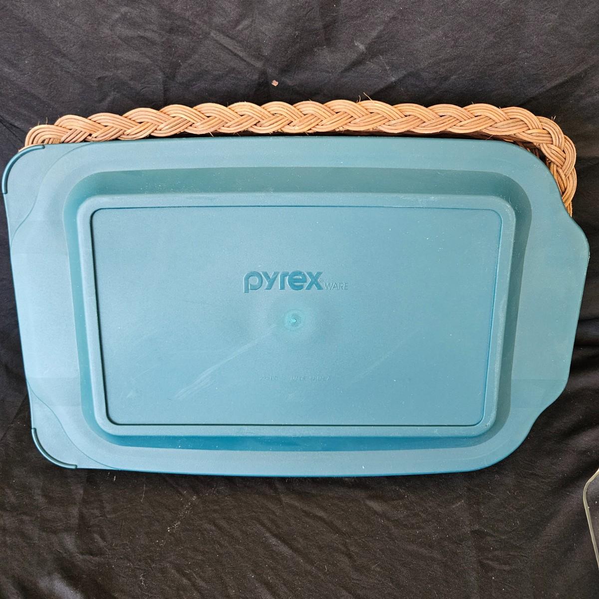 An assortment of baking dishes manufacturered by Pyrex, Corningware, Fire King and Anchor Hocking. There are 12 pieces in this lot, four of which have lids. Also includes an insulated Pyrex bag and faux wicker base. The largest Pyrex piece measures approximately 15.5" x 9.5" x 2.5"H. Local pickup only