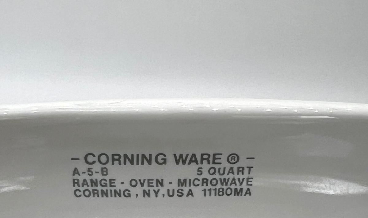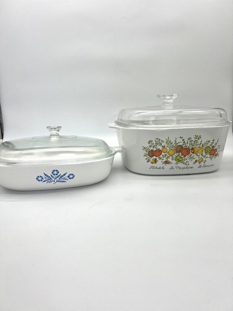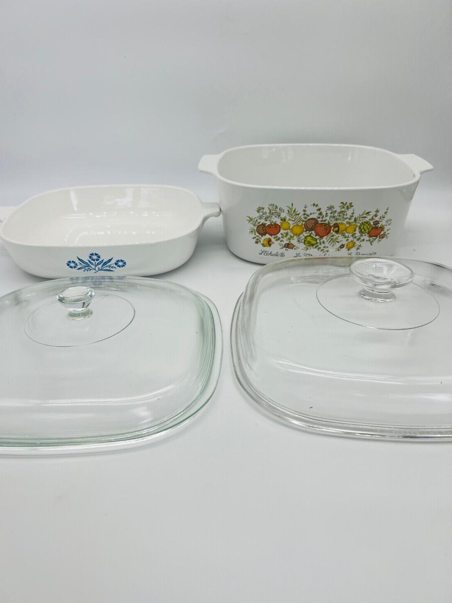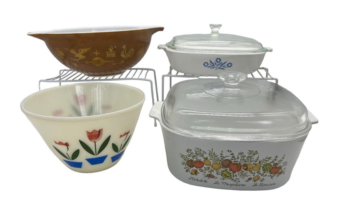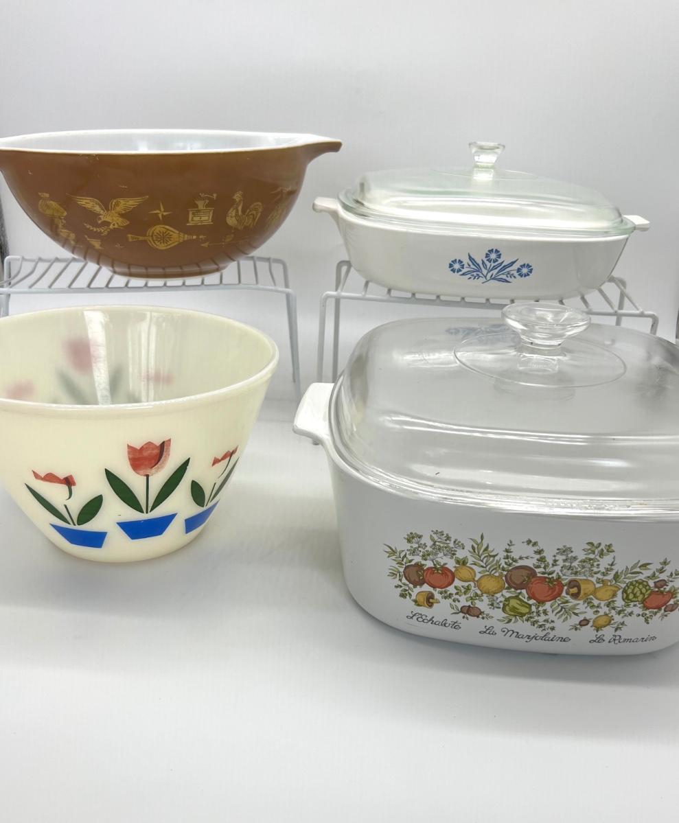 A little of each! Two pieces of Corning ware, 10 inch and 5 quart. Pyrex number 444. Four quart Fire king Bowl 5 1/2 inches tall. All show signs of use.