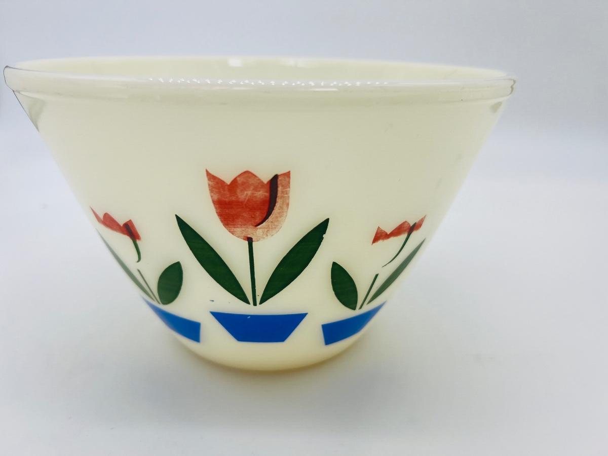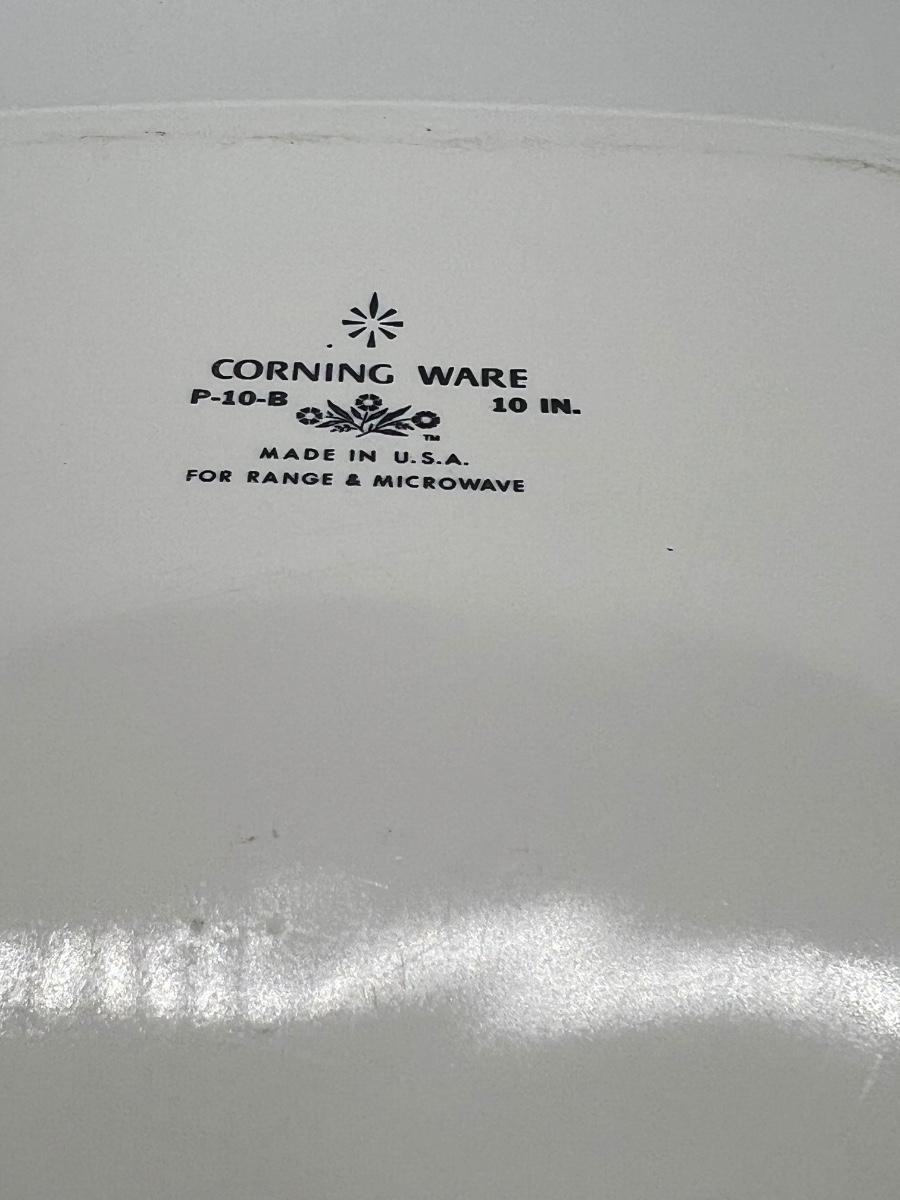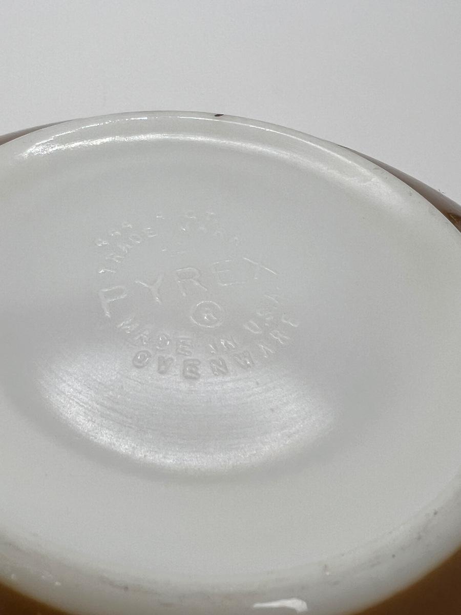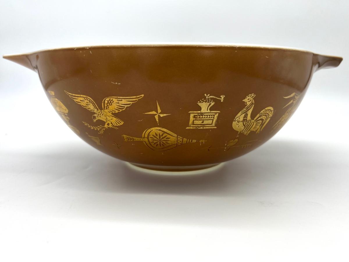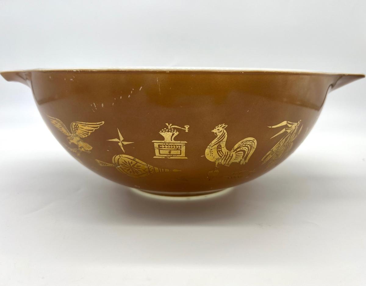 A little of each! Two pieces of Corning ware, 10 inch and 5 quart. Pyrex number 444. Four quart Fire king Bowl 5 1/2 inches tall. All show signs of use.