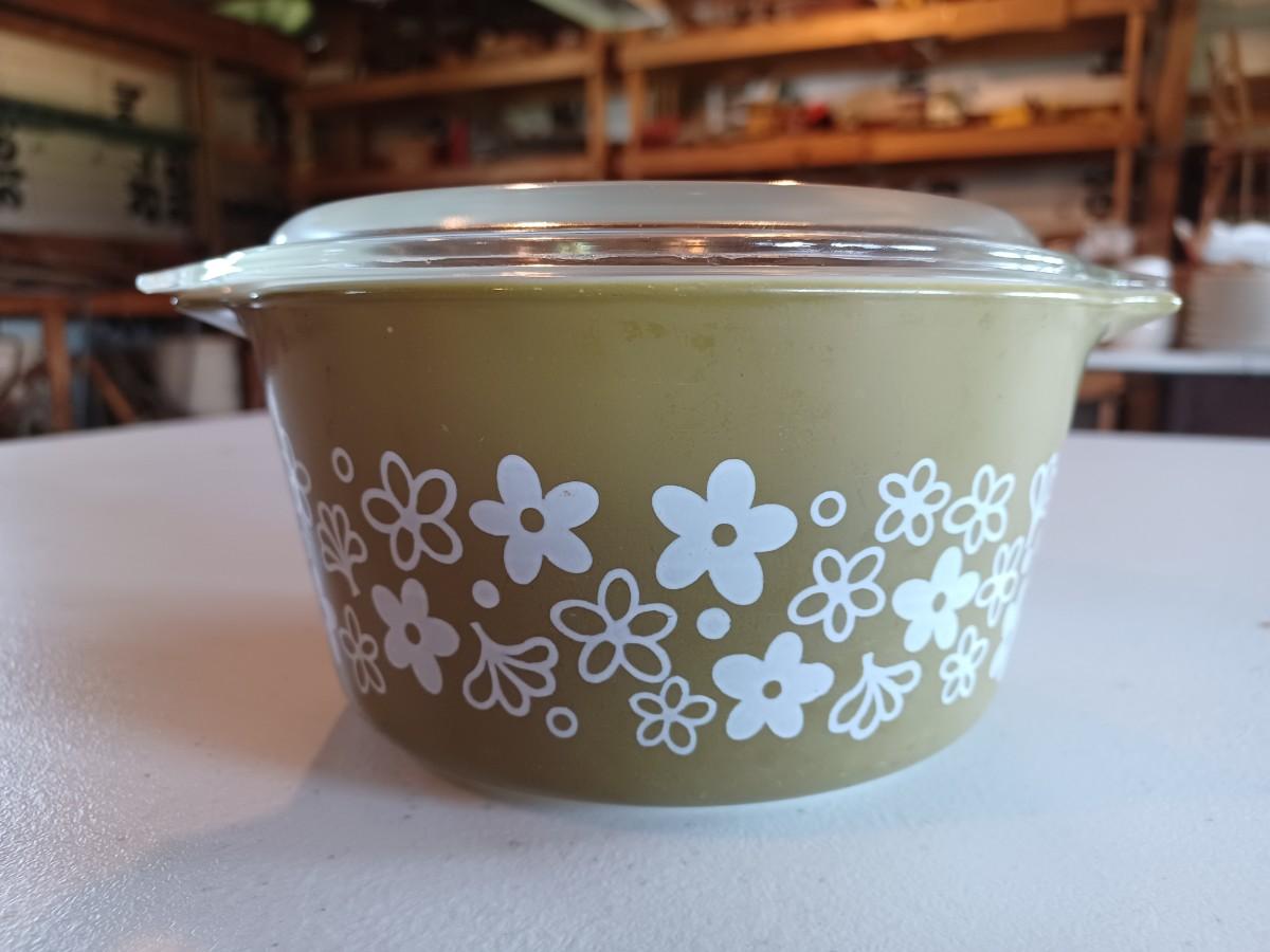 Pyrex Green Crazy Daisy 1 Quart Dish with Lid
