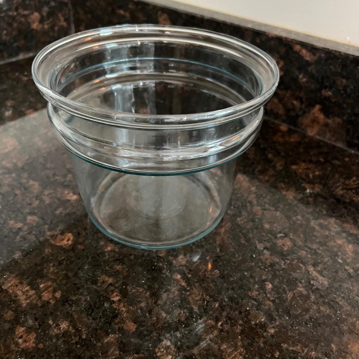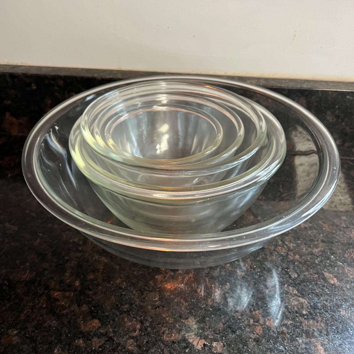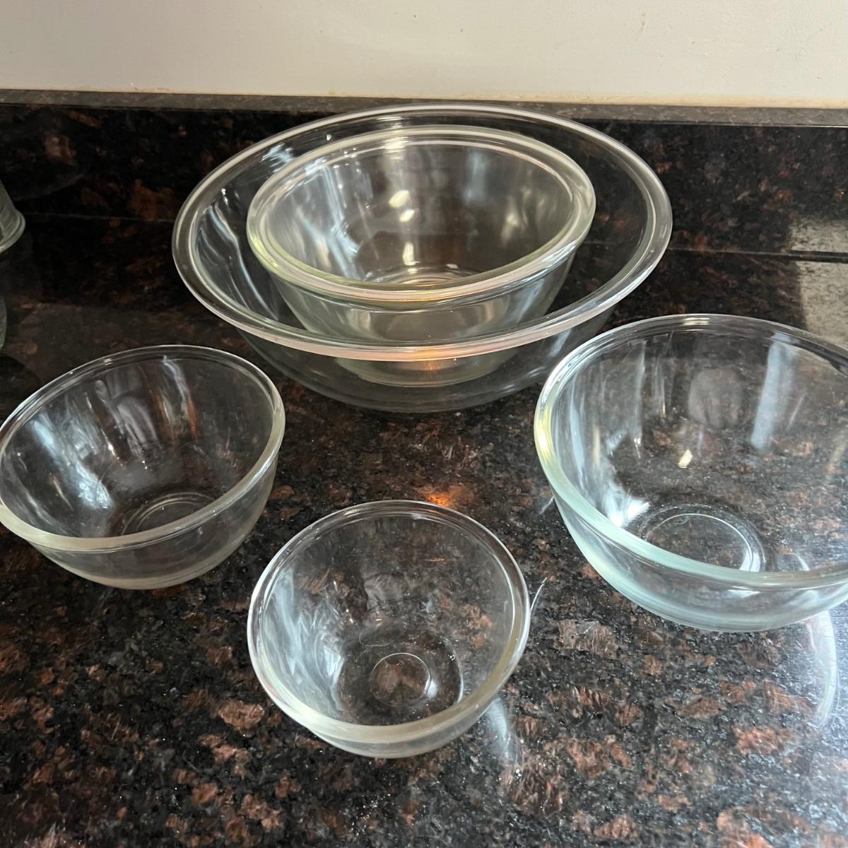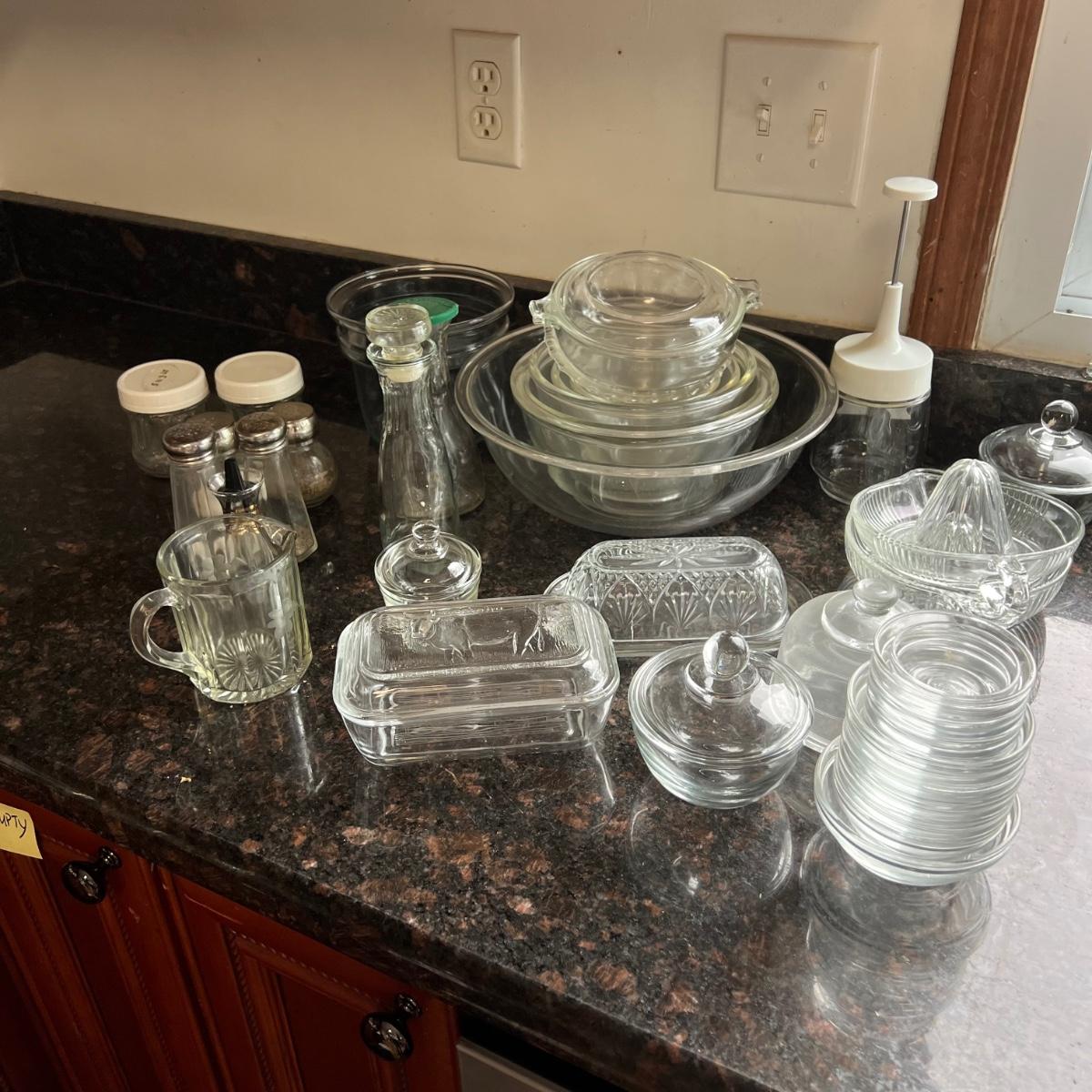 Very large assortment of glass dishes by Pyrex and more. There are twelve glass prep bowls, two covered butter dishes, a nested set of six mixing bowls the smallest measuring 4.75”D x 2.5”H and the largest is 12”D x 4.25”H, a round covered Pyrex dish measures approximately 5.5”D x 2”H and A small Pyrex pipe plate measures 6”D x 1”H, two glass juicers measure approximately 6”D and two matching covered glass bowls measure 4”D x 2.25”H, one glass chopping jar and two glass, salad dressing shaker/ storage containers as well as two sets of salt and pepper shakers, two clear glass containers with white plastic covers measure 2.25”D x 3.25”H, a small glass pitcher is 3”D x 4”H and a small covered container with lid and two covered glass jars, one 2.5”D x 2”H and one 4.25”D x 4.25”H. Last a large bowl that measures 6.5”D x 5.5”H.
