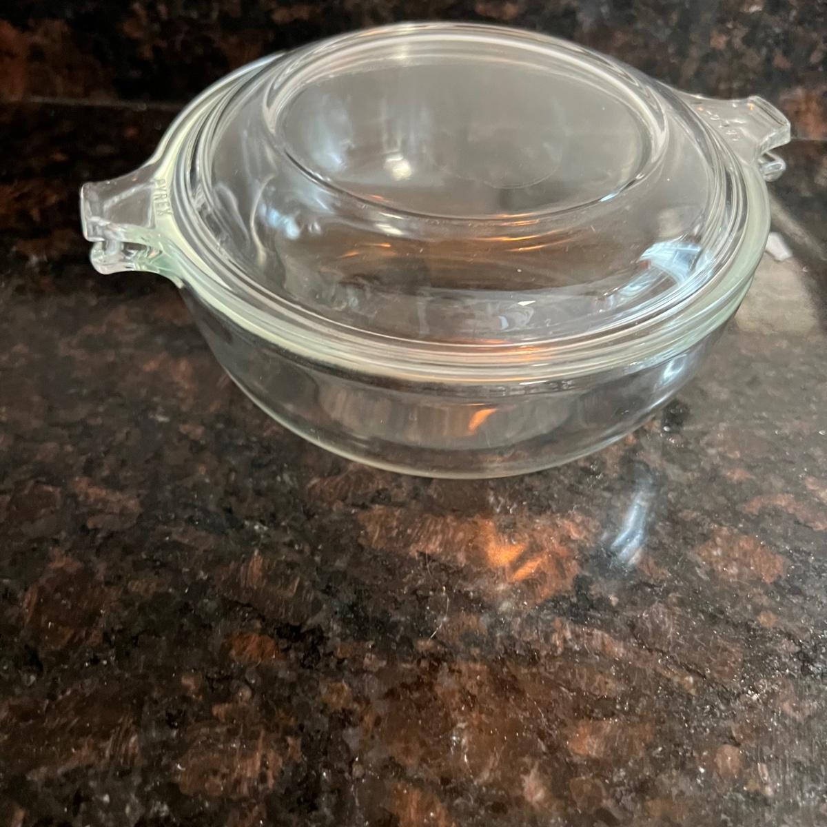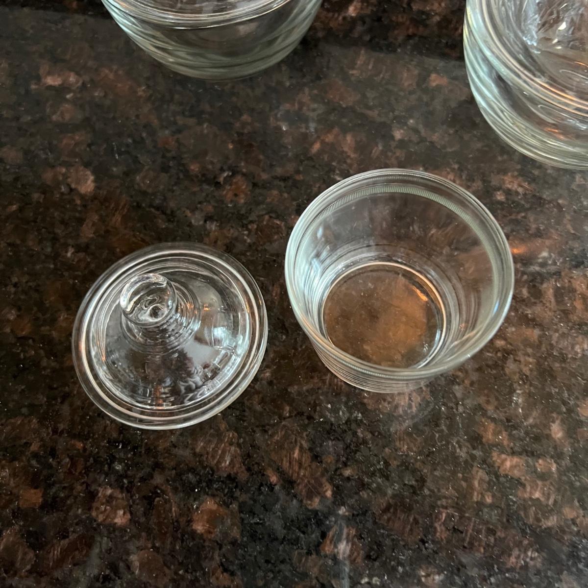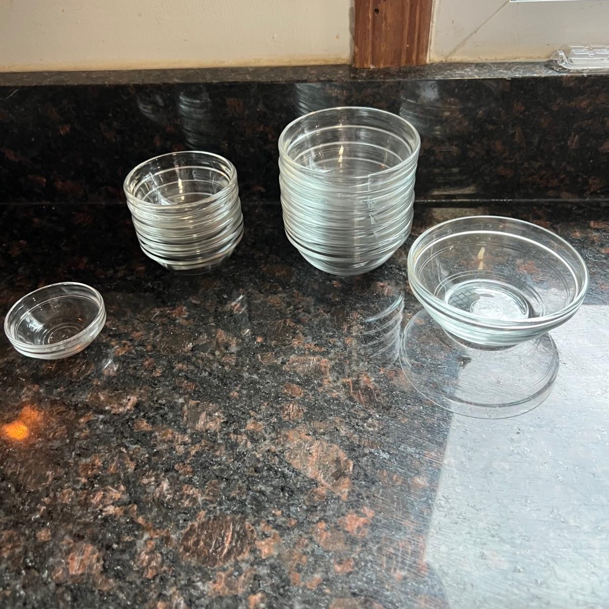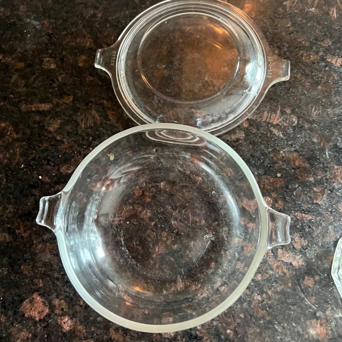 Very large assortment of glass dishes by Pyrex and more. There are twelve glass prep bowls, two covered butter dishes, a nested set of six mixing bowls the smallest measuring 4.75”D x 2.5”H and the largest is 12”D x 4.25”H, a round covered Pyrex dish measures approximately 5.5”D x 2”H and A small Pyrex pipe plate measures 6”D x 1”H, two glass juicers measure approximately 6”D and two matching covered glass bowls measure 4”D x 2.25”H, one glass chopping jar and two glass, salad dressing shaker/ storage containers as well as two sets of salt and pepper shakers, two clear glass containers with white plastic covers measure 2.25”D x 3.25”H, a small glass pitcher is 3”D x 4”H and a small covered container with lid and two covered glass jars, one 2.5”D x 2”H and one 4.25”D x 4.25”H. Last a large bowl that measures 6.5”D x 5.5”H.
