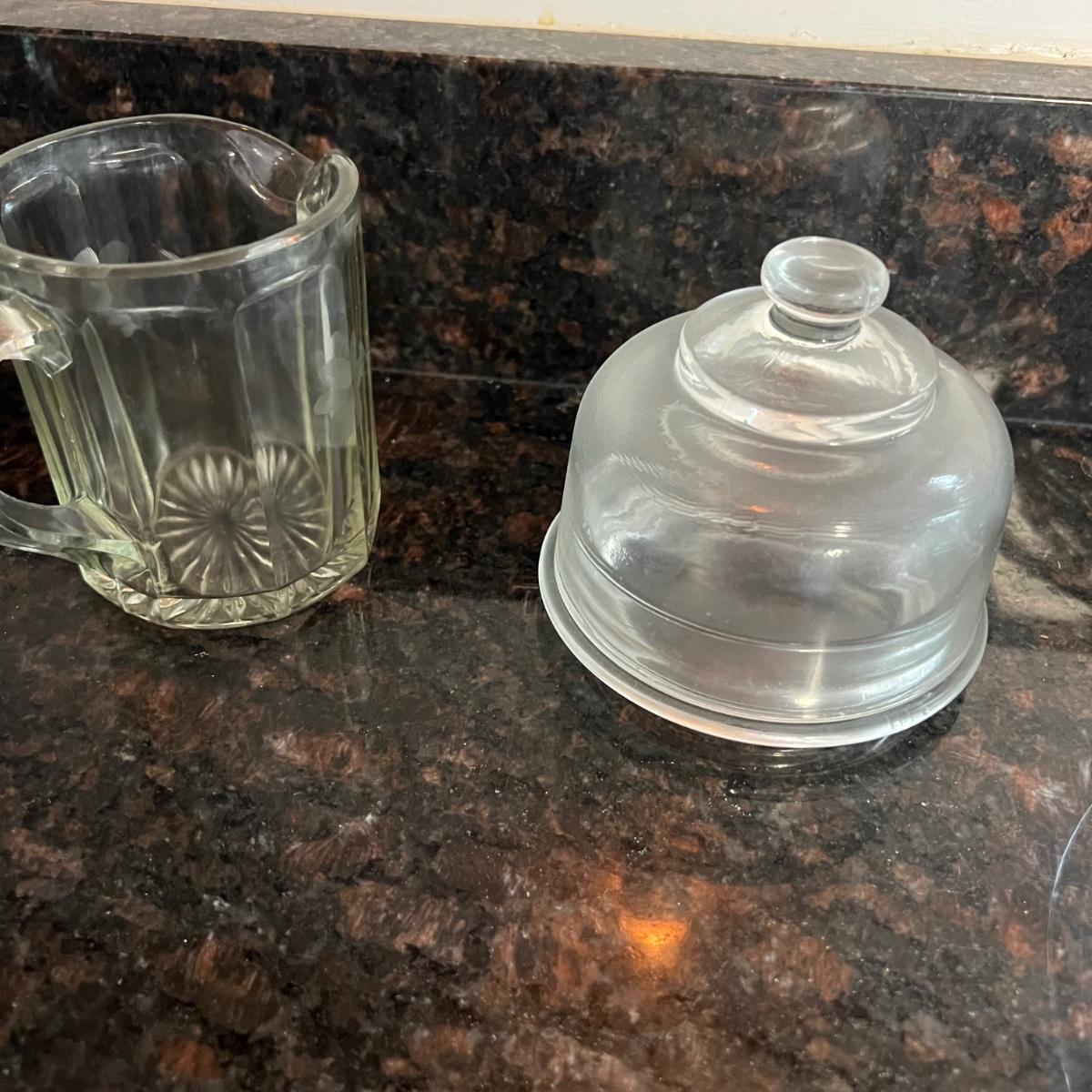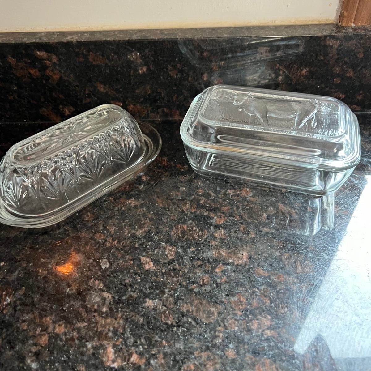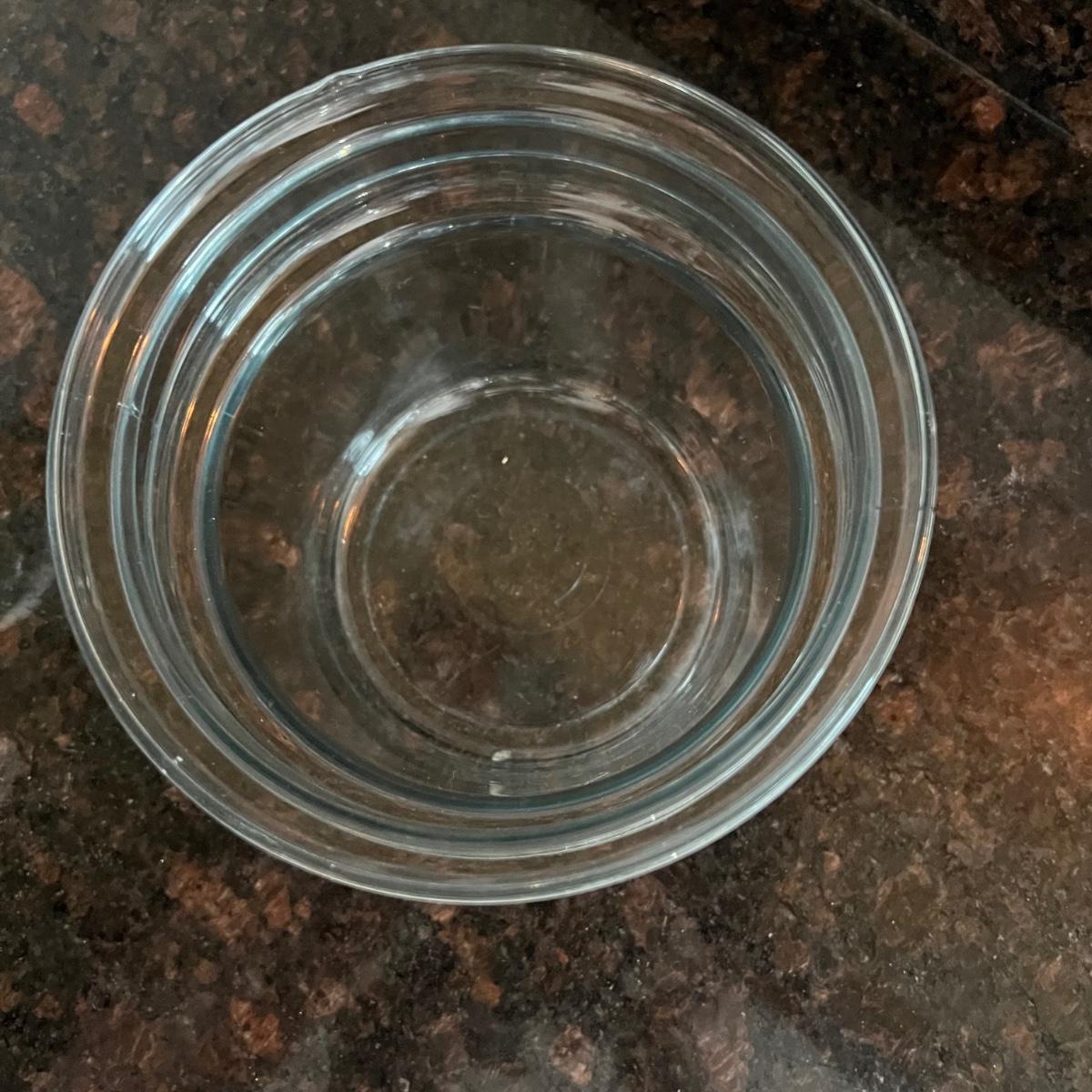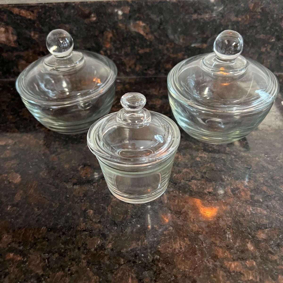 Very large assortment of glass dishes by Pyrex and more. There are twelve glass prep bowls, two covered butter dishes, a nested set of six mixing bowls the smallest measuring 4.75”D x 2.5”H and the largest is 12”D x 4.25”H, a round covered Pyrex dish measures approximately 5.5”D x 2”H and A small Pyrex pipe plate measures 6”D x 1”H, two glass juicers measure approximately 6”D and two matching covered glass bowls measure 4”D x 2.25”H, one glass chopping jar and two glass, salad dressing shaker/ storage containers as well as two sets of salt and pepper shakers, two clear glass containers with white plastic covers measure 2.25”D x 3.25”H, a small glass pitcher is 3”D x 4”H and a small covered container with lid and two covered glass jars, one 2.5”D x 2”H and one 4.25”D x 4.25”H. Last a large bowl that measures 6.5”D x 5.5”H.