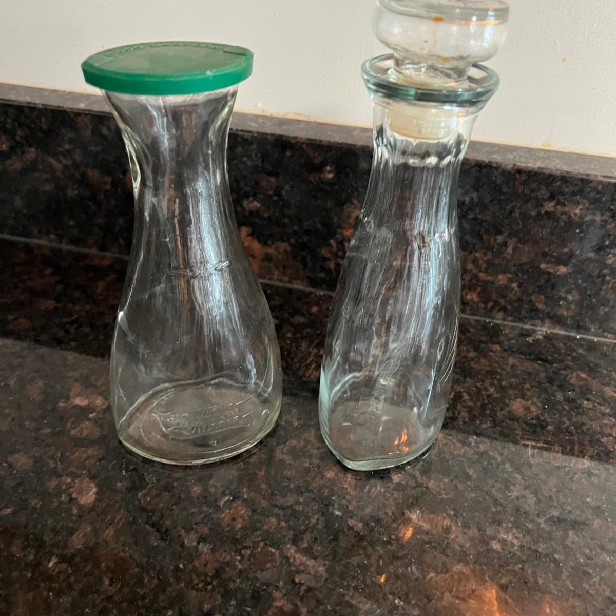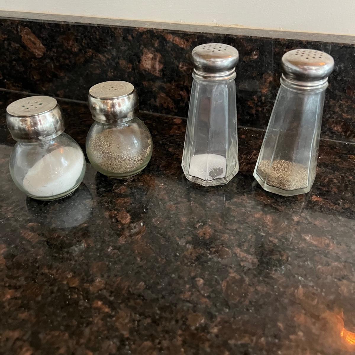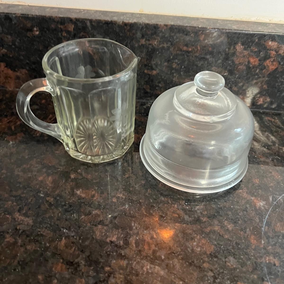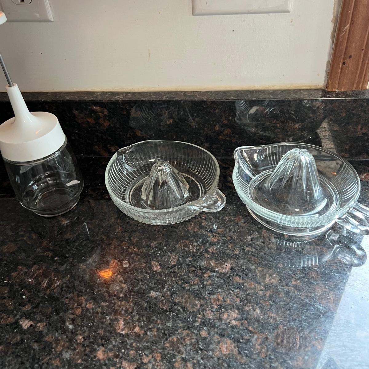 Very large assortment of glass dishes by Pyrex and more. There are twelve glass prep bowls, two covered butter dishes, a nested set of six mixing bowls the smallest measuring 4.75”D x 2.5”H and the largest is 12”D x 4.25”H, a round covered Pyrex dish measures approximately 5.5”D x 2”H and A small Pyrex pipe plate measures 6”D x 1”H, two glass juicers measure approximately 6”D and two matching covered glass bowls measure 4”D x 2.25”H, one glass chopping jar and two glass, salad dressing shaker/ storage containers as well as two sets of salt and pepper shakers, two clear glass containers with white plastic covers measure 2.25”D x 3.25”H, a small glass pitcher is 3”D x 4”H and a small covered container with lid and two covered glass jars, one 2.5”D x 2”H and one 4.25”D x 4.25”H. Last a large bowl that measures 6.5”D x 5.5”H.