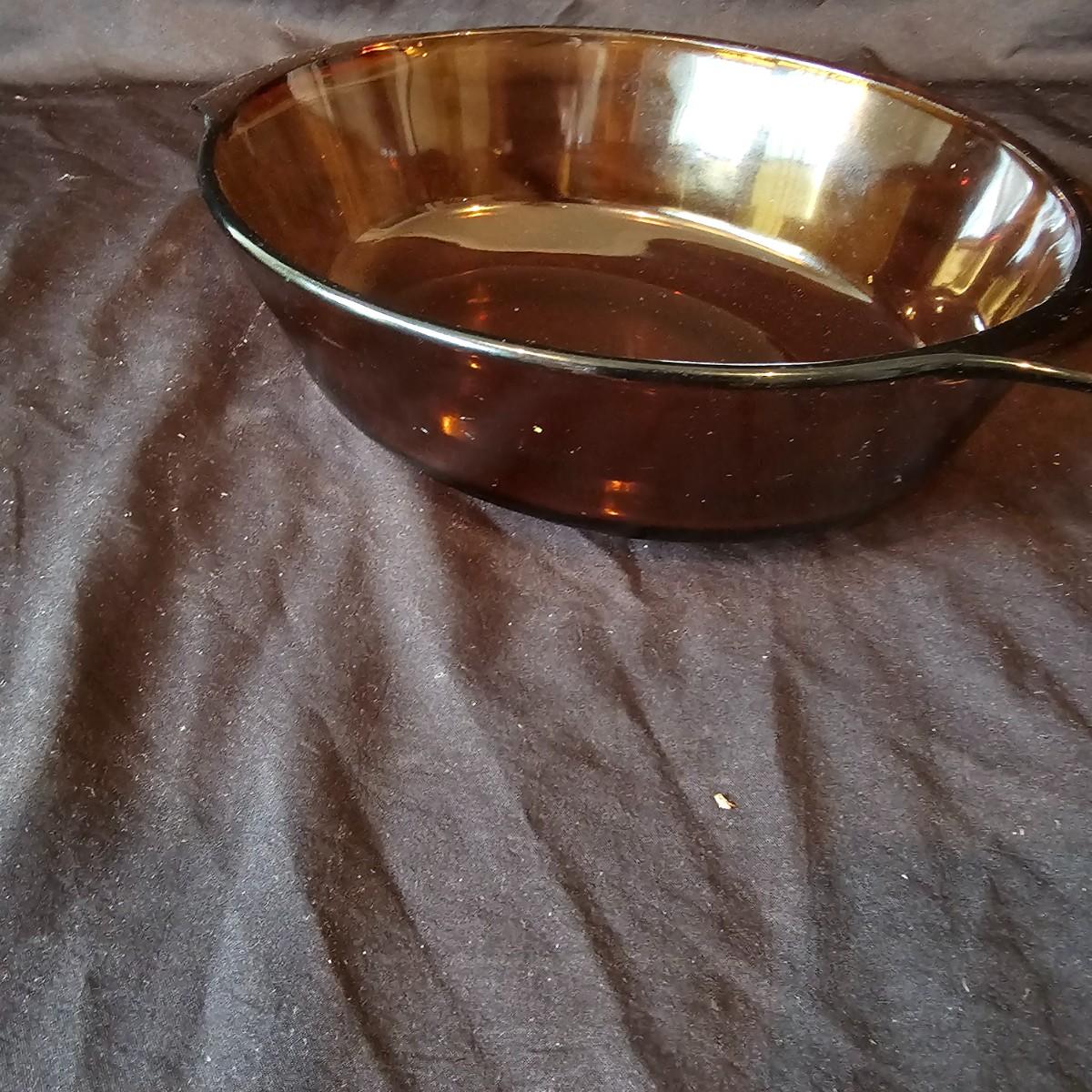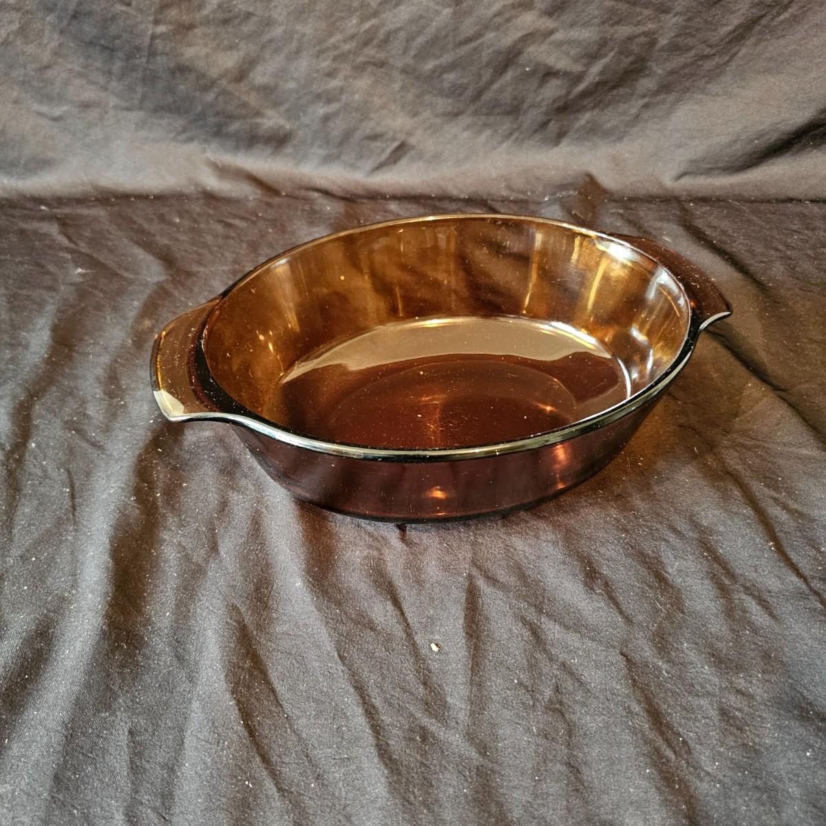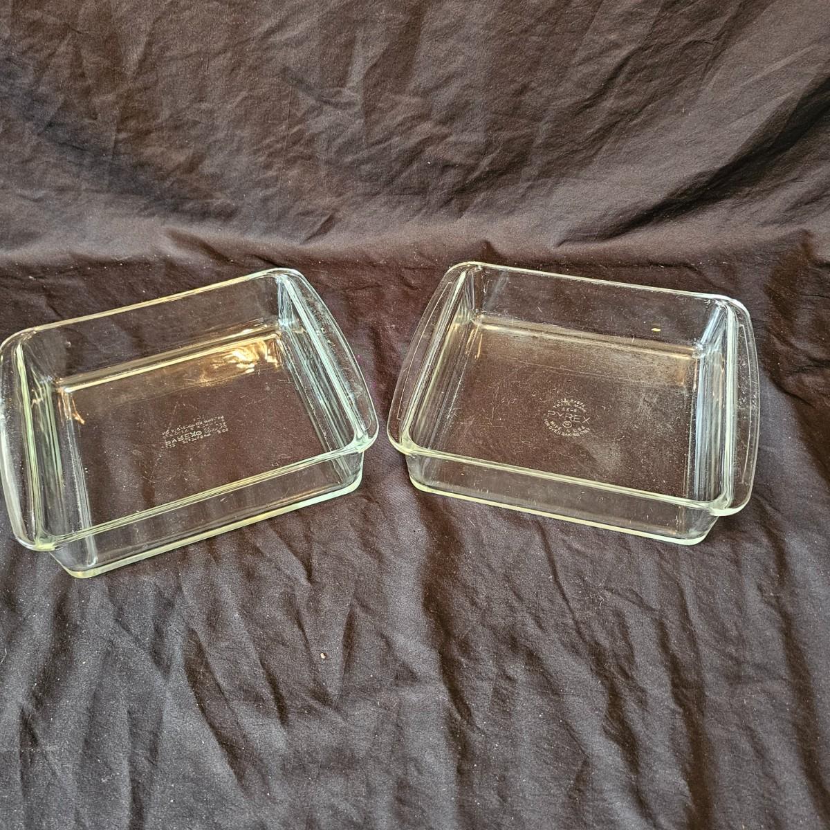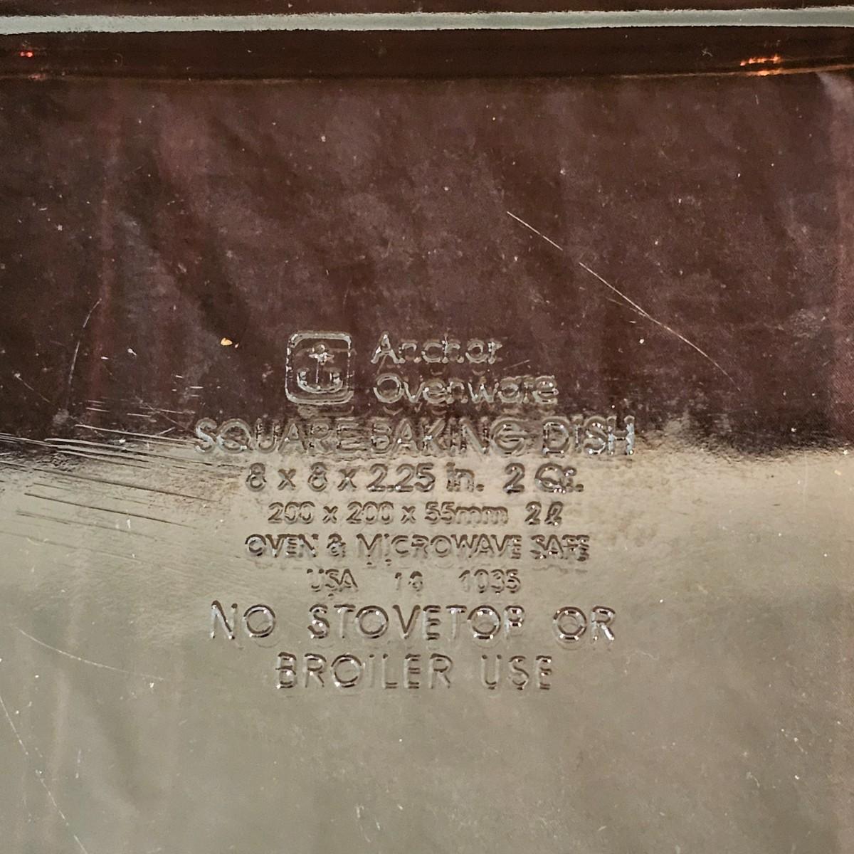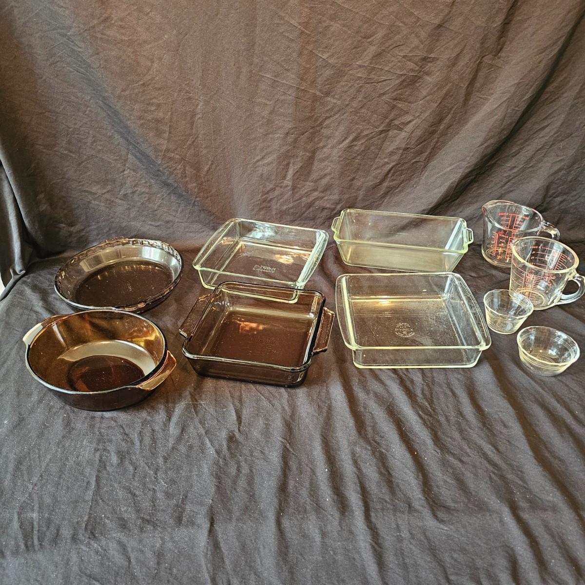 Clear and also brown glass bakeware by Pyrex and Anchor Hocking. Clear square items are 8.5" x 10". Pie plate is 10"D. Clear oblong is 12" x 5.5" x 3"H. Large measuring cup is 6.25" x 4"H. All items marked with heralds. See photos for details. Local pickup only.
