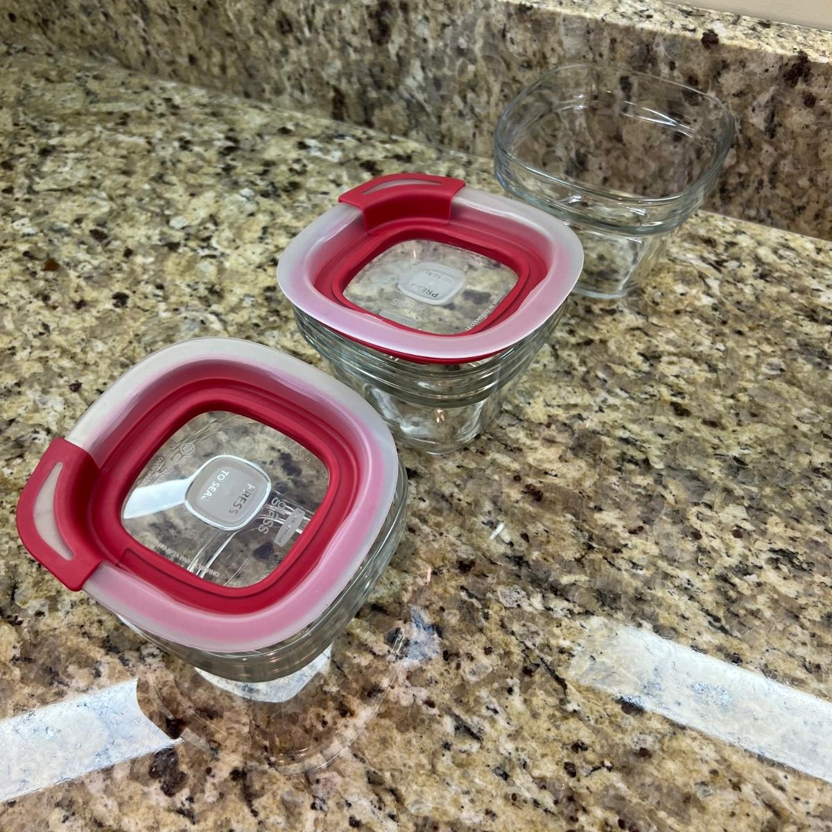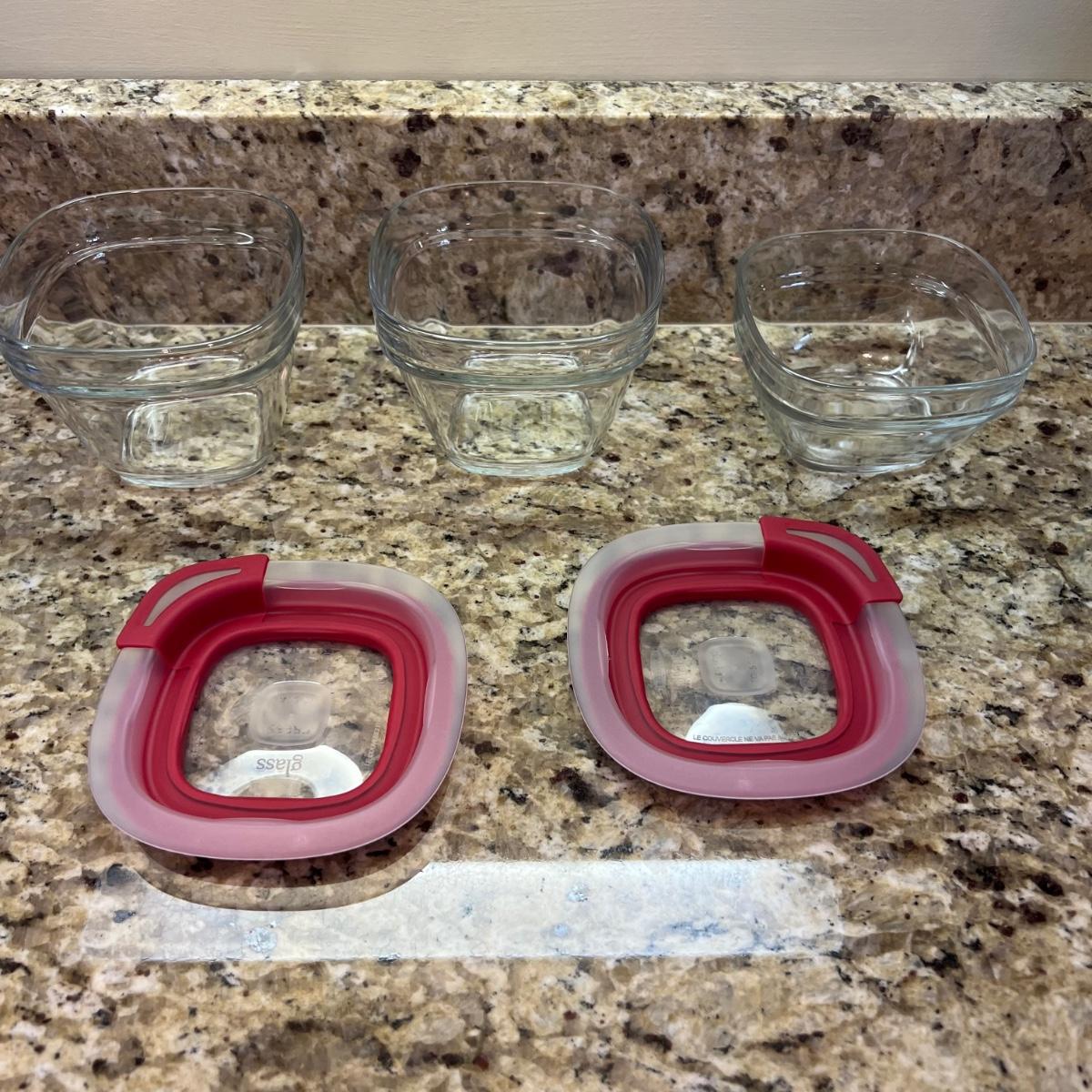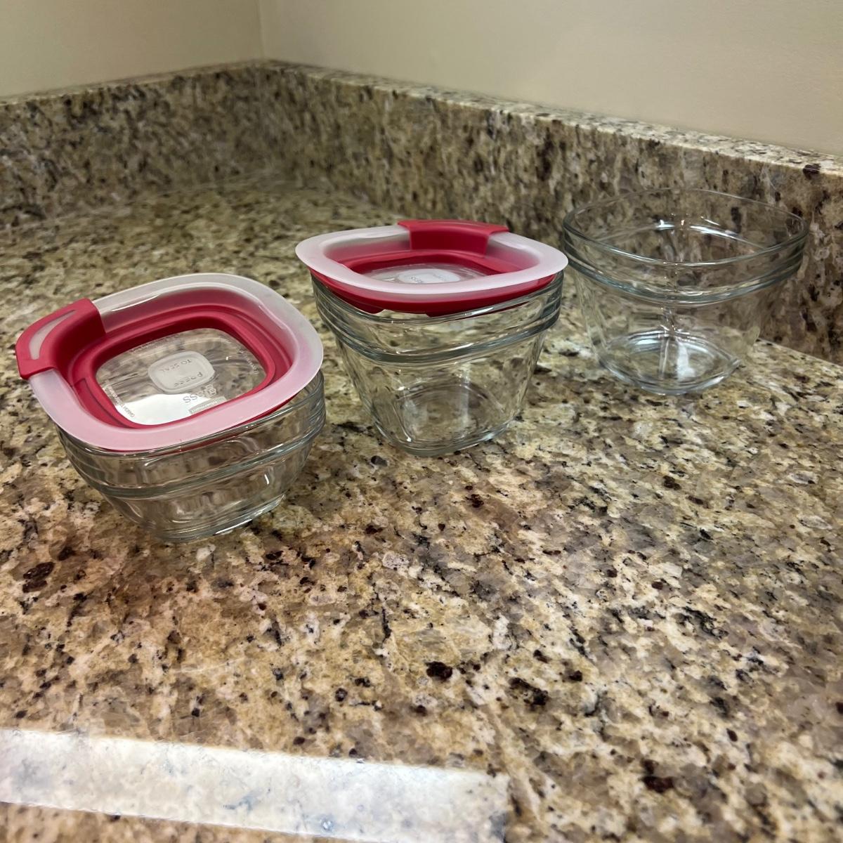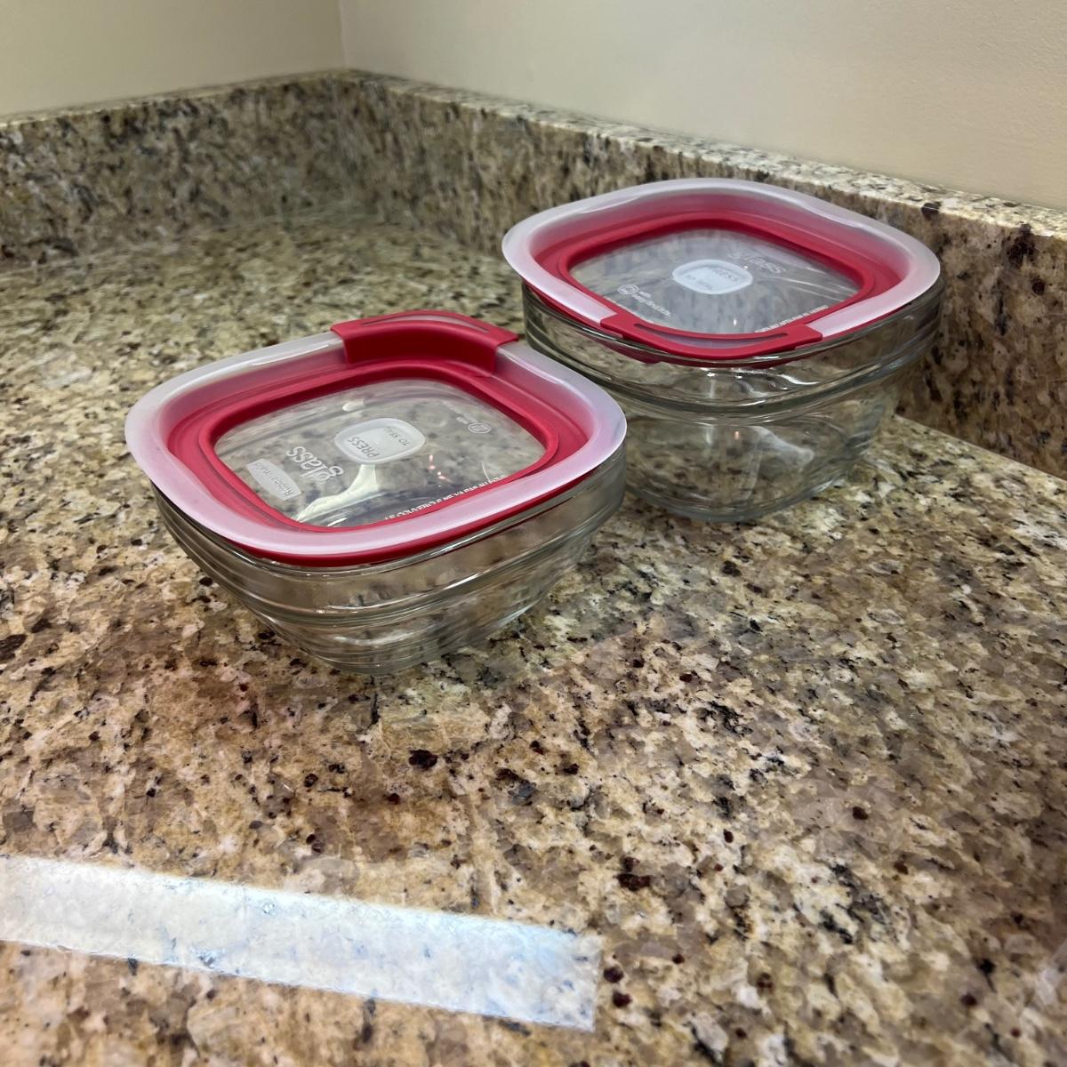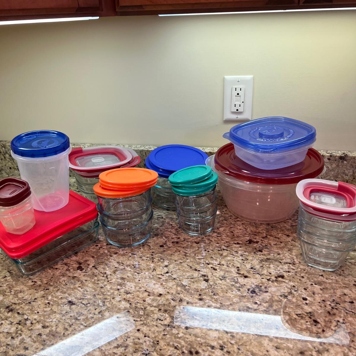 An assortment of glass and plastic storage containers. Two Rubbermaid, 1.5C square glass storage containers and one 1 cup, with 2 lids. Three round two cup glass containers with lids, three round 1 cup containers with lids, two rectangle 3 cup glass containers with lids, two round 4 cup glass containers with lids and one square glass 4 cup and one square glass 4.5 cup, both with lids. Also included are two plastic round containers with lids and two square containers with lids, one round container with lid, and two very small, 4 ounce plastic containers with matching lids.