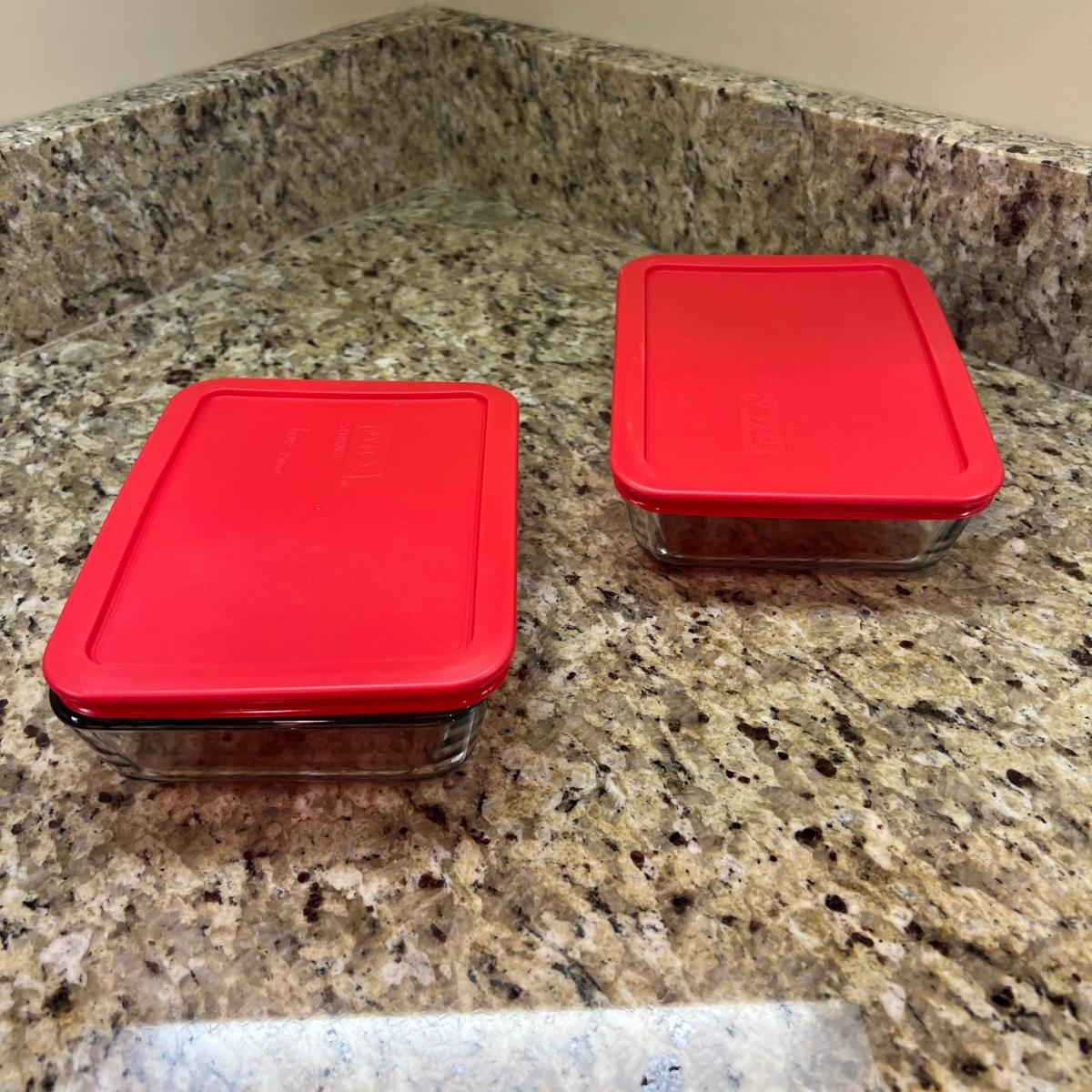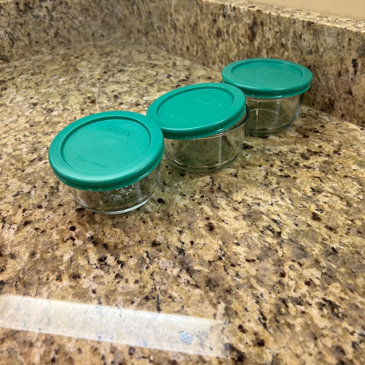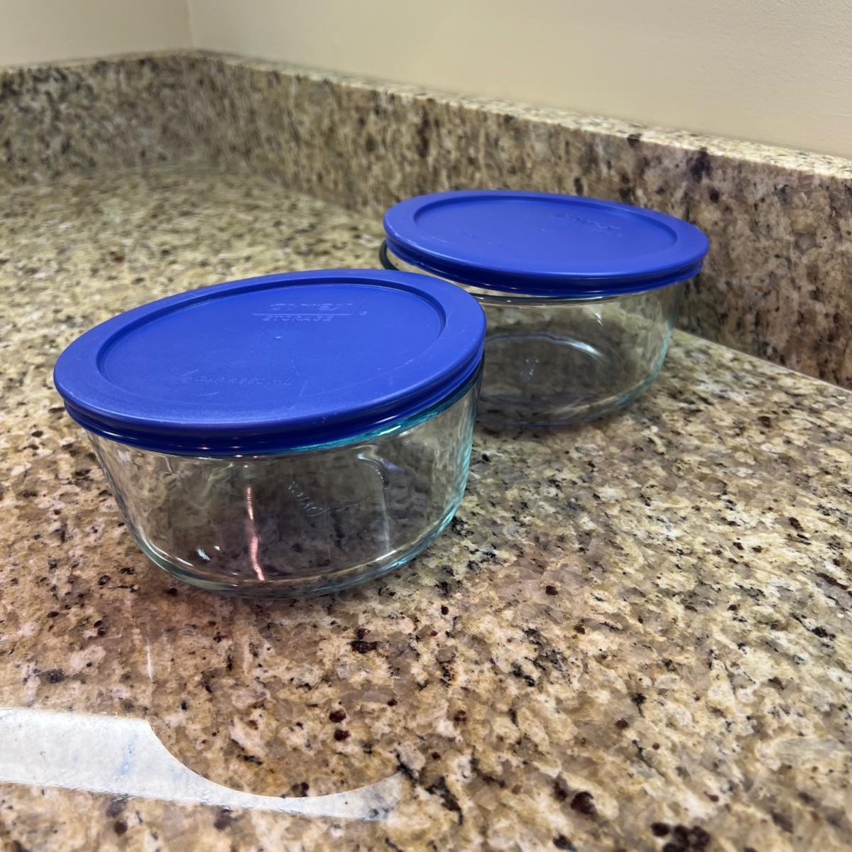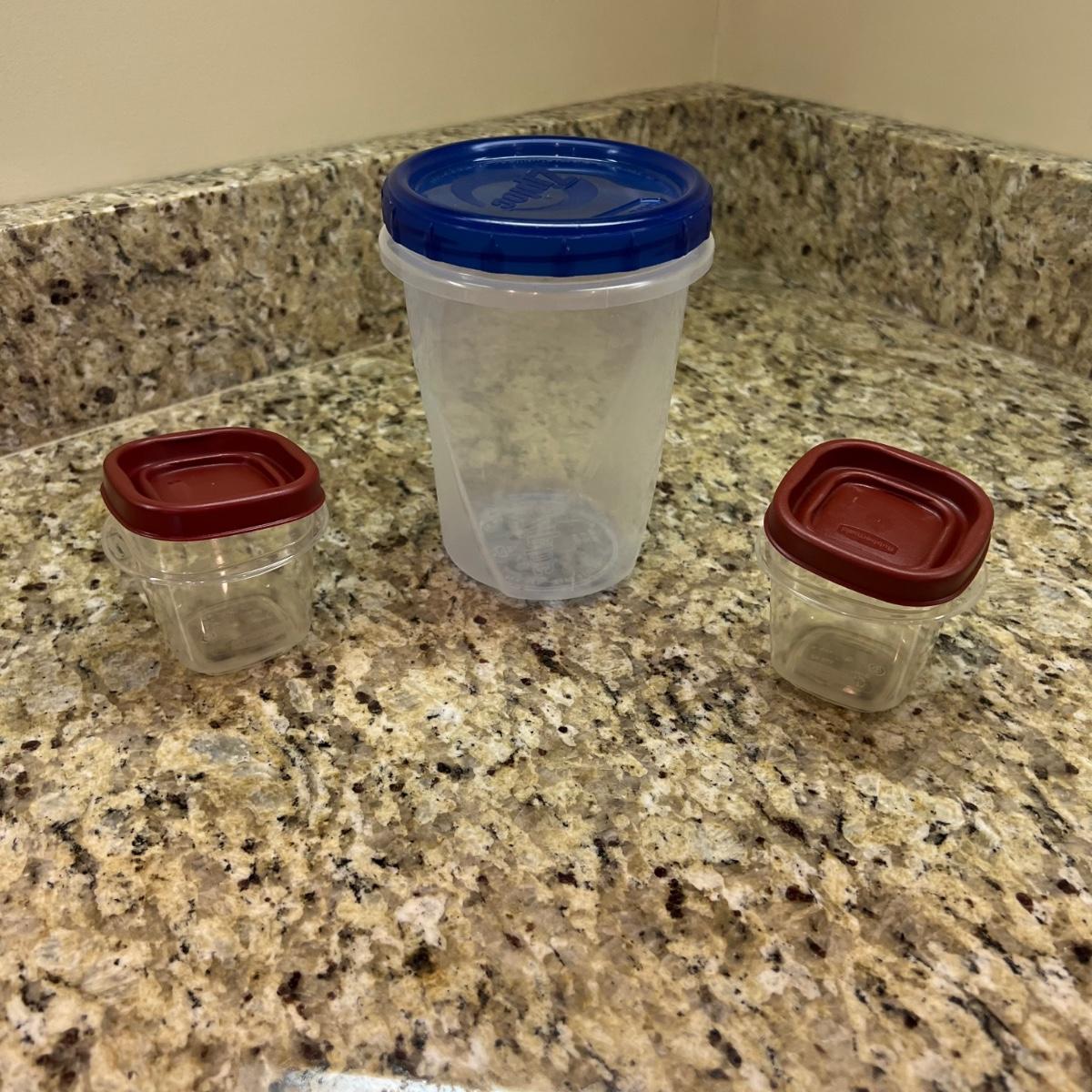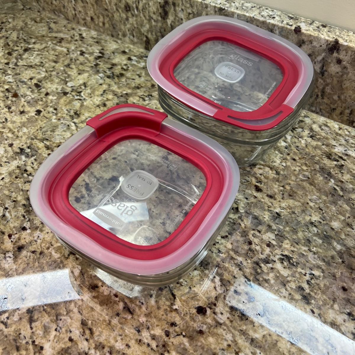 An assortment of glass and plastic storage containers. Two Rubbermaid, 1.5C square glass storage containers and one 1 cup, with 2 lids. Three round two cup glass containers with lids, three round 1 cup containers with lids, two rectangle 3 cup glass containers with lids, two round 4 cup glass containers with lids and one square glass 4 cup and one square glass 4.5 cup, both with lids. Also included are two plastic round containers with lids and two square containers with lids, one round container with lid, and two very small, 4 ounce plastic containers with matching lids.