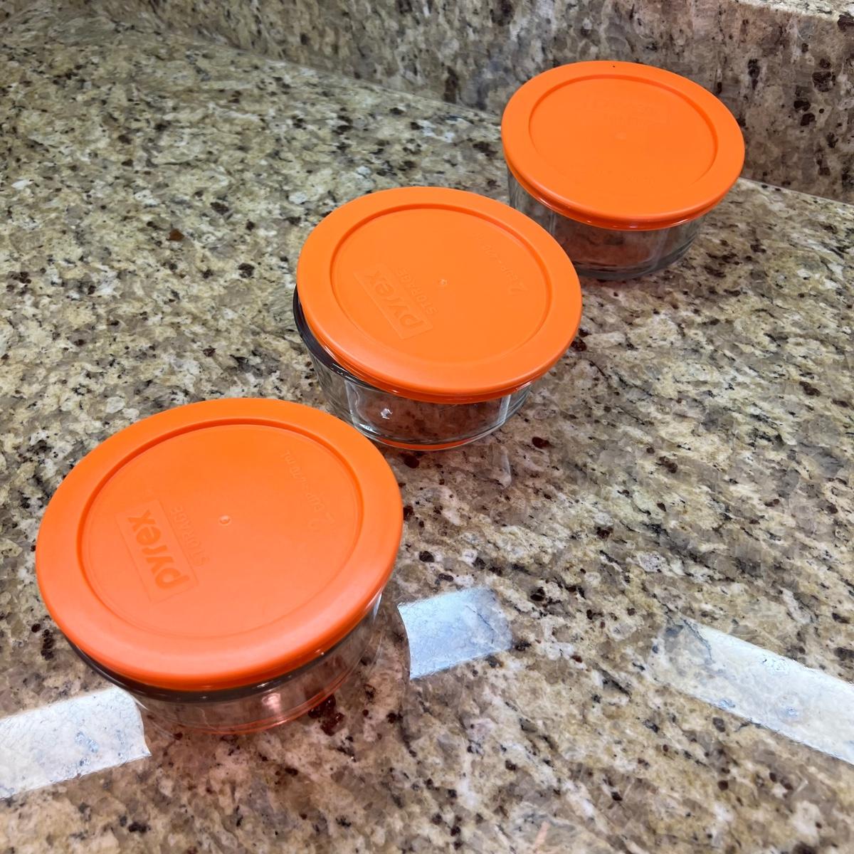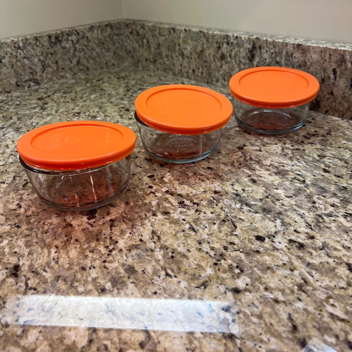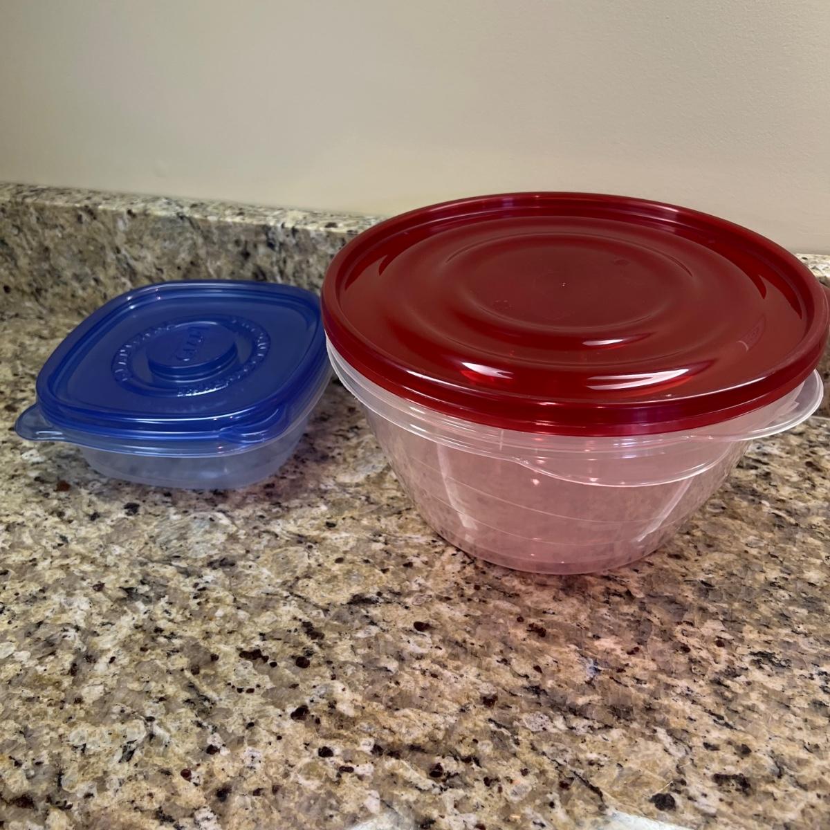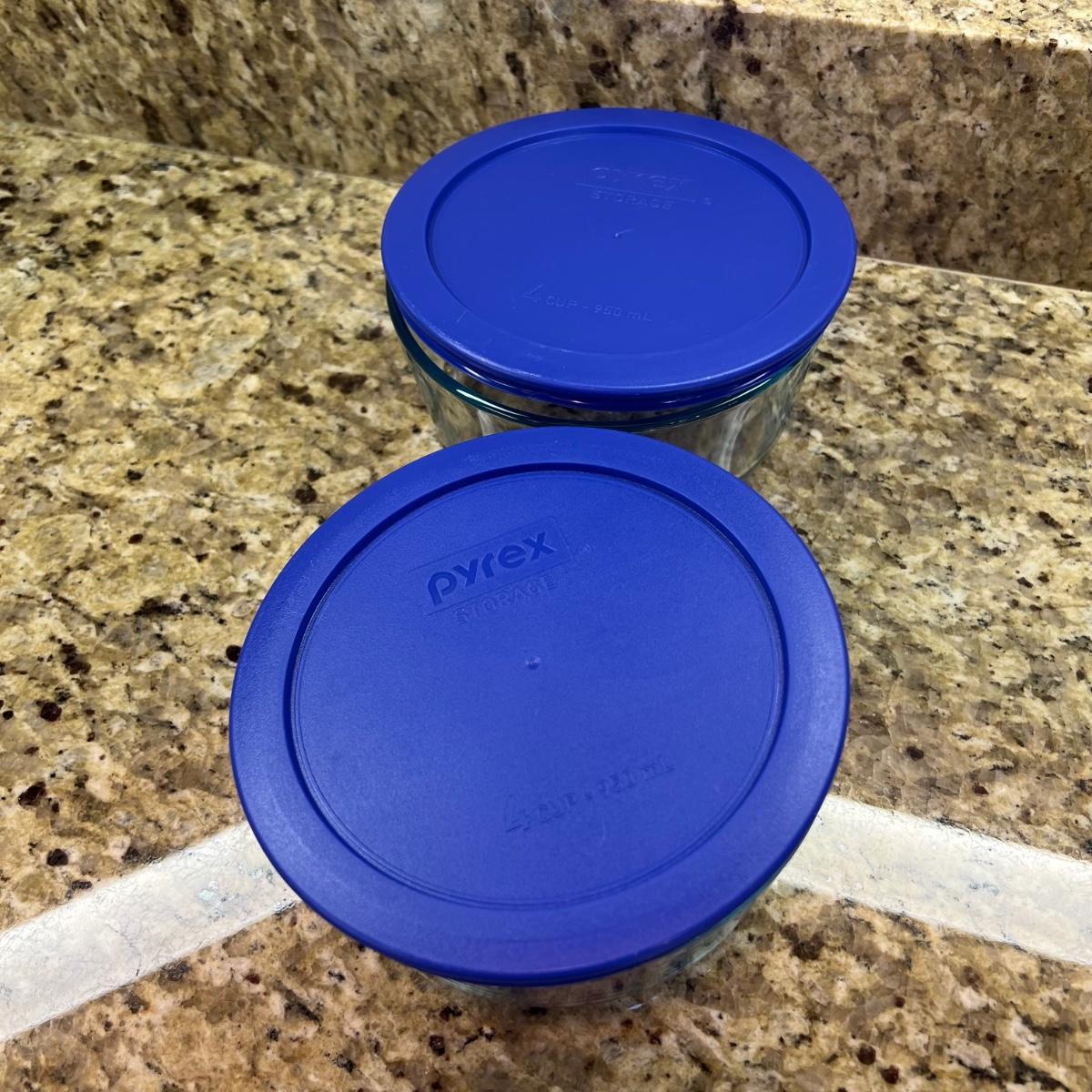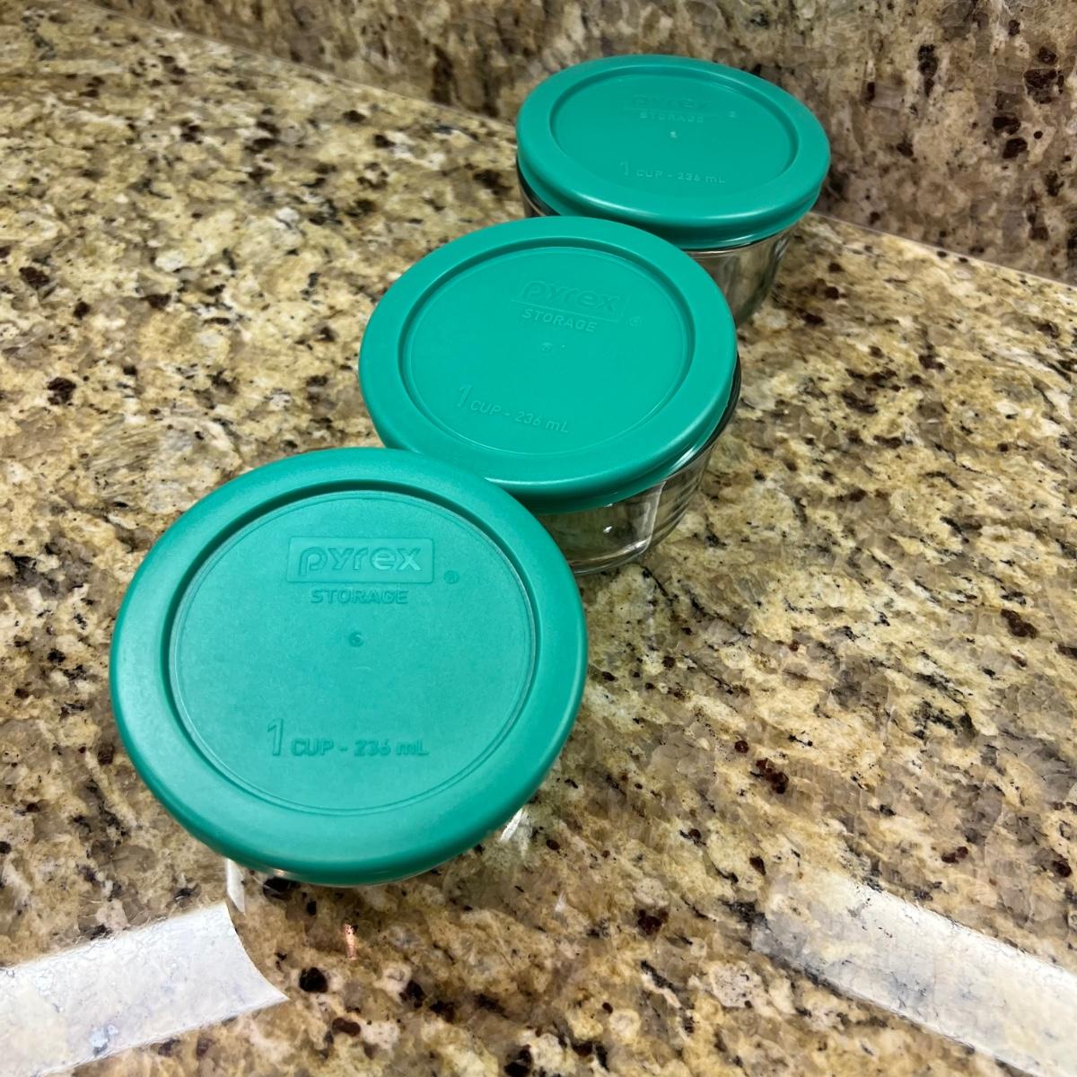 An assortment of glass and plastic storage containers. Two Rubbermaid, 1.5C square glass storage containers and one 1 cup, with 2 lids. Three round two cup glass containers with lids, three round 1 cup containers with lids, two rectangle 3 cup glass containers with lids, two round 4 cup glass containers with lids and one square glass 4 cup and one square glass 4.5 cup, both with lids. Also included are two plastic round containers with lids and two square containers with lids, one round container with lid, and two very small, 4 ounce plastic containers with matching lids.