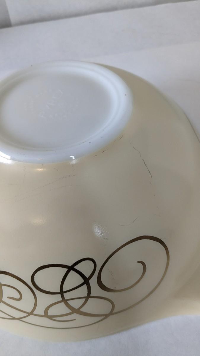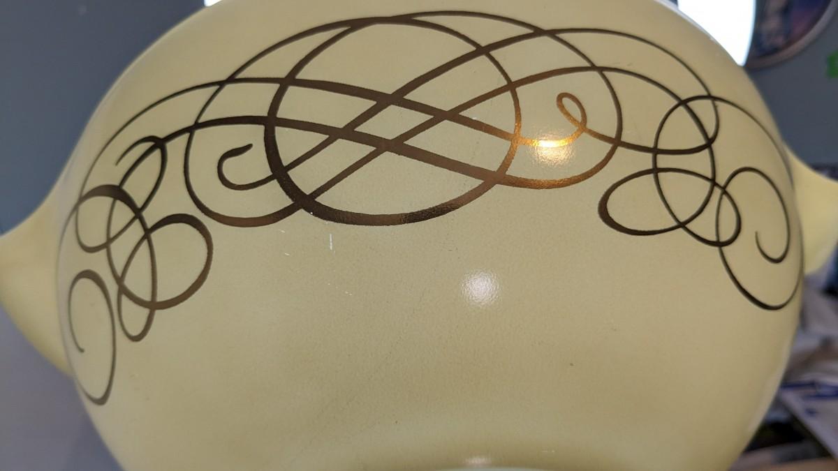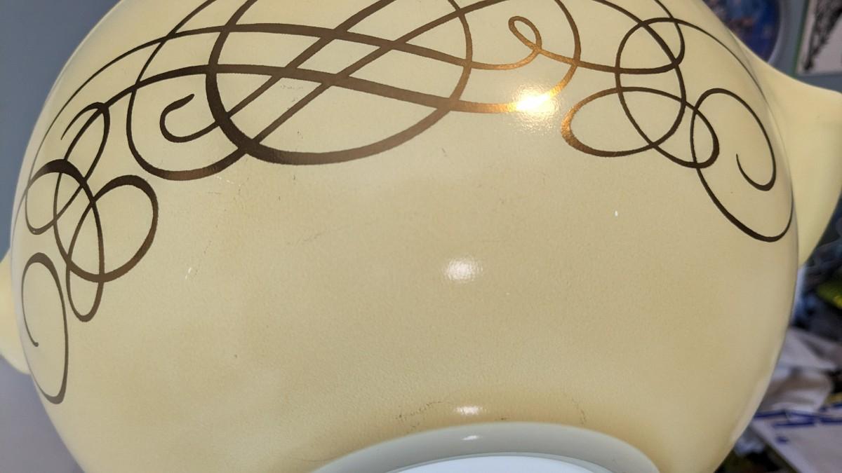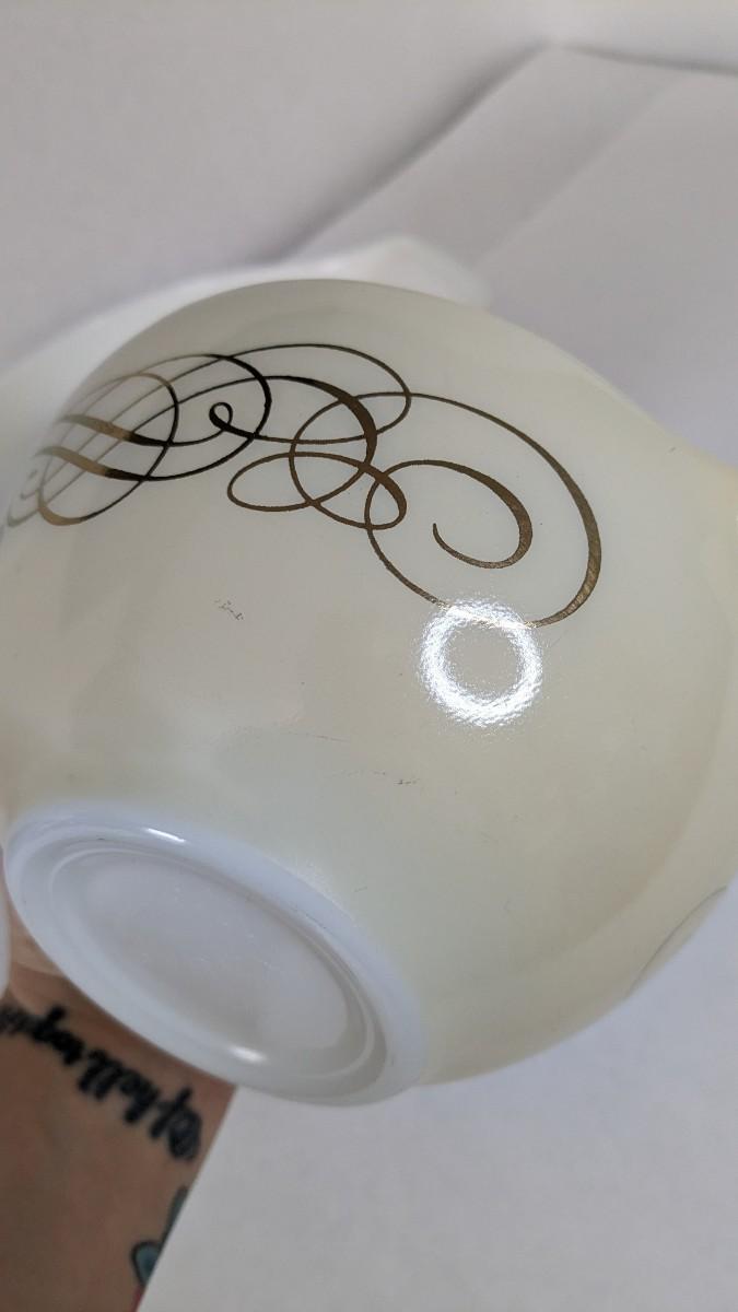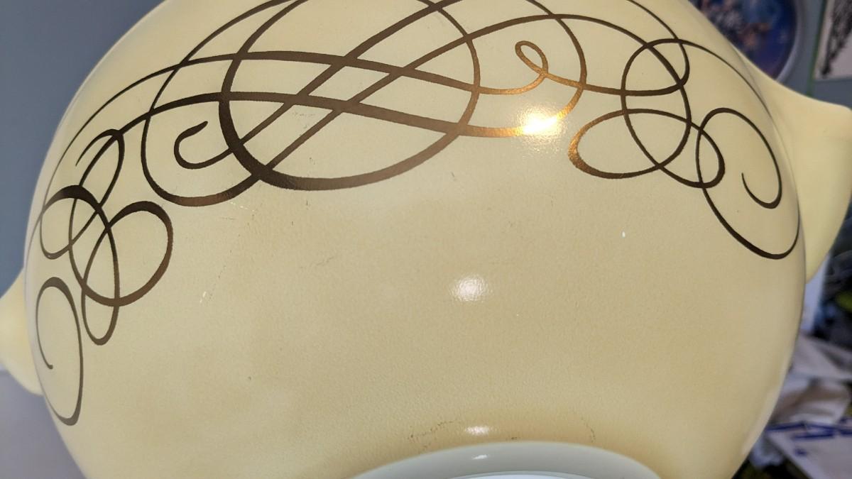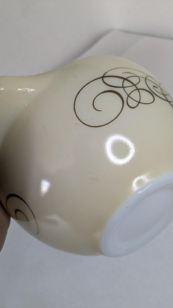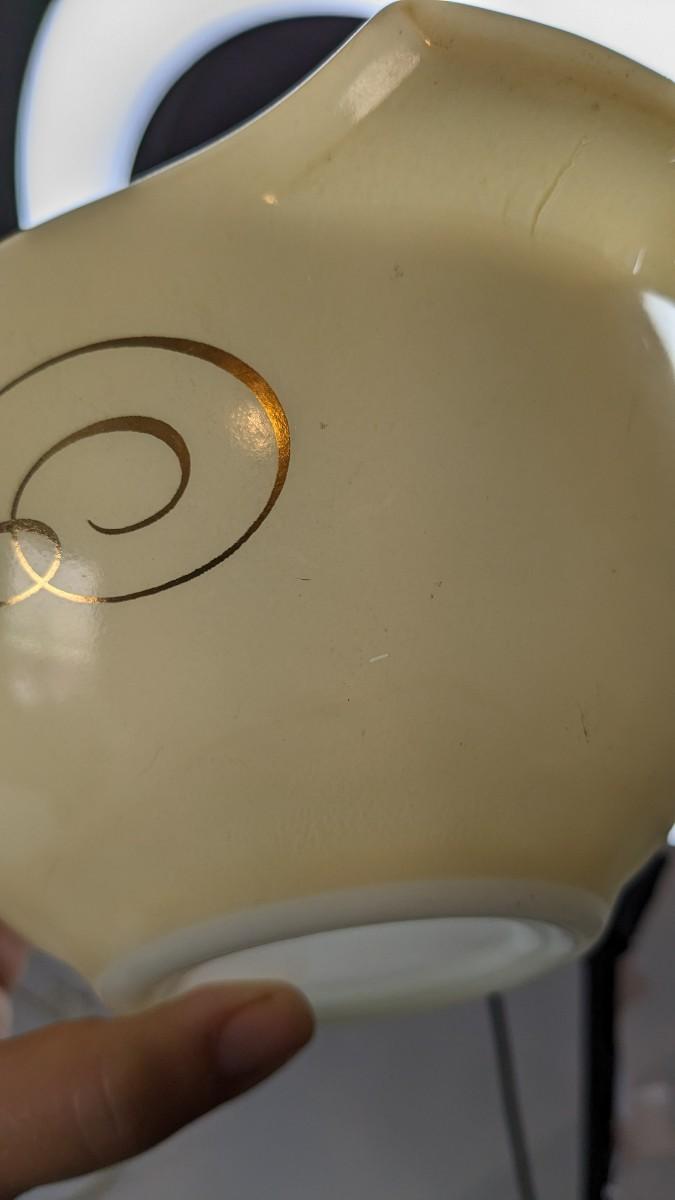 a very hard to find set you'll find this one in fantastic condition with original arm. Very light scuffs are found to exterior with a maximum of 5 flea bites per bowl. Scroll is as shiny as ever with no chips or cracks noted.