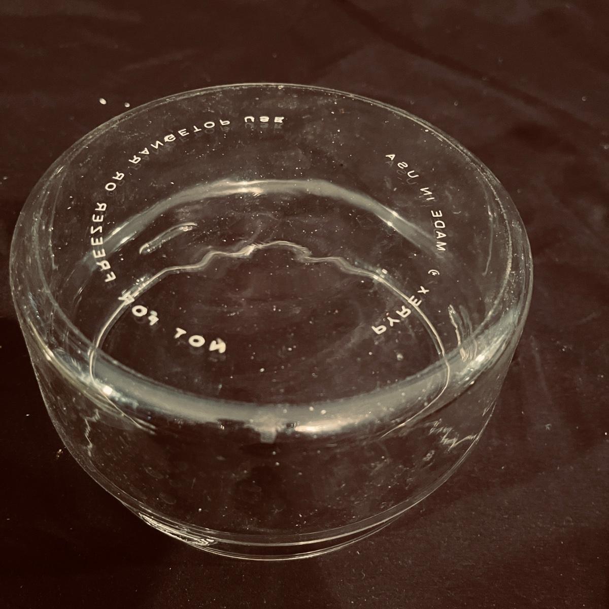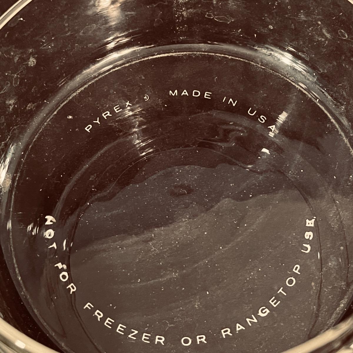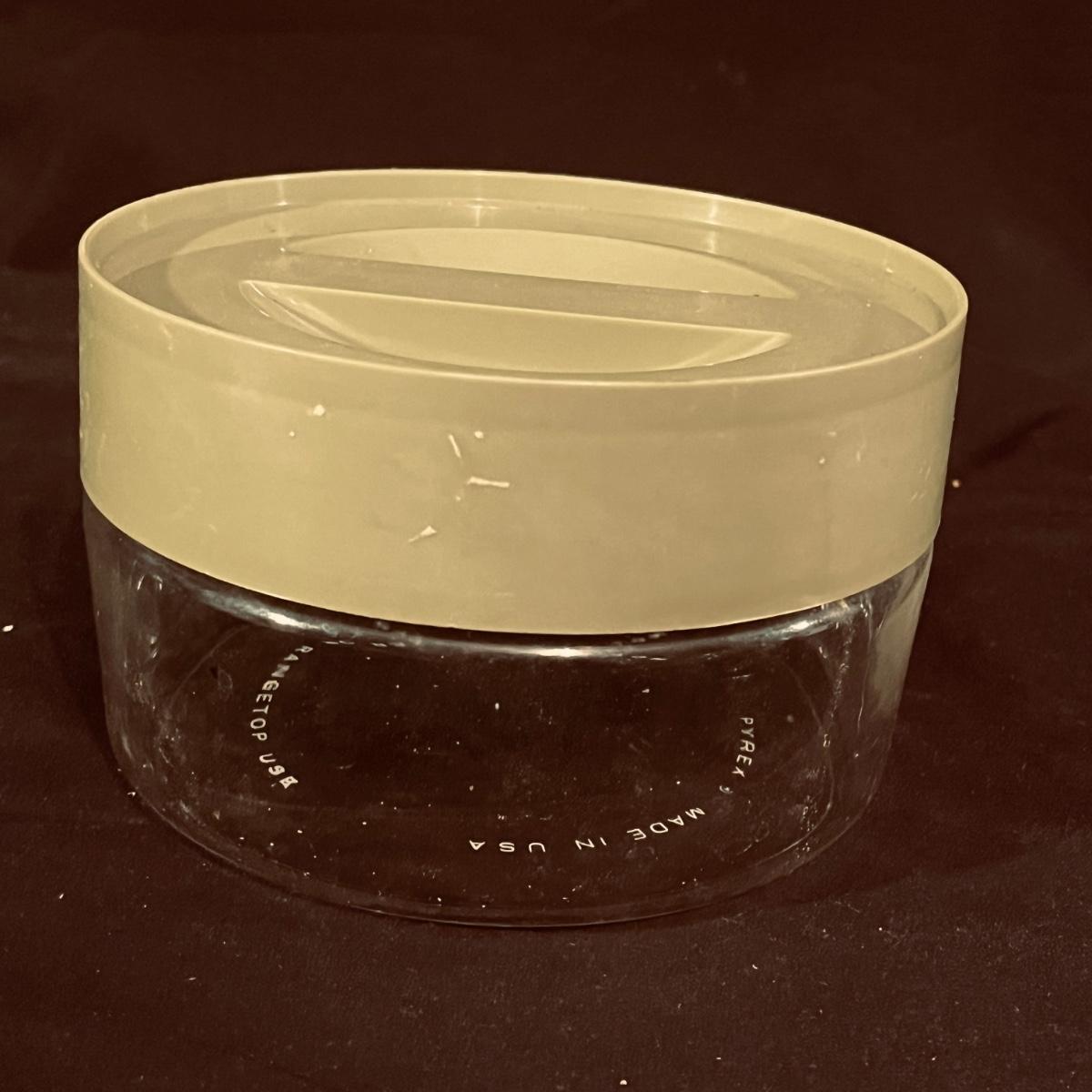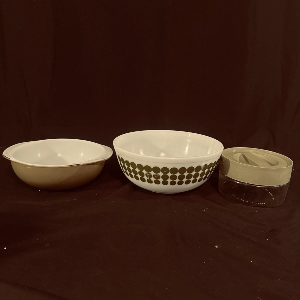 Lot includes a Pyrex mixing bowl with the dot pattern, green Pyrex bowl and a clear Pyrex jar with plastic lid. Dot bowl measures 10.5” x 4.5”H and has some scratches, see pictures.
