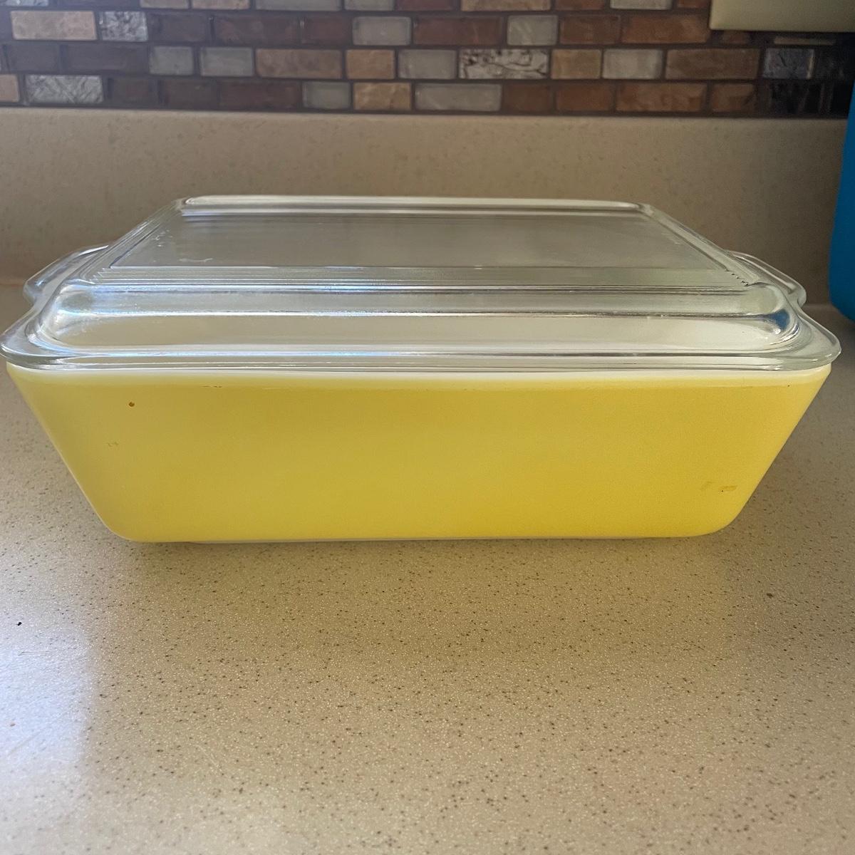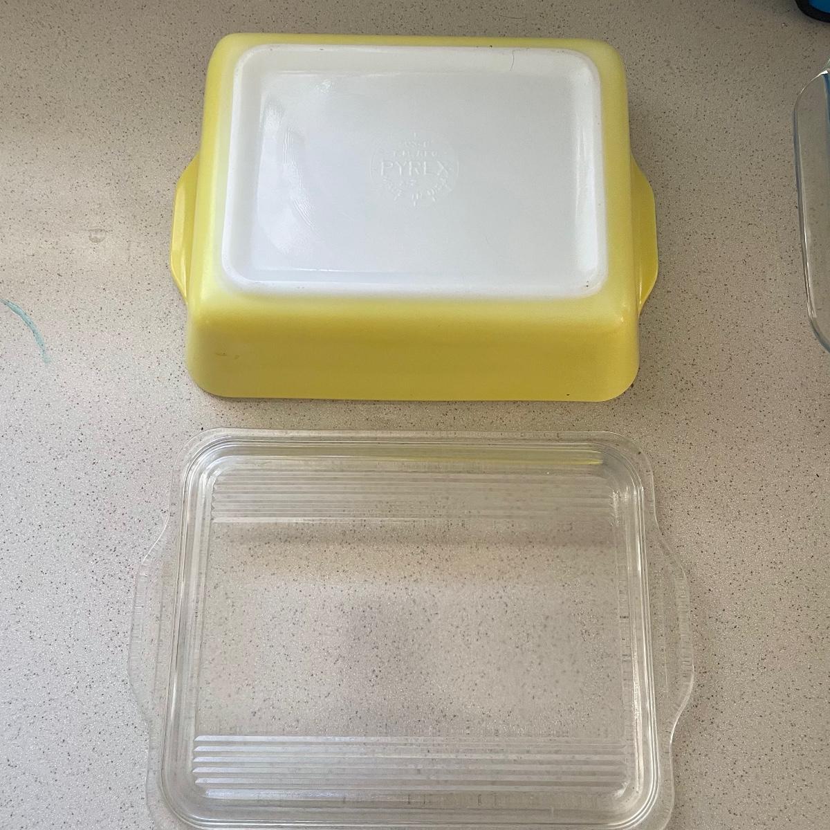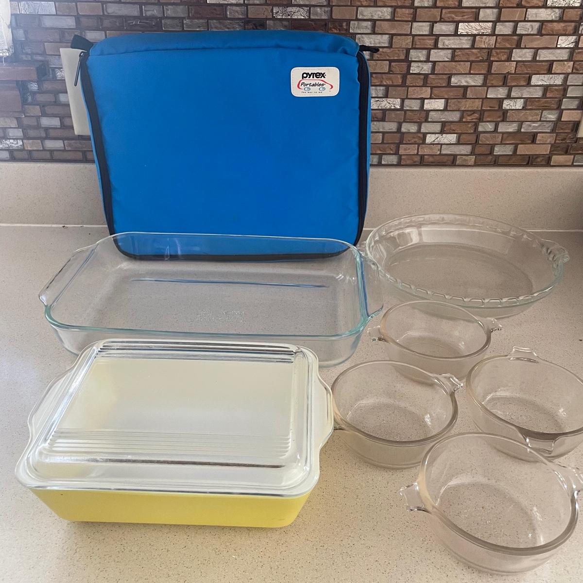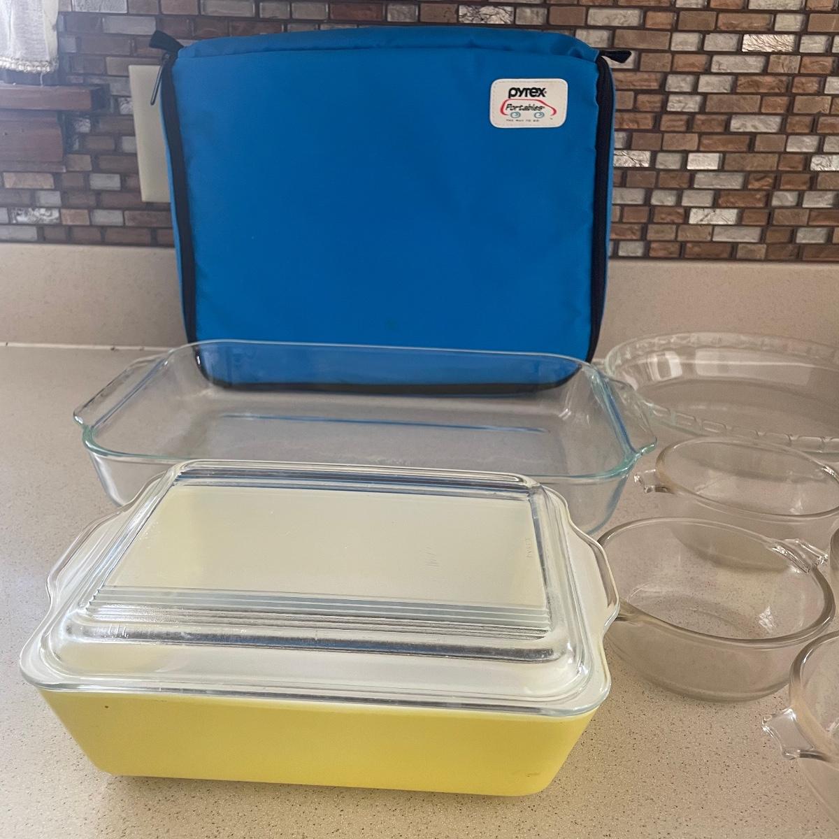 A great assortment of Pyrex pieces here that includes a vintage yellow lidded casserole dish, portable case with mid sized casserole dish and more.