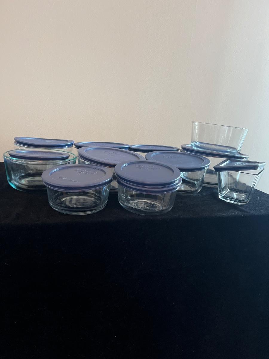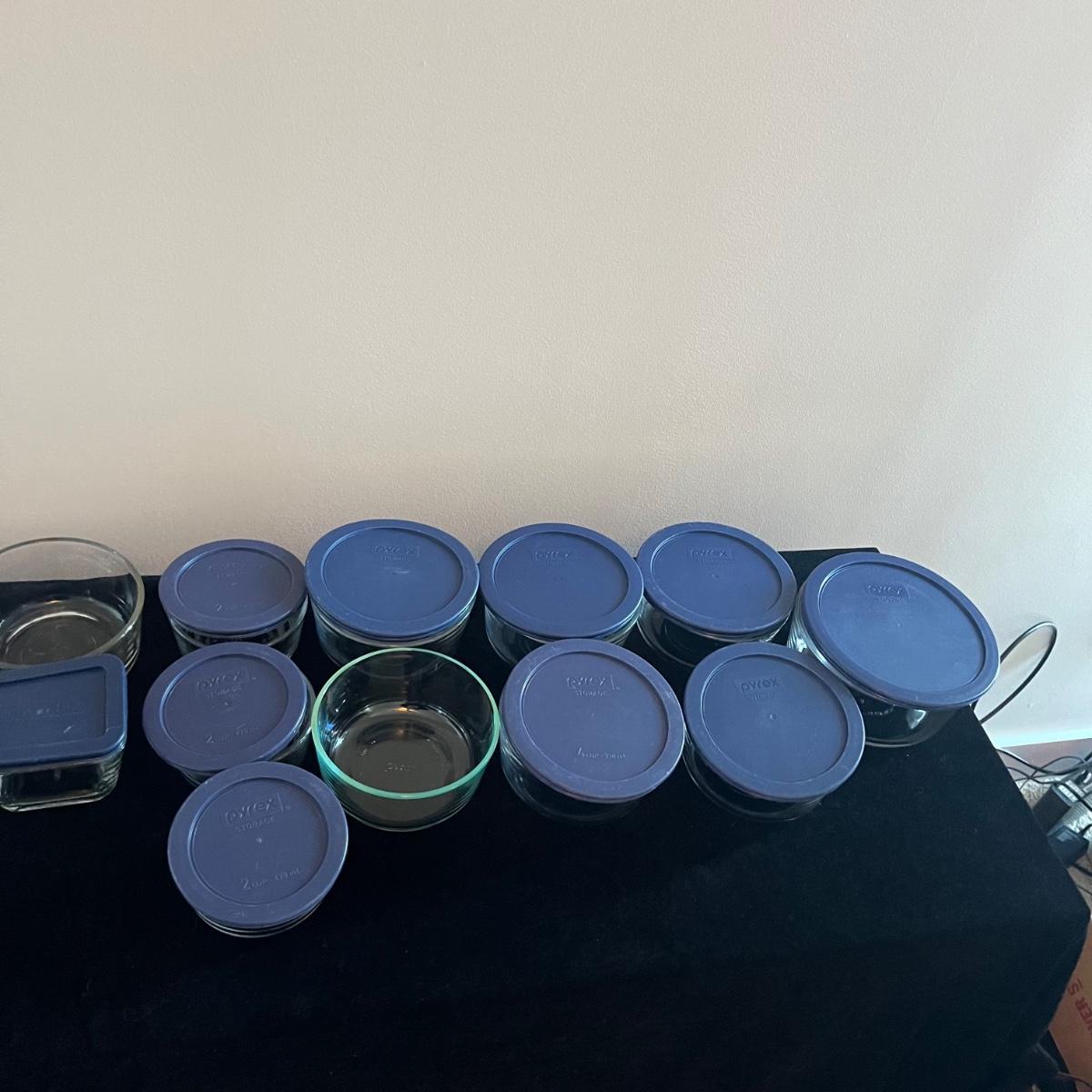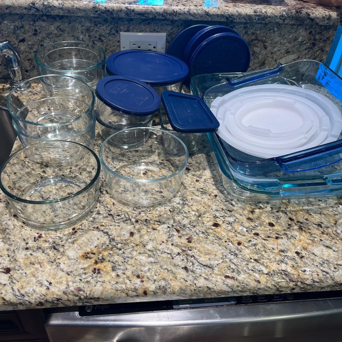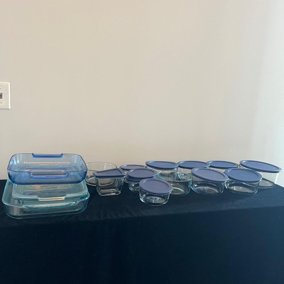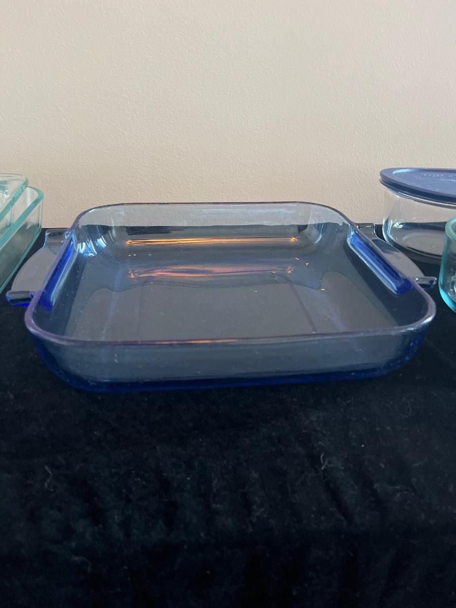 Lot includes three Pyrex casserole dishes with the largest measuring 20.5” x 17” x 2.5”. Two Anchor Hocking pieces and nine round Pyrex storage dishes and a collection of blue plastic lids.