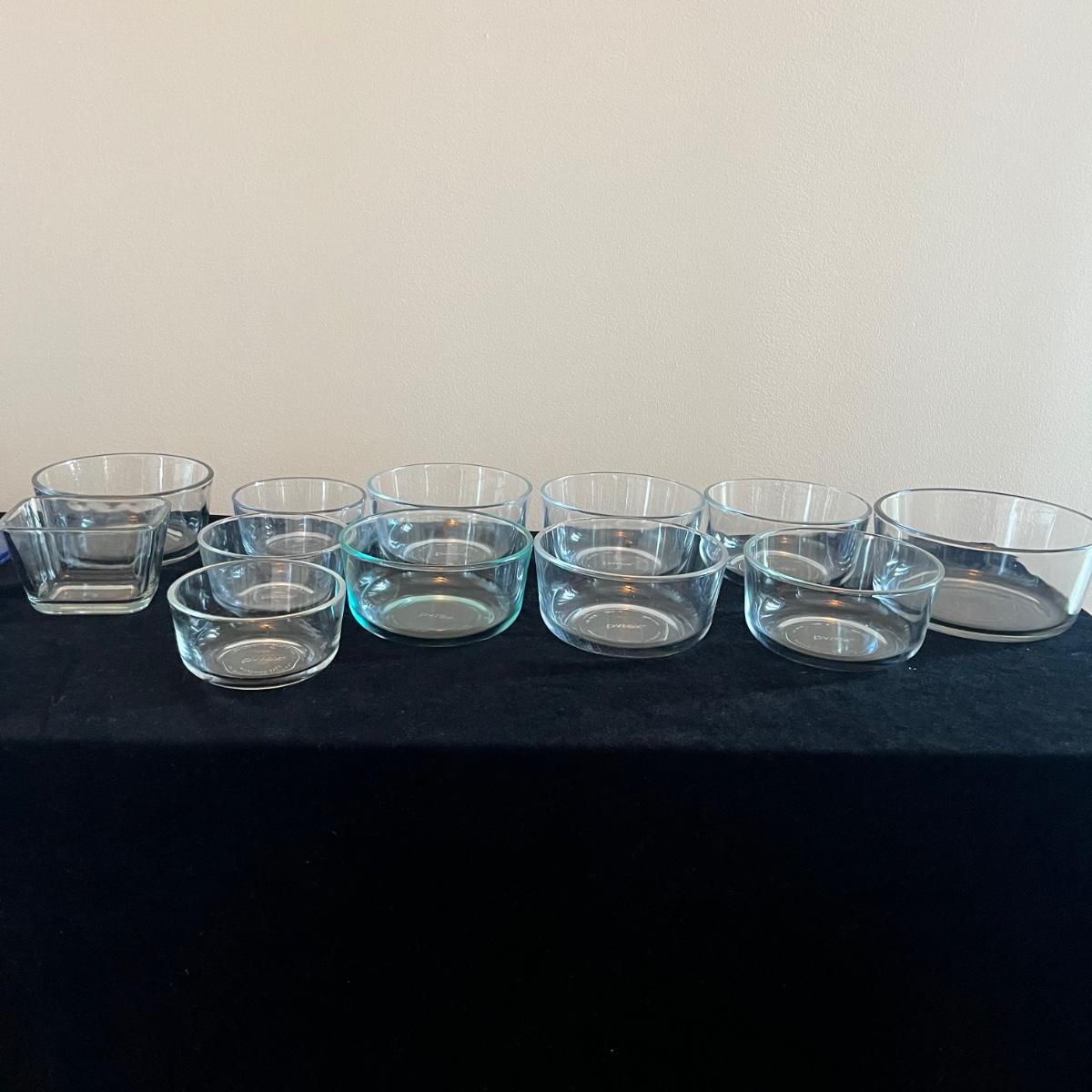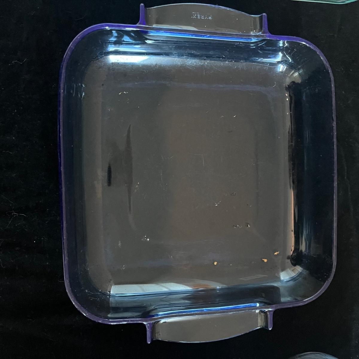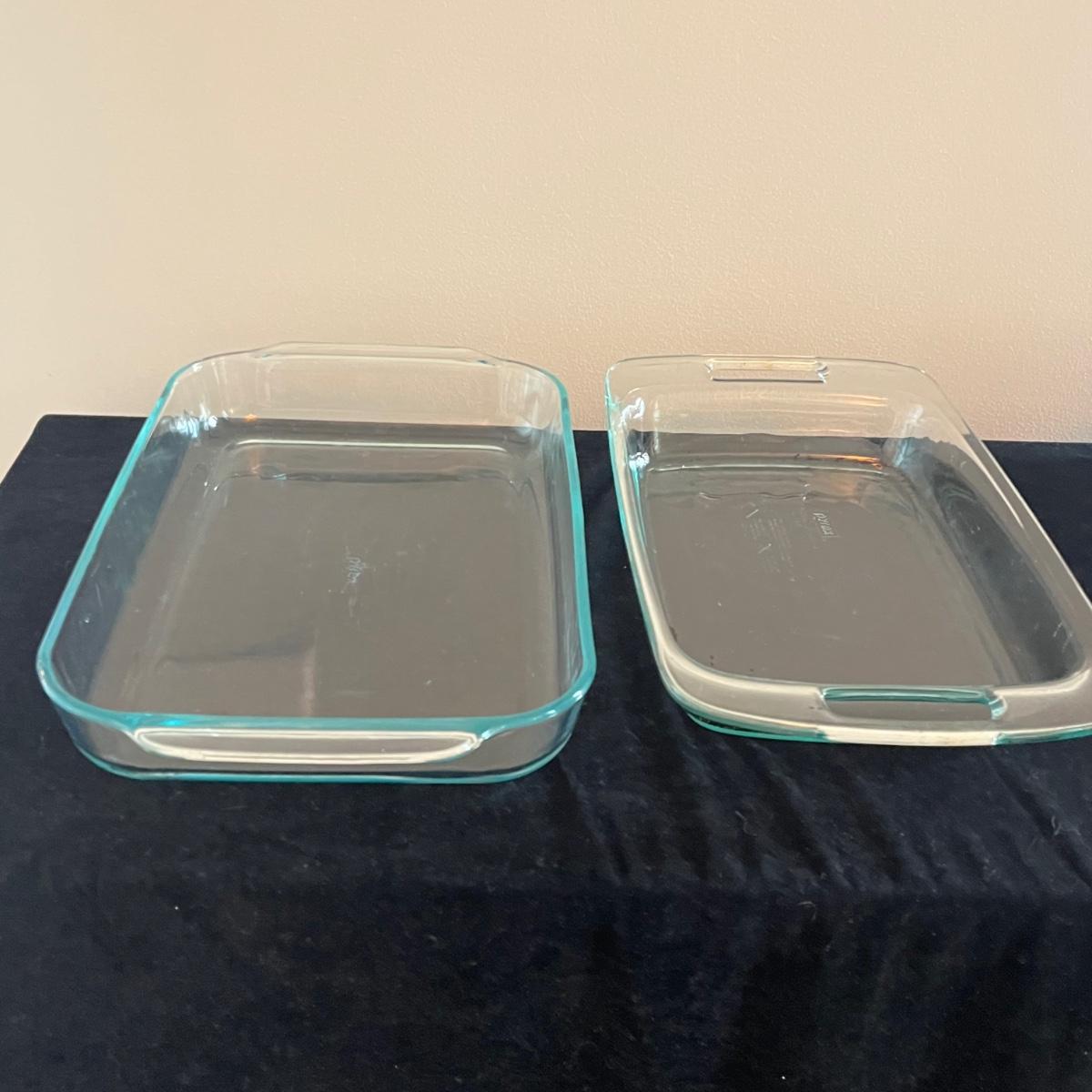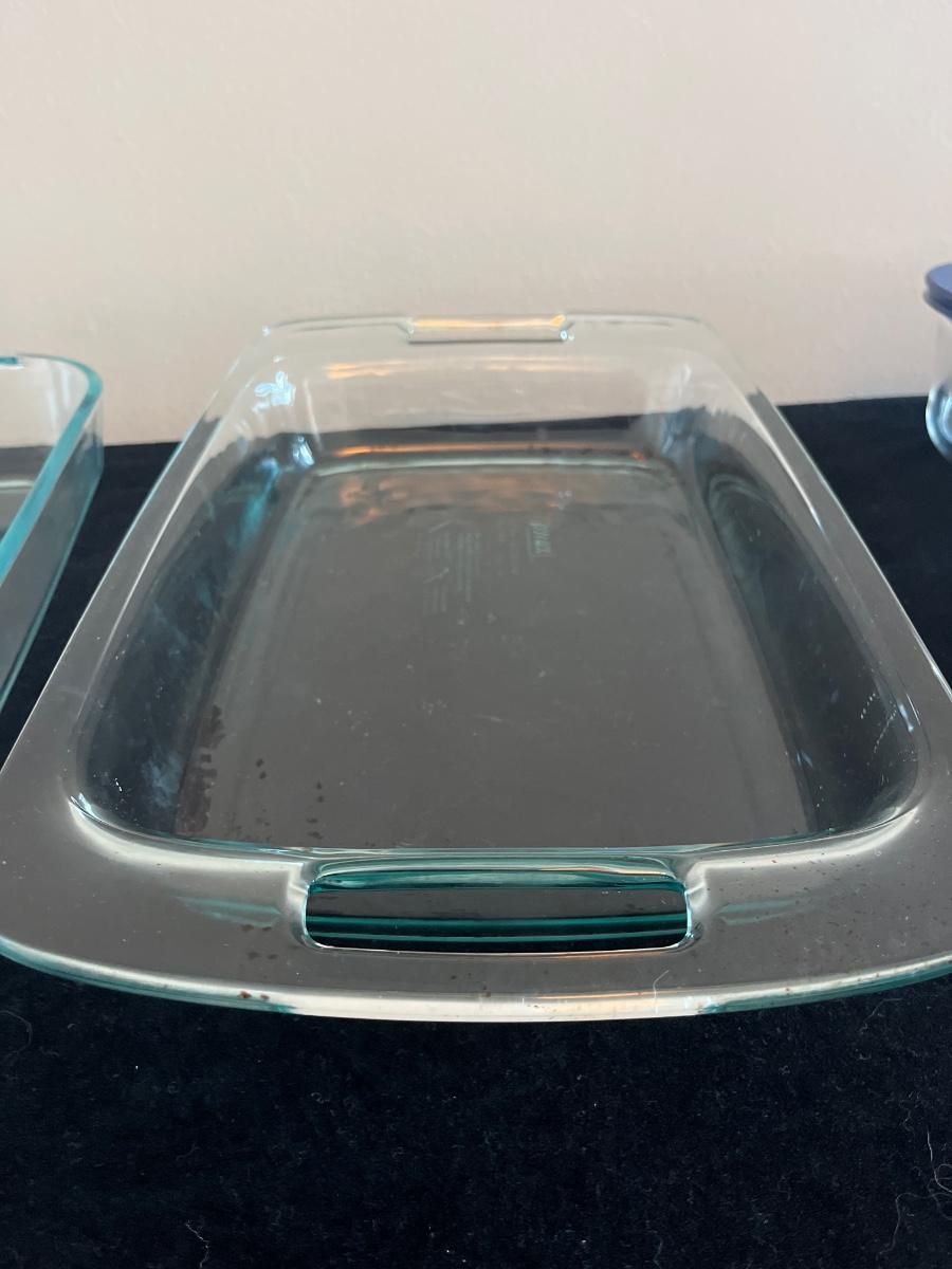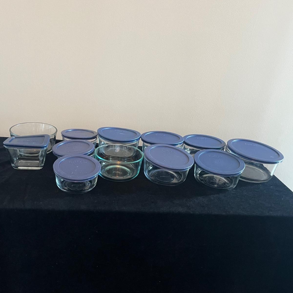 Lot includes three Pyrex casserole dishes with the largest measuring 20.5” x 17” x 2.5”. Two Anchor Hocking pieces and nine round Pyrex storage dishes and a collection of blue plastic lids.