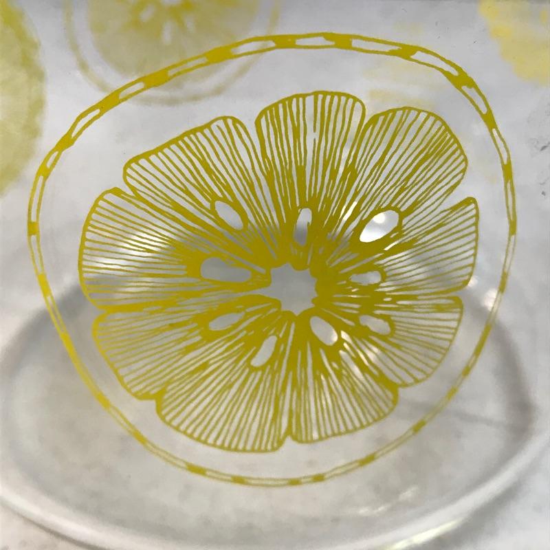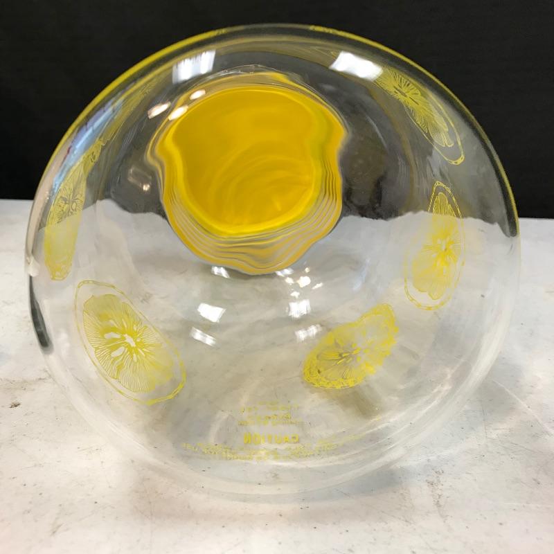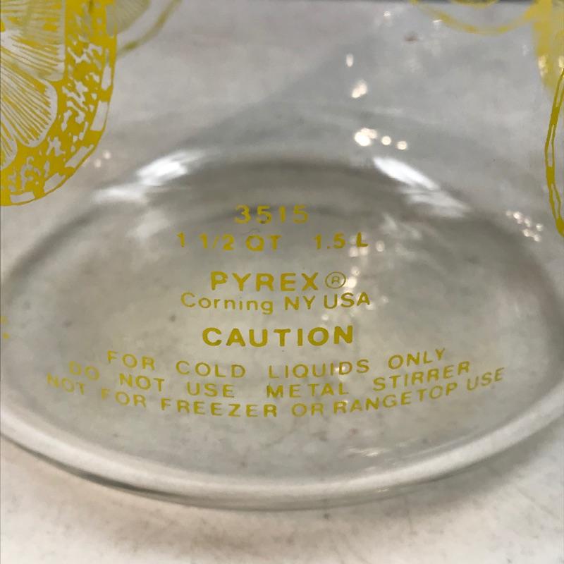 One Pyrex lemonade pitcher with your company in lit. This item is made of glass, And stands 9 inches tall.