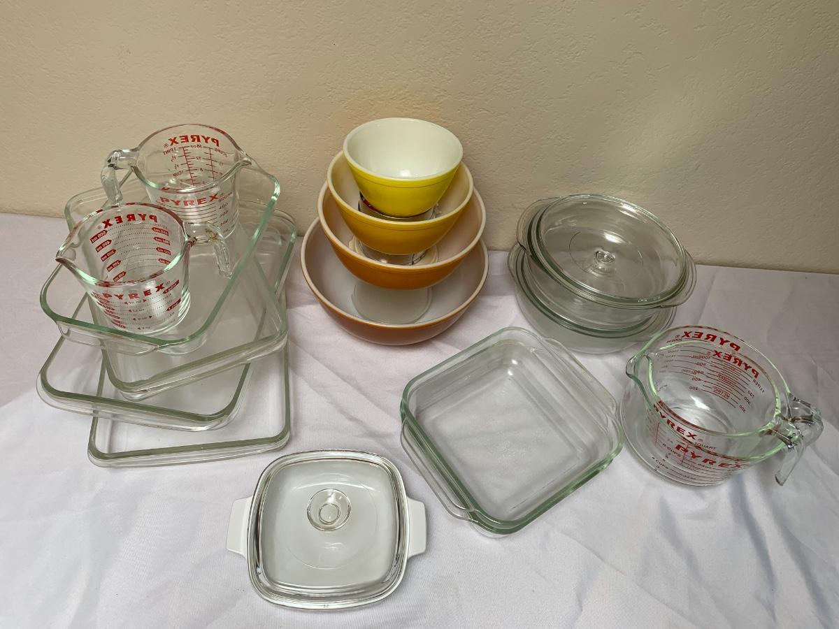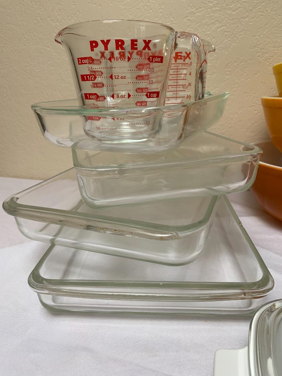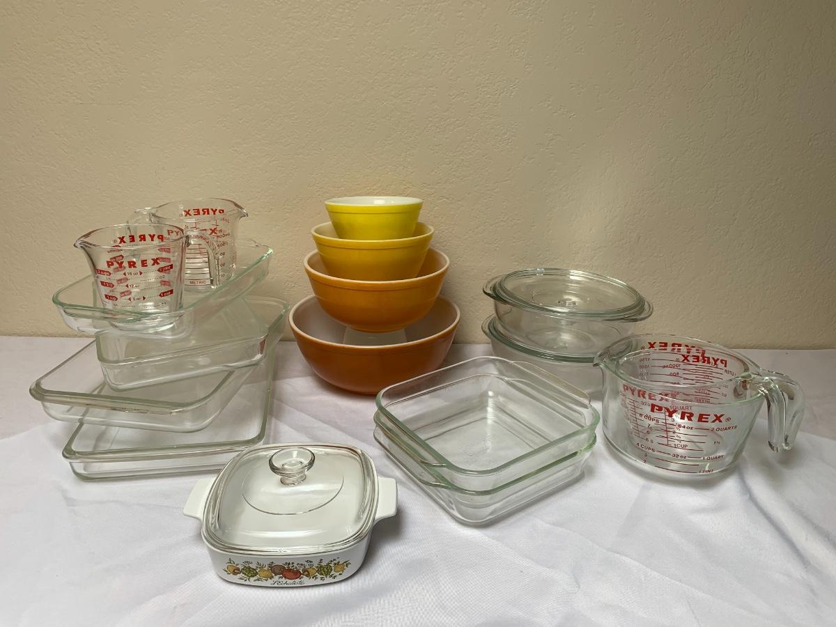Set of 4 colored Pyrex vintage bowls (401, 402, 403, 404) all have wear, no chips. Measuring cups (2 c, 2c, 4c, 8c), 2 lidded casseroles, 4 rectangle baking dishes, small corning Spice of Life casserole with lid