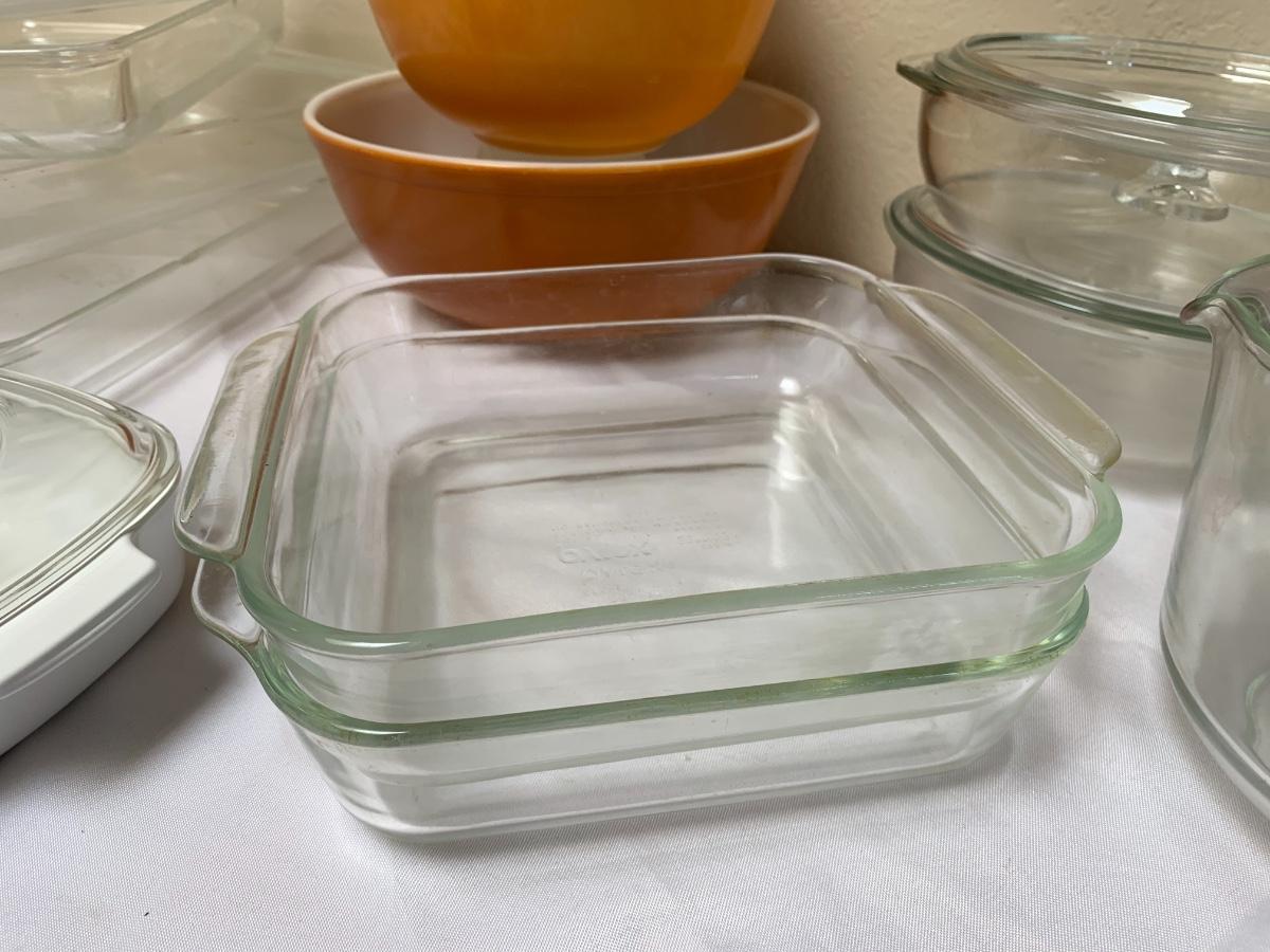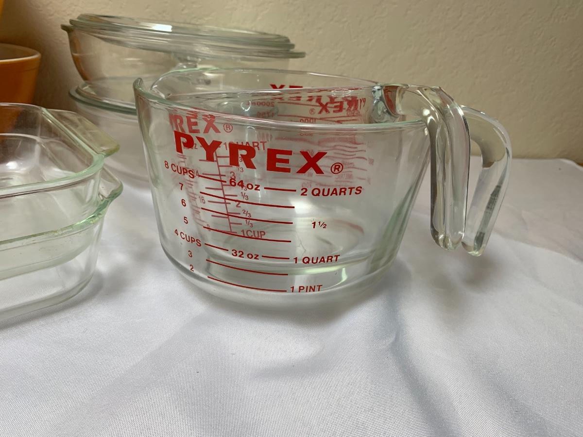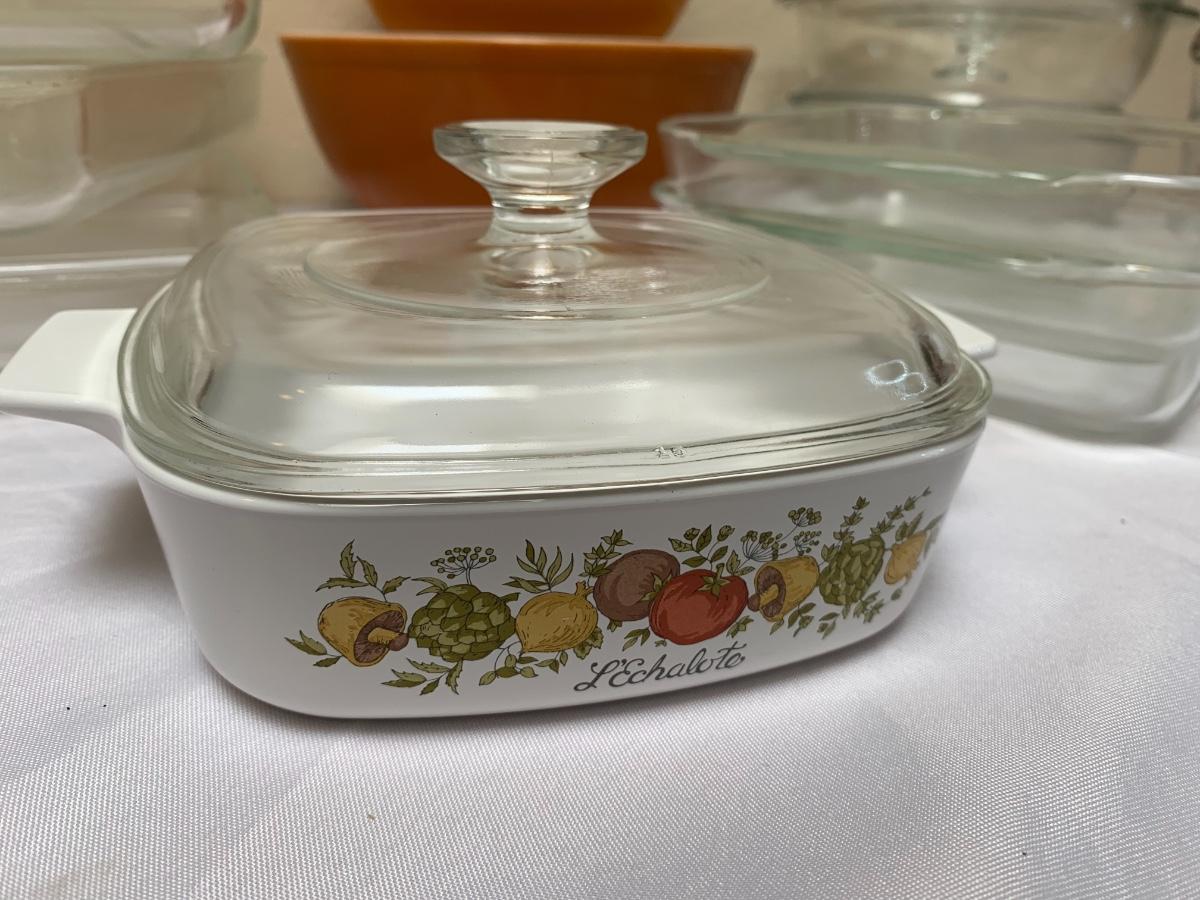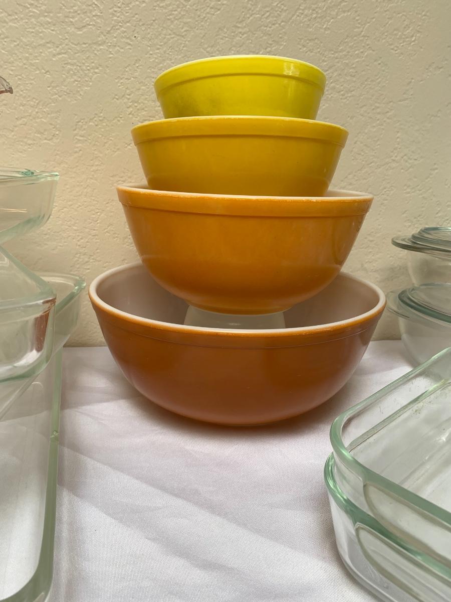 Set of 4 colored Pyrex vintage bowls (401, 402, 403, 404) all have wear, no chips. Measuring cups (2 c, 2c, 4c, 8c), 2 lidded casseroles, 4 rectangle baking dishes, small corning Spice of Life casserole with lid