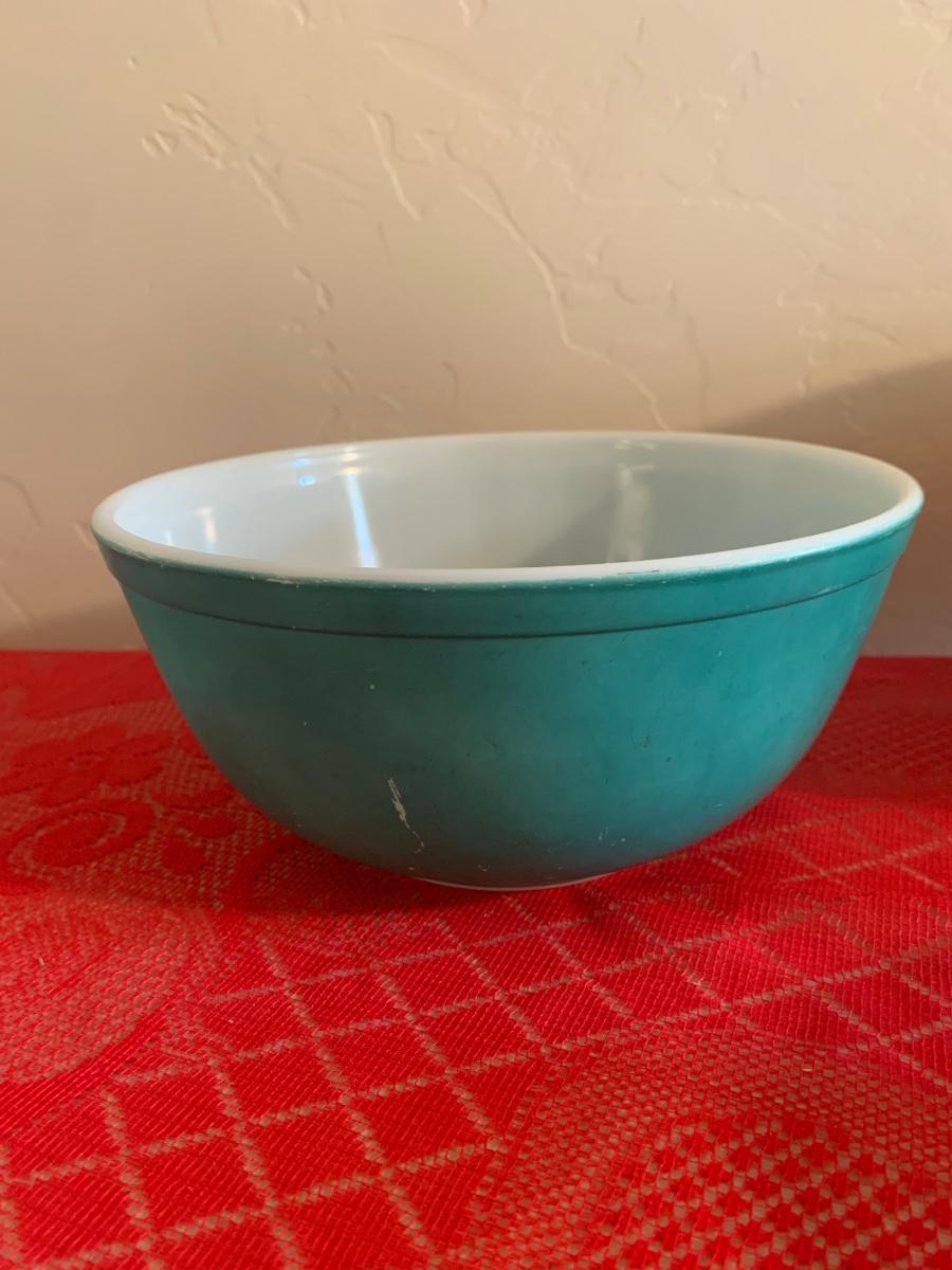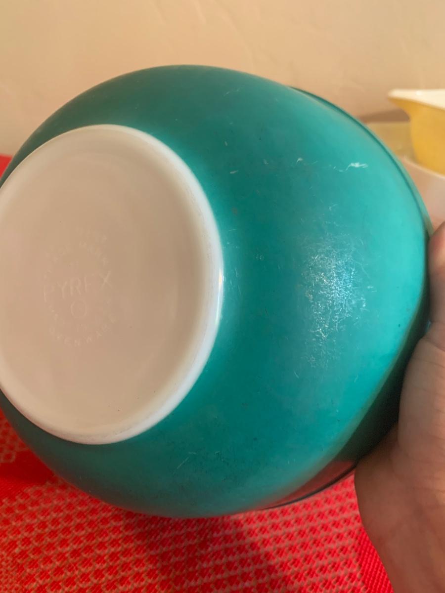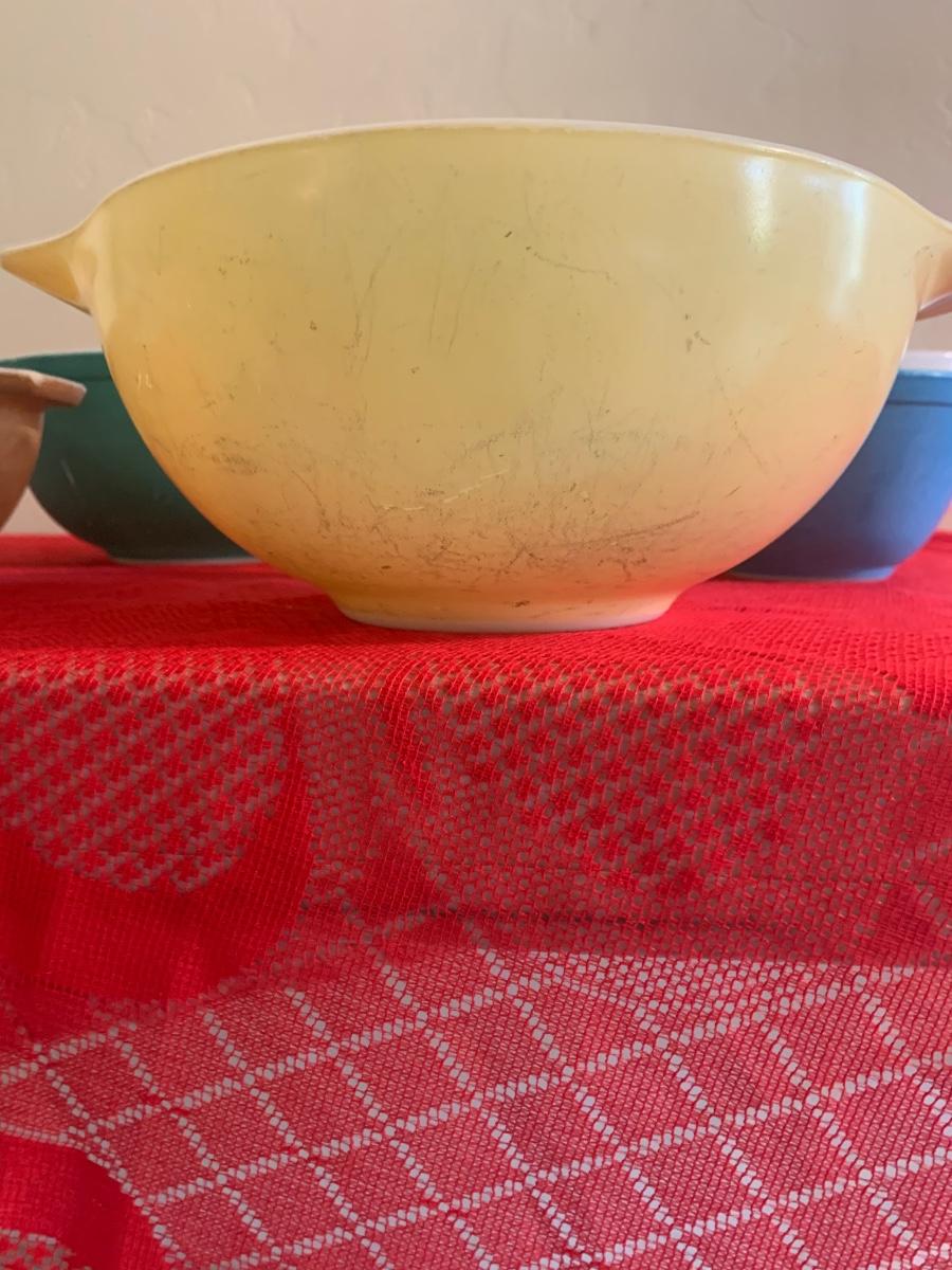 Green and blue from primary bowl set, smalll brown Cinderella bowl, medium size Cinderella bowl #44 of town and Country . Largest is in good condition but rest have fading and wear