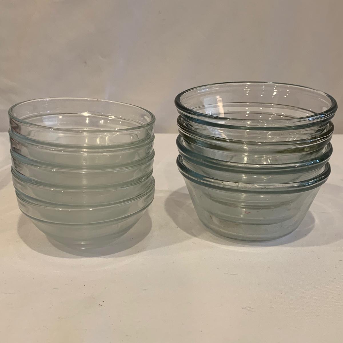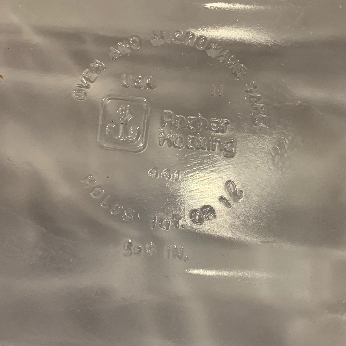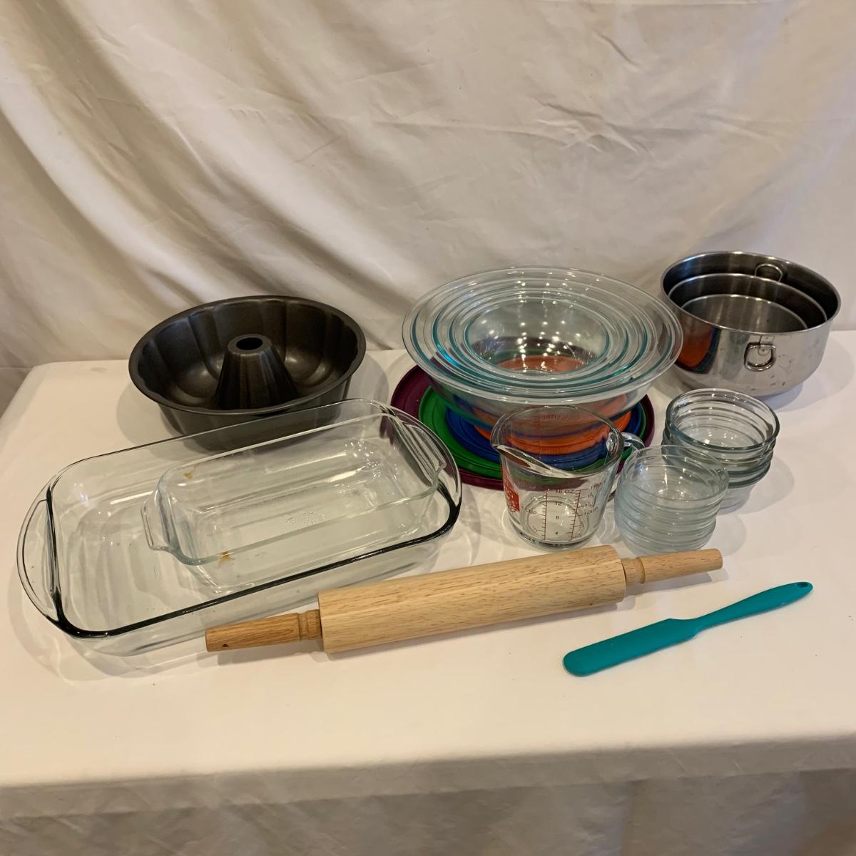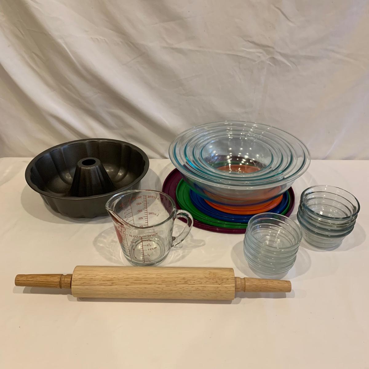 Included in this collection of baking supplies are: a set of four nesting Pyrex mixing bowls with colorful lids, four 6 oz. Anchor Hocking dishes, five small glass bowls, an Anchor Hocking measuring cup, a wooden rolling pin, two glass baking dishes, three metal mixing bowls, a silicone spatula, and a metal Bundt cake pan.