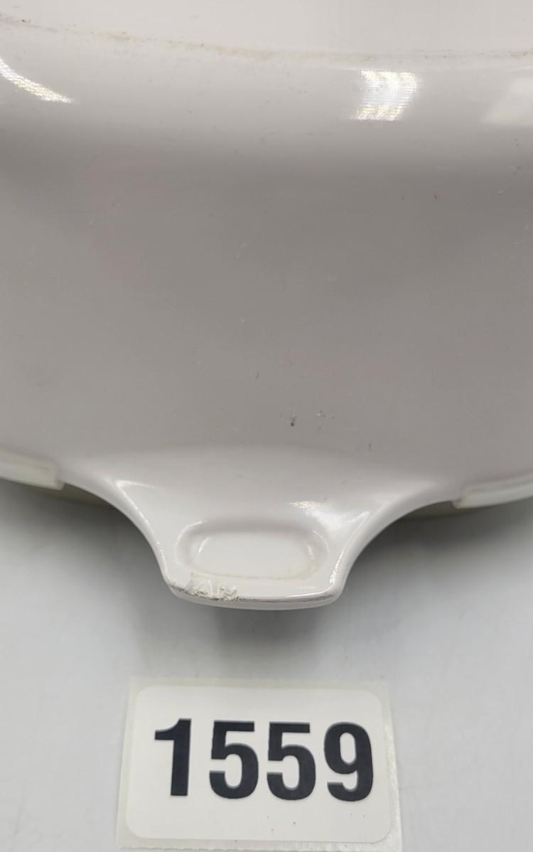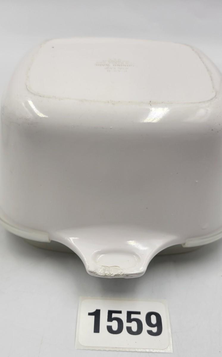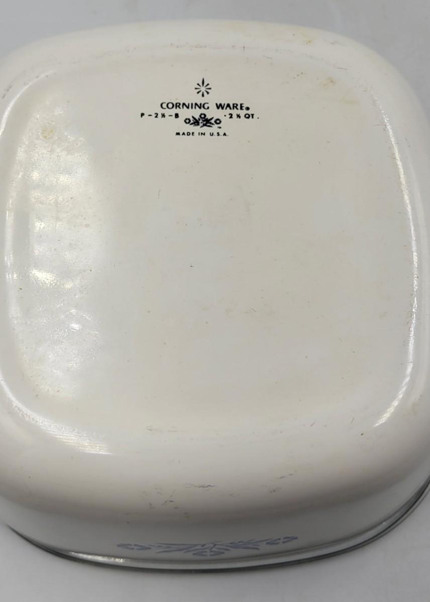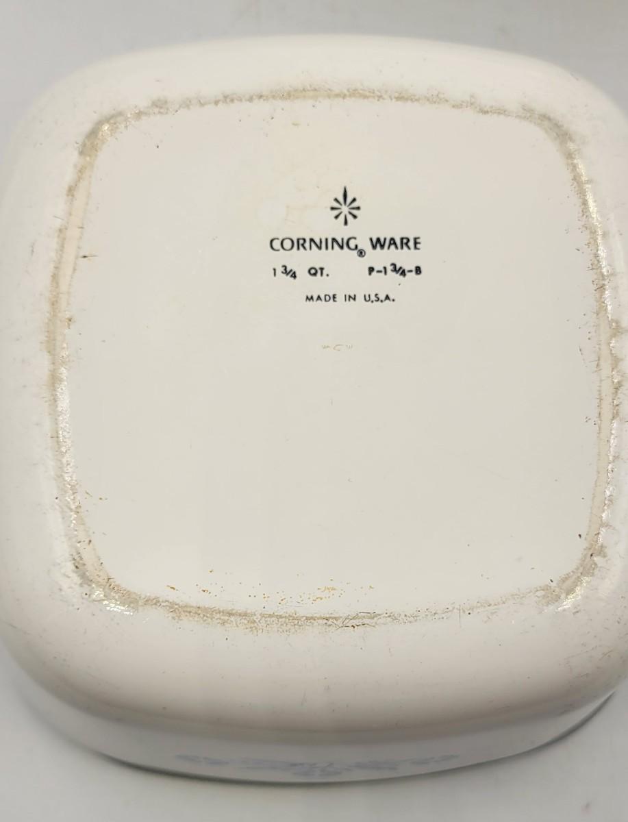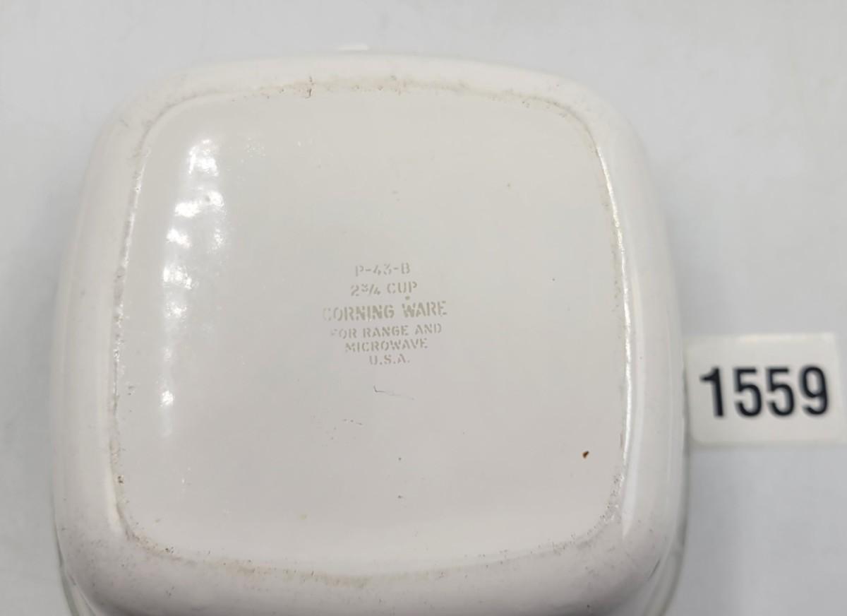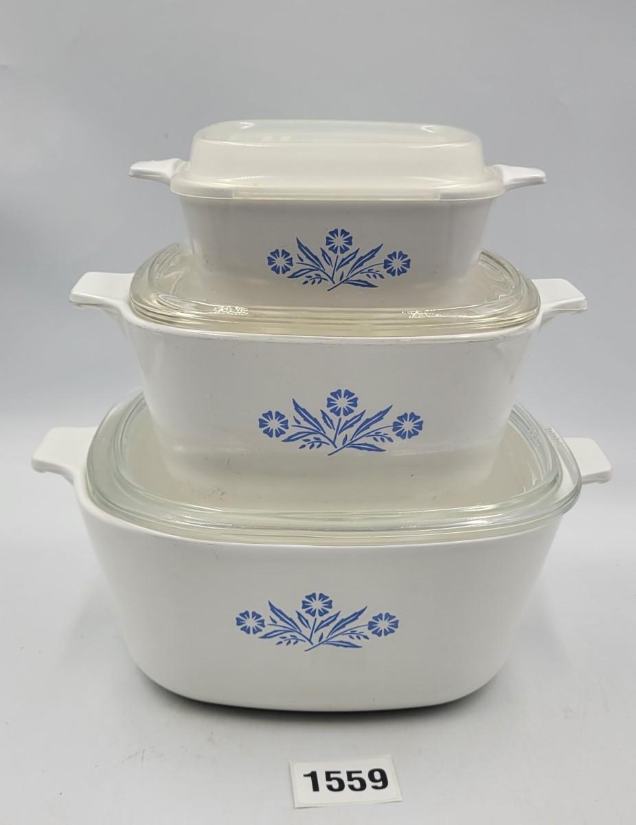 Small chips Shown on the handles (underside) of the 2 3/4C dish. The other two dishes are without chips. No cracks, or breaks shown.