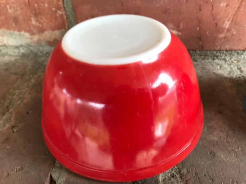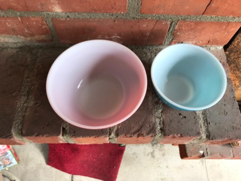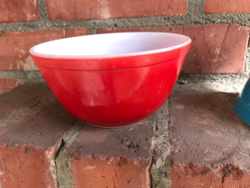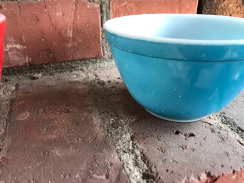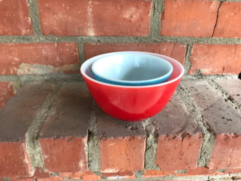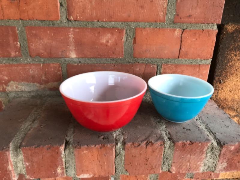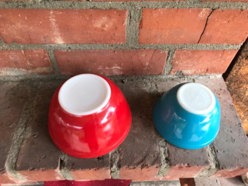 Set of 2 primary color Pyrex mixing bowls. 2 smallest bowls of the set, Red and Blue. Very little wear.