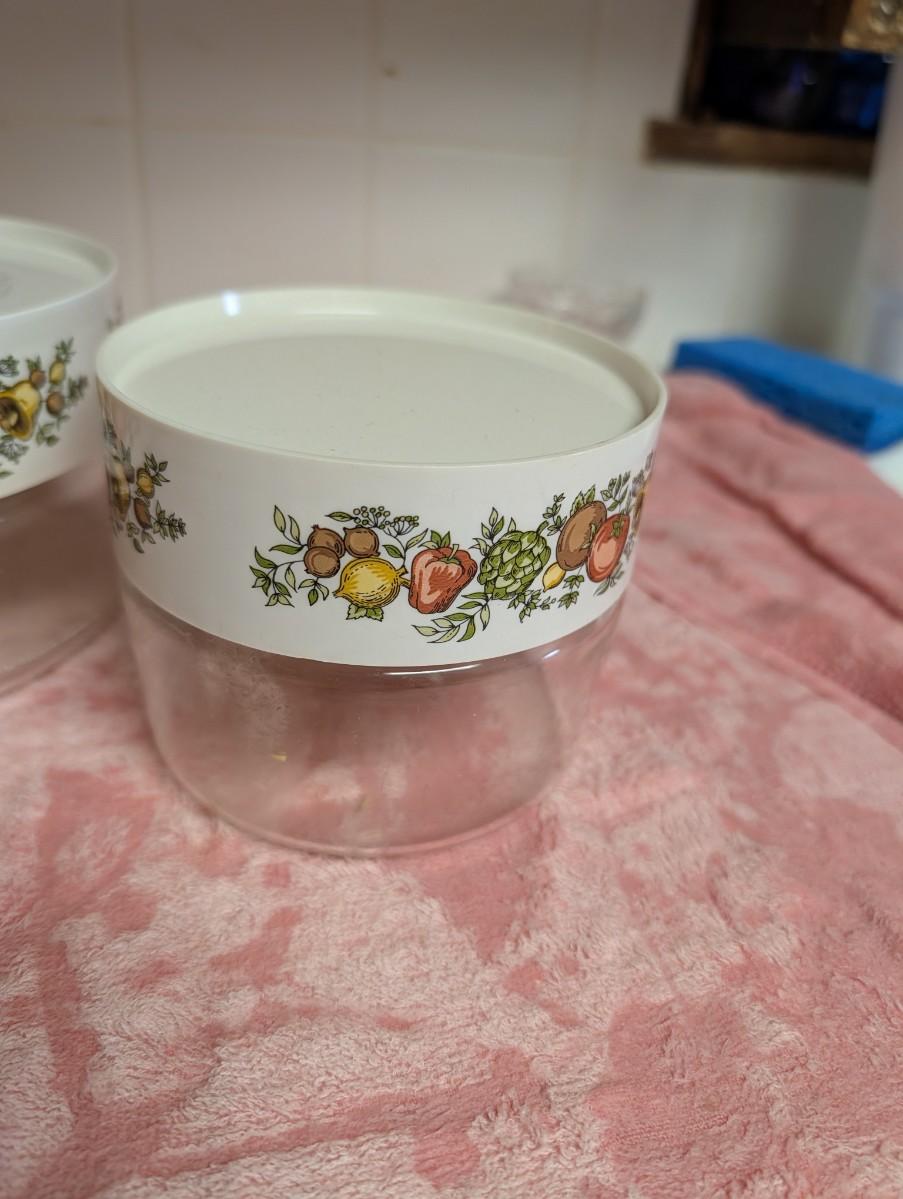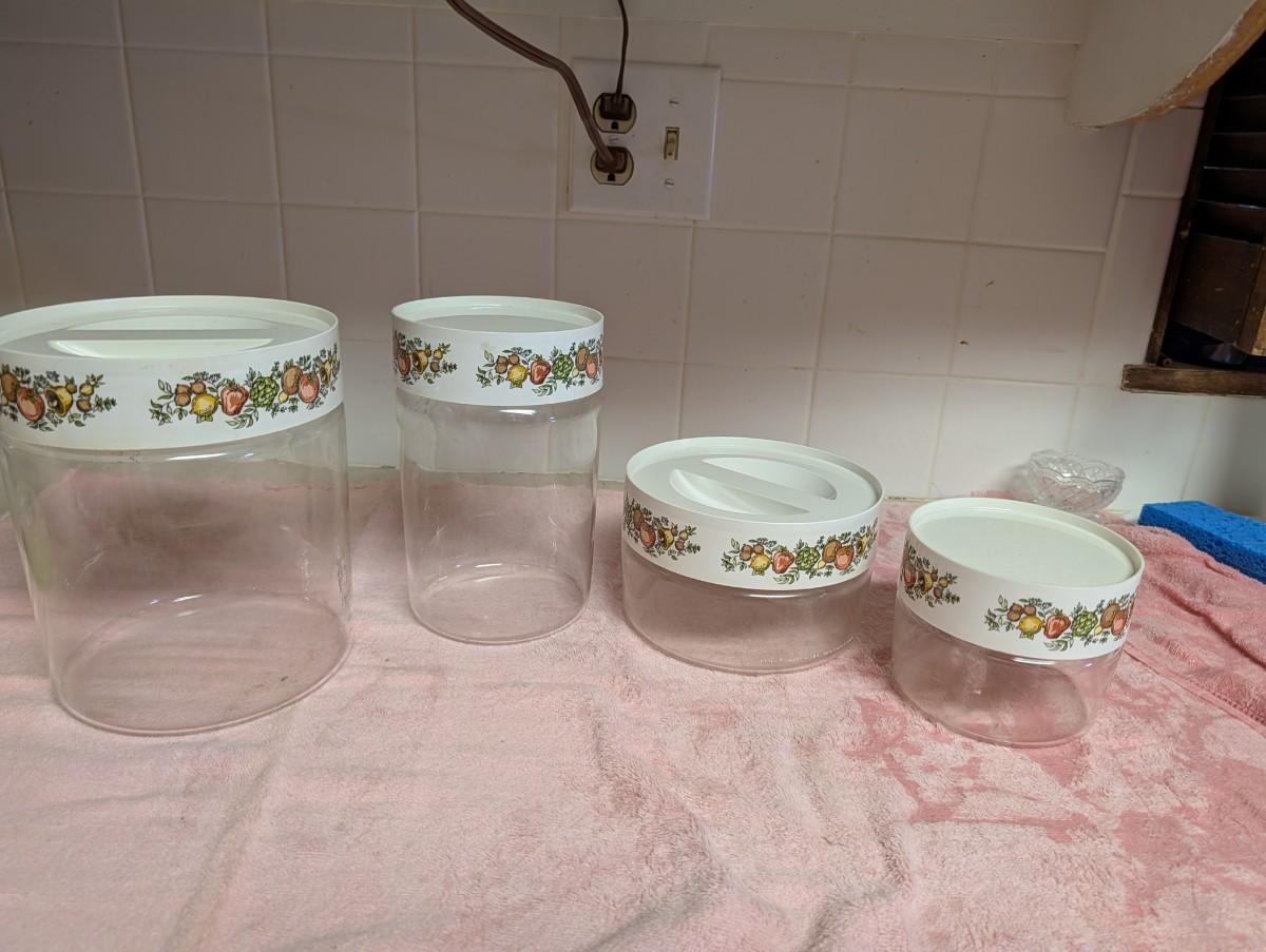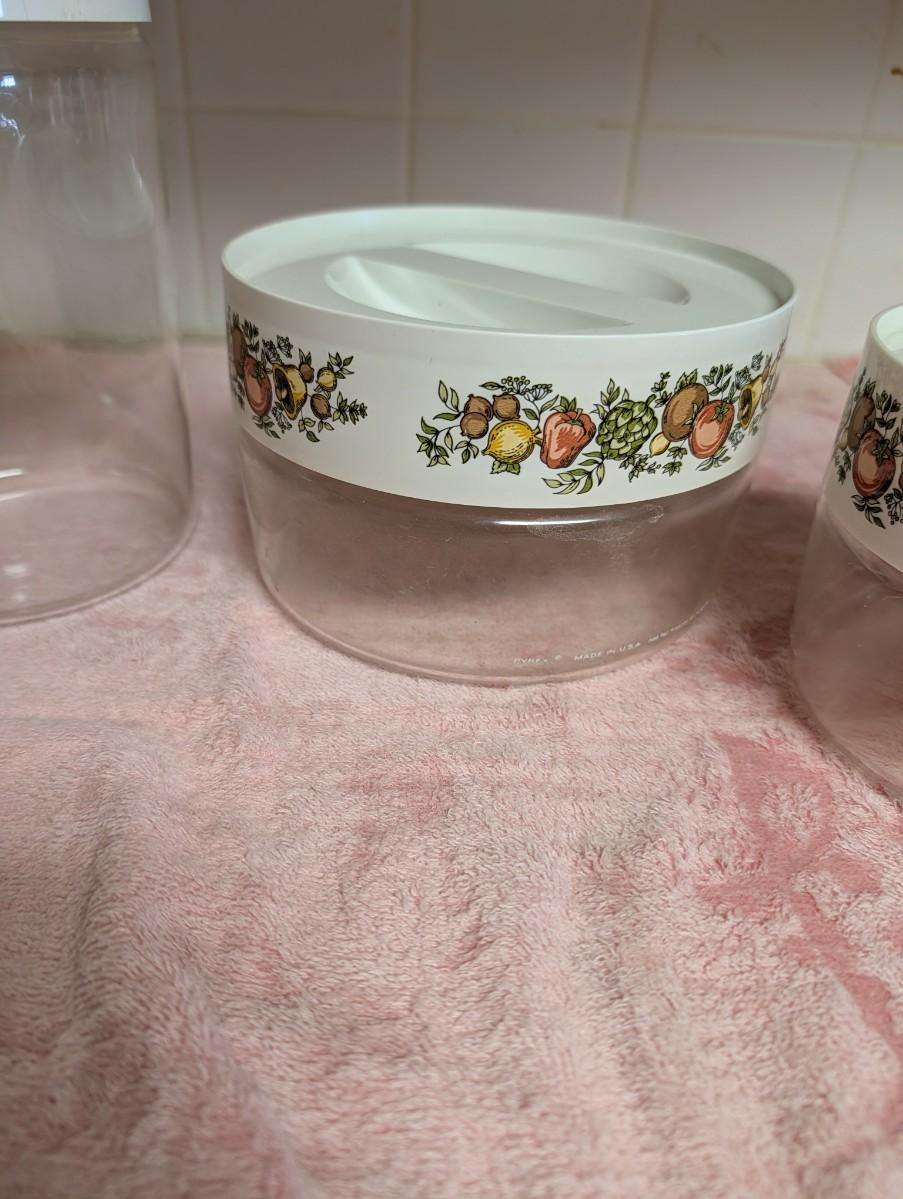 PYREX ware, glass screw on lids. Can be used as canister set.